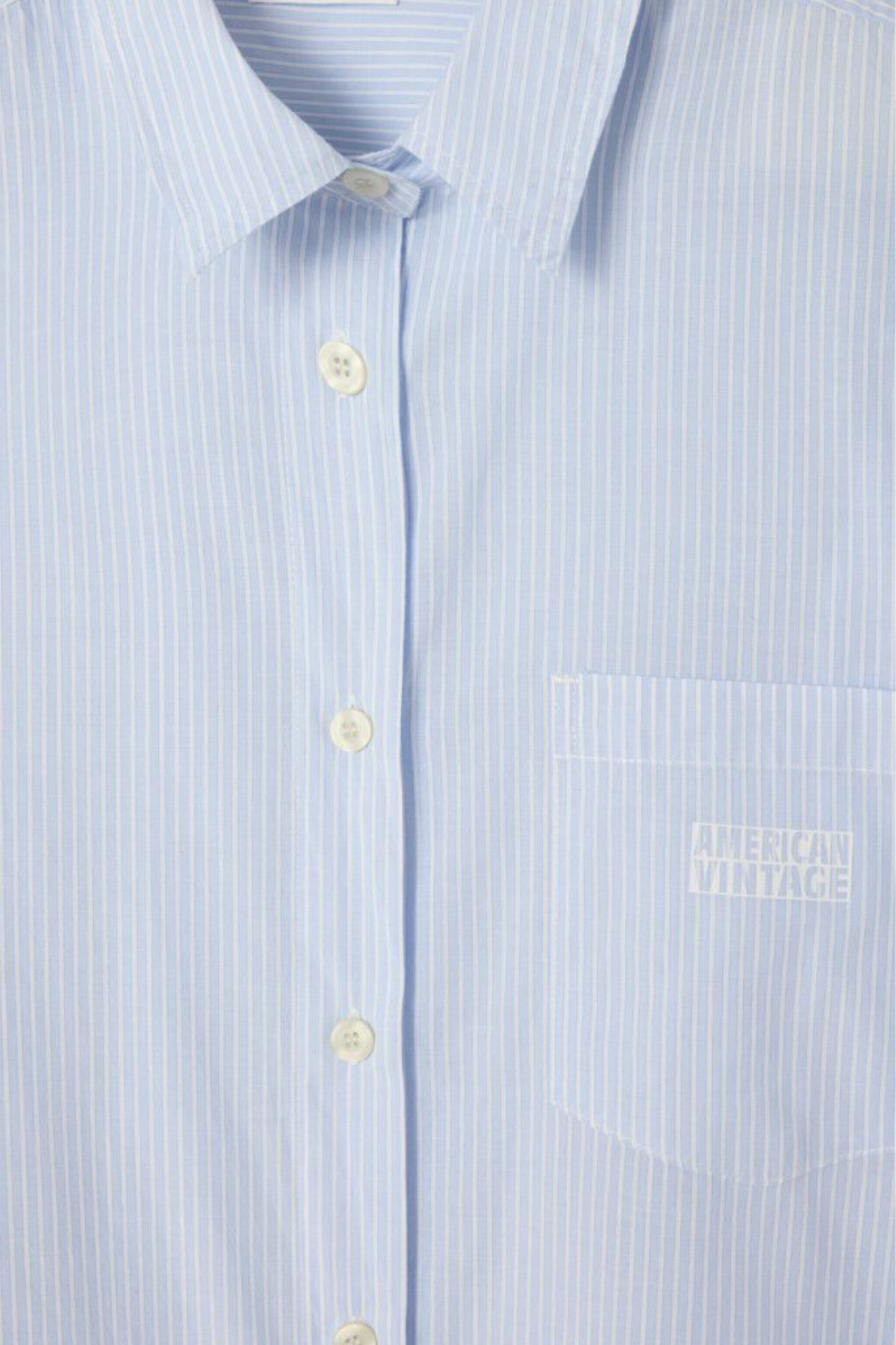 De Eluabird Blouse Shirt van American Vintage in Blue Stripe is een oversized blouse met een klassieke kraag en een streepprint. Het model heeft lange mouwen, een knoopsluiting aan de voorzijde en een borstzakje met logo-opdruk. De luchtige katoenen stof zorgt voor een comfortabele en casual uitstraling.