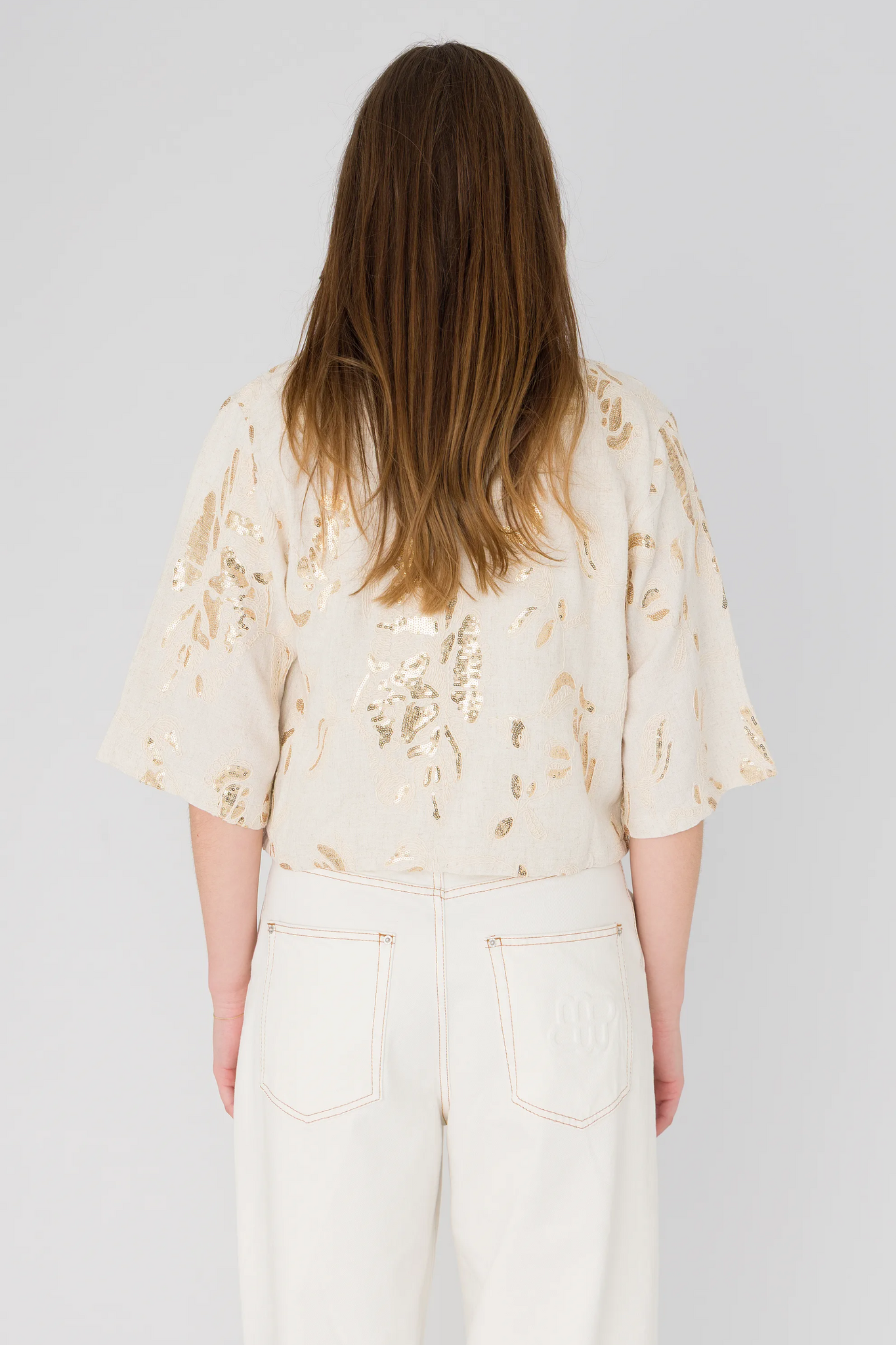 De Cream Solid Blouse van Anna is een losvallend model met 3/4 mouwen en een ceintuur in de taille voor een subtiel ballon-effect. De blouse is afgewerkt met gouden pailletten en abstracte bloemenstiksel voor een stijlvolle, feestelijke touch. Perfect te combineren met een linnen vestje of een broek voor een elegante look.