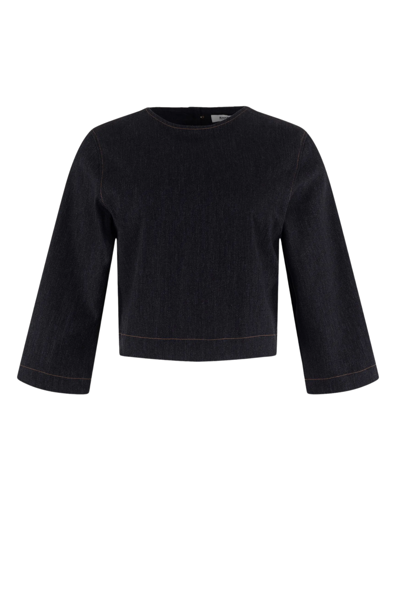 De Blouse van Anna in Off Black is een blouse van stevige katoenmix met een subtiele stretch voor hoog draagcomfort. Het item heeft een ronde hals, driekwart mouwen en een korter model. Dankzij de bijzondere dubbele draagwijze kan de knoopsluiting zowel aan de voor- als achterkant gedragen worden. De zichtbare stiksels geven een subtiel accent en de blouse is eenvoudig te combineren met een bijpassende broek.