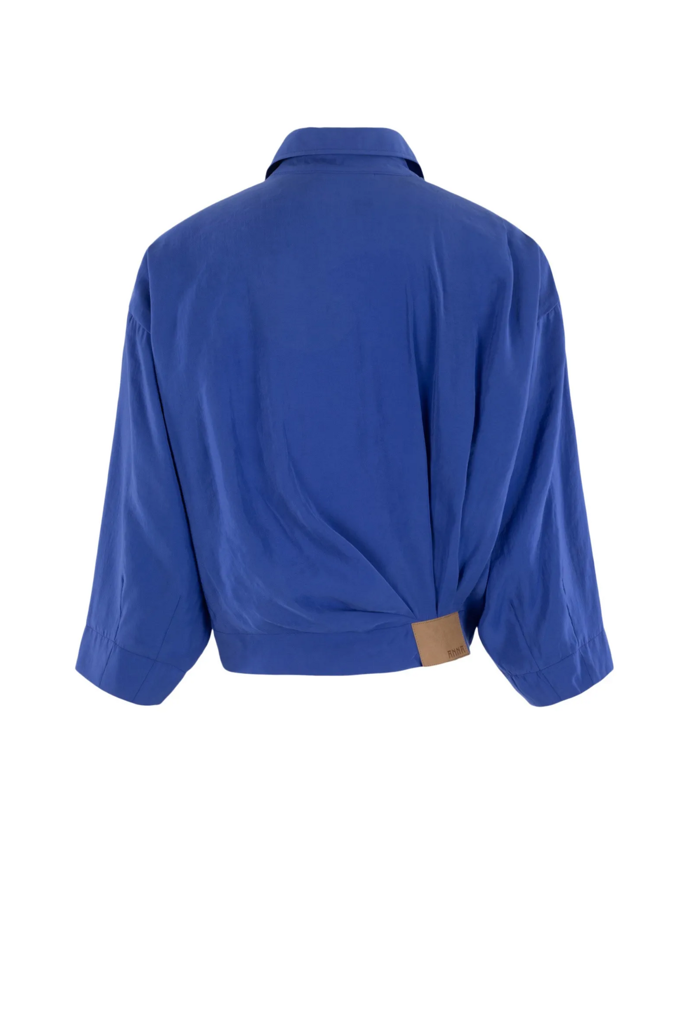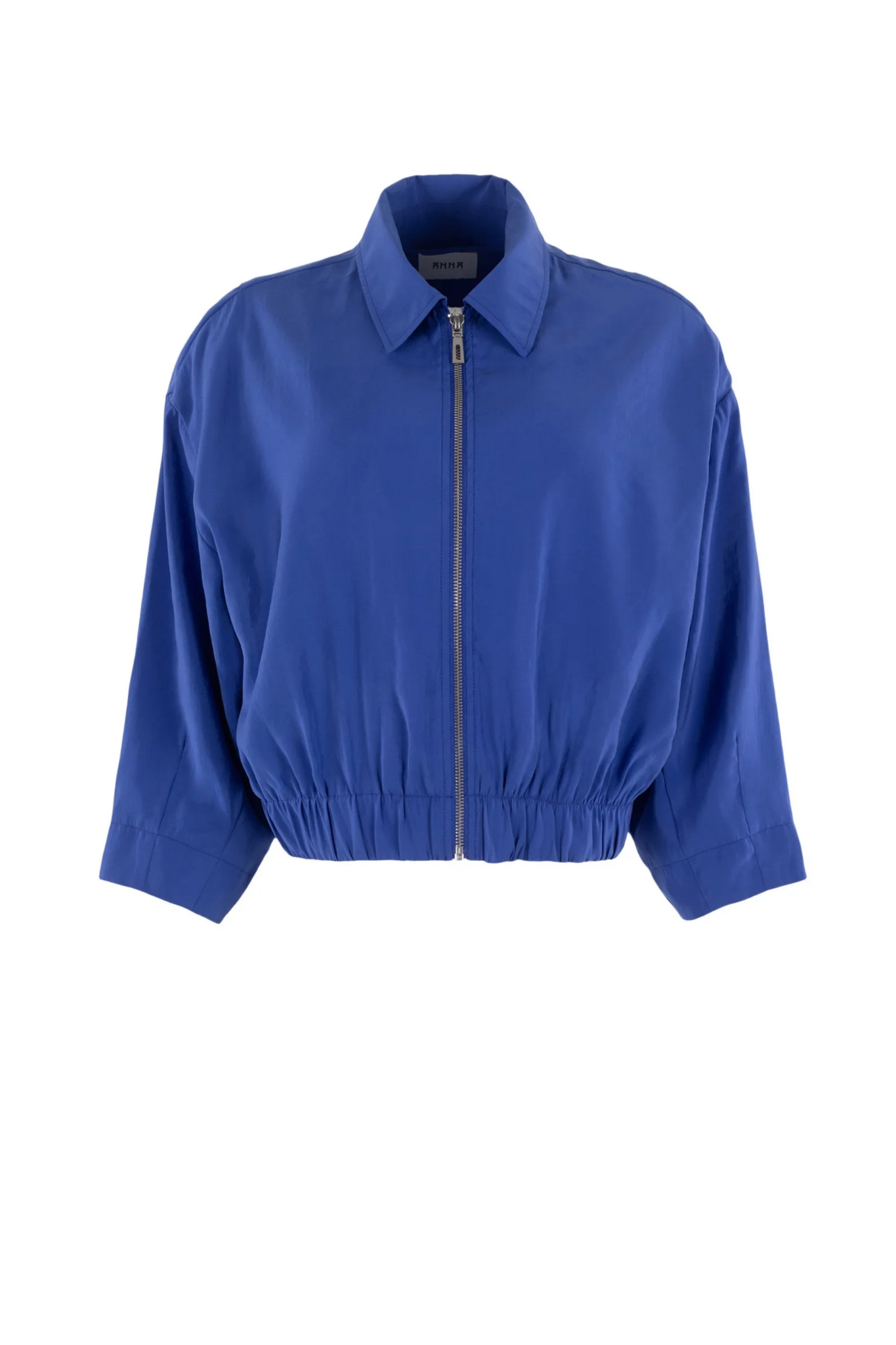 Het bomberjack van het merk Anna in Dark Lavender is een kort model met een blousekraag en korte mouwen. Het jack heeft een ritssluiting aan de voorzijde en een elastische taille voor een comfortabele pasvorm. Op de achterkant zit een leren embleem en plooidetails, wat zorgt voor een speels en uniek effect.