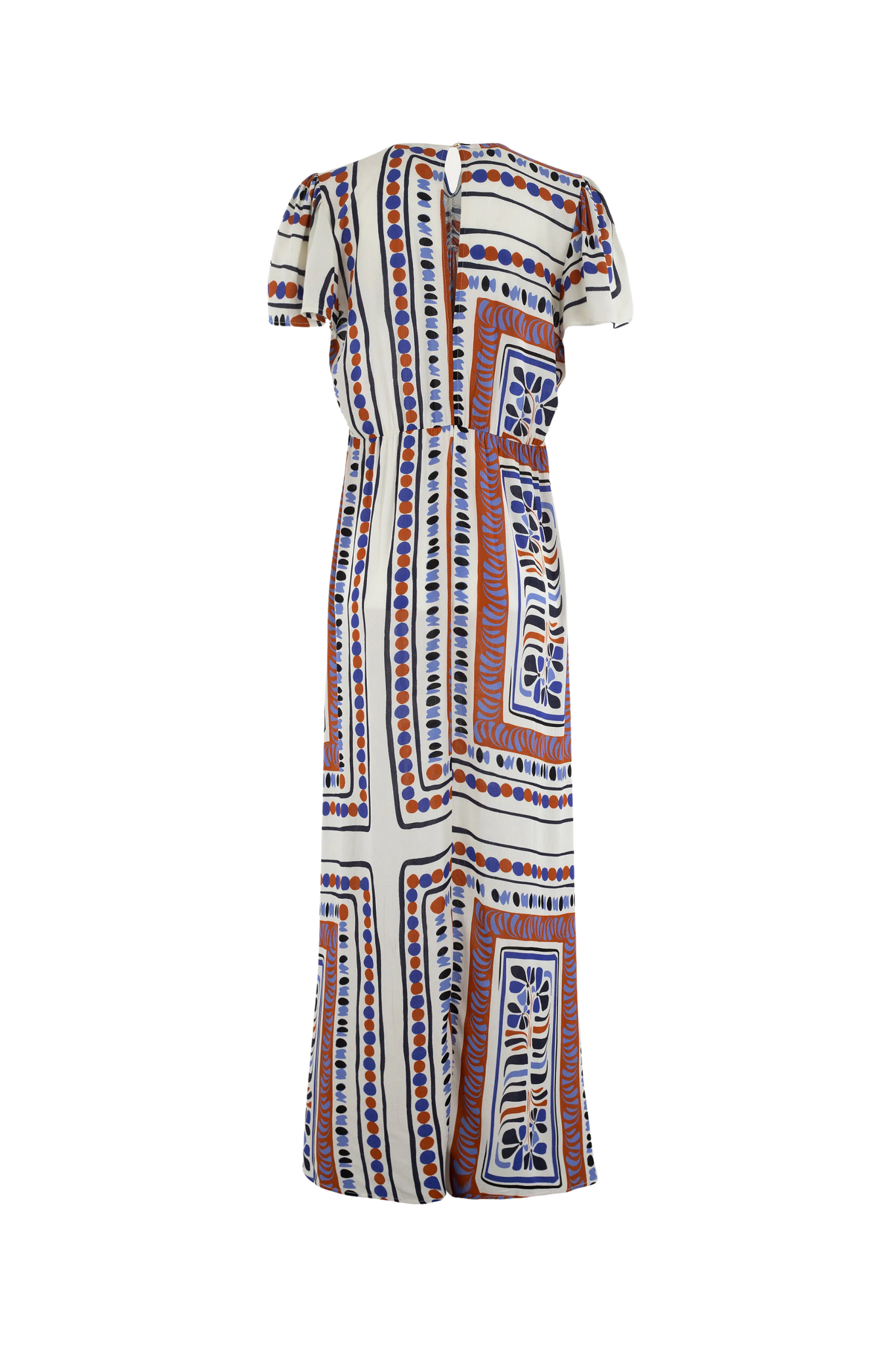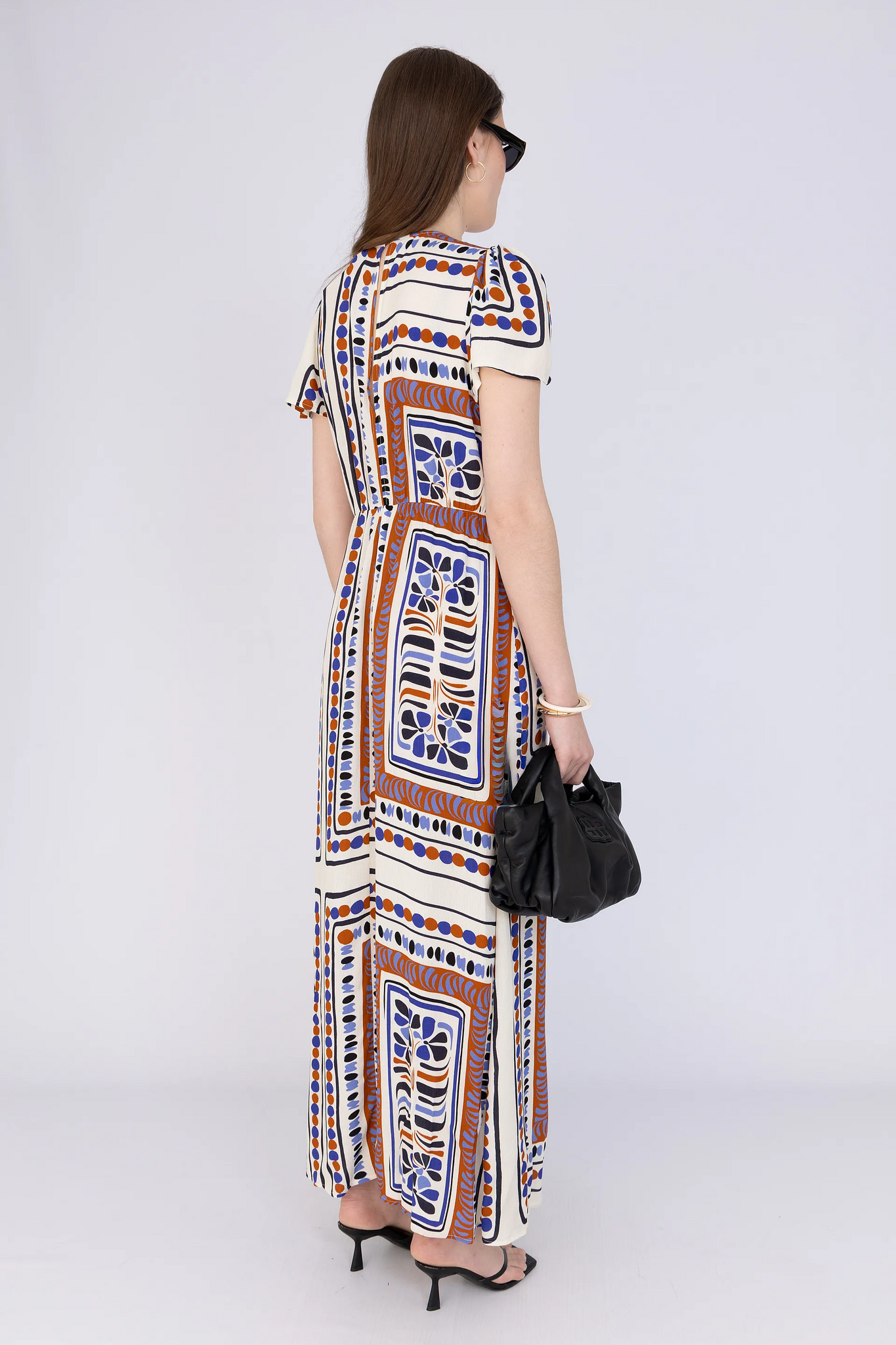 De Anna Maxi Jurk in Camel is een opvallende en elegante verschijning met een artistieke flair. Dit enkellange model is voorzien van een flatterende V-hals, korte vlindermouwen en een unieke geometrische print die stippen en strepen combineert in levendige blauw- en roodtinten. De jurk heeft een verfijnde knoopsluiting aan de achterzijde en een licht geplooid detail onder de borst, wat zorgt voor een prachtig vrouwelijk silhouet.
