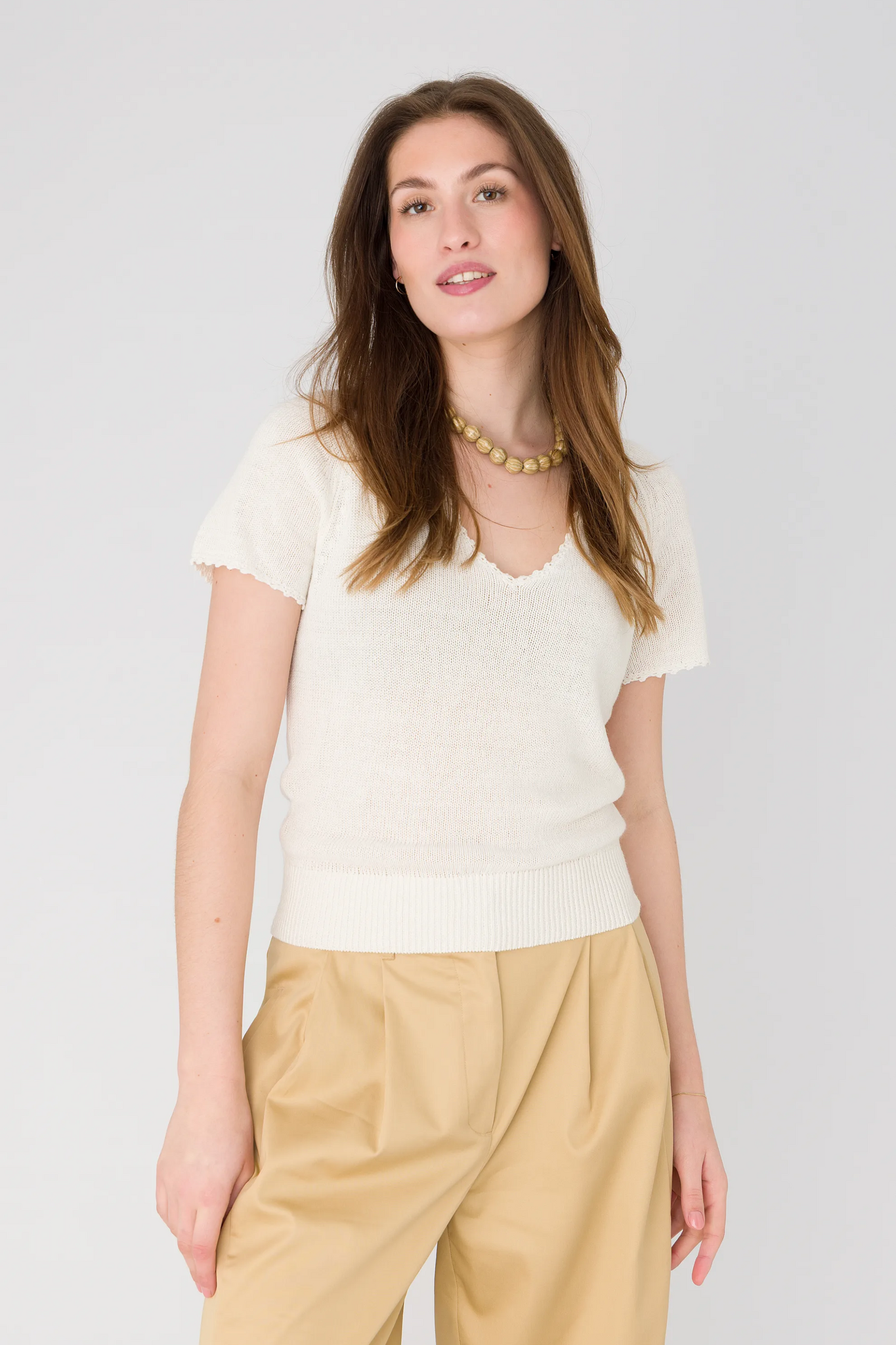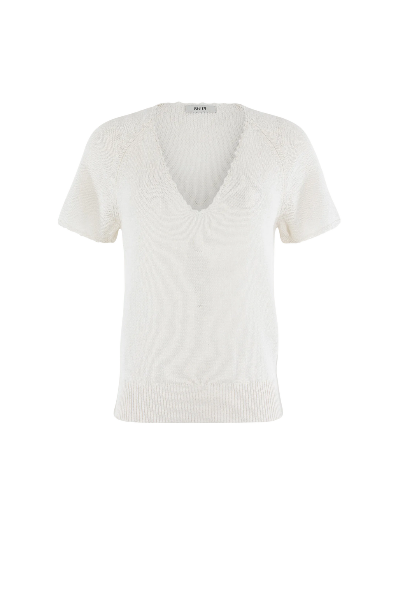 De pullover van het merk Anna in Off White is een fijngebreide trui met een V-hals en korte mouwen. De geribde tailleband zorgt voor een comfortabele en aansluitende pasvorm.