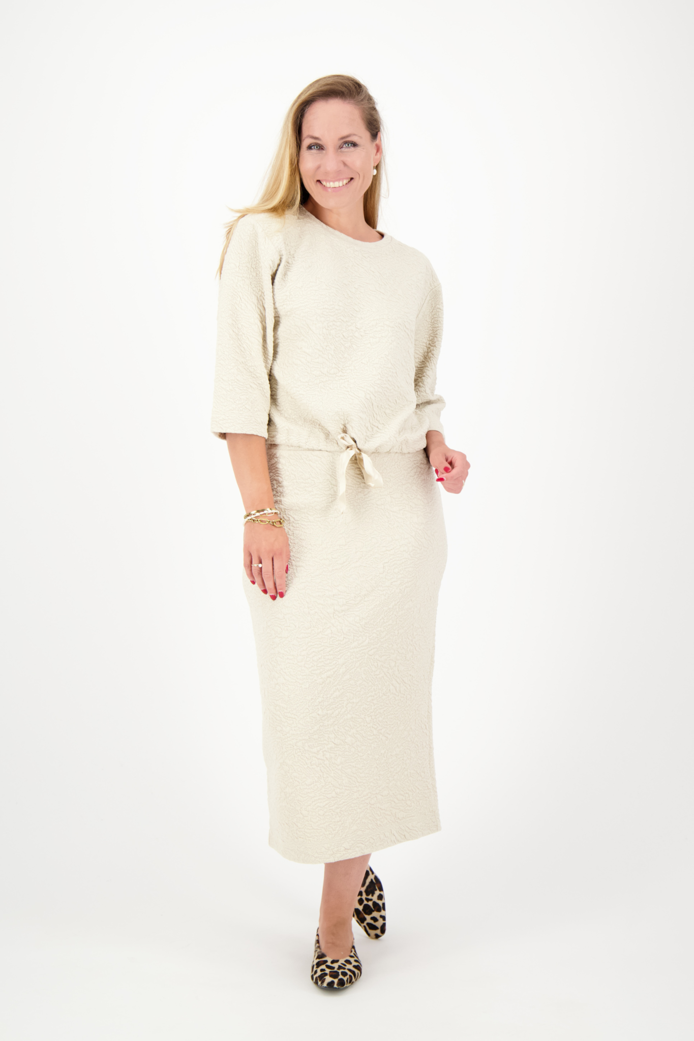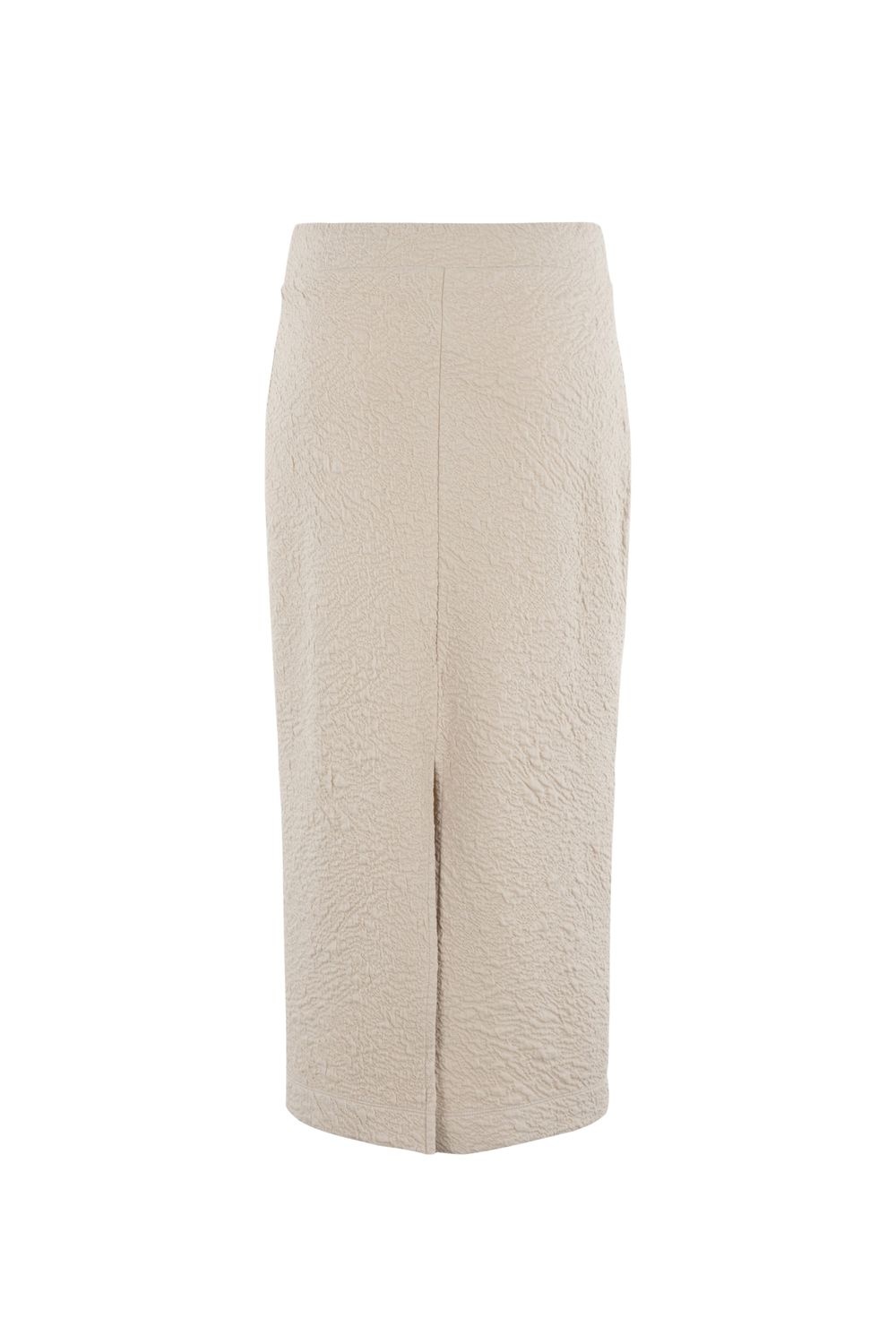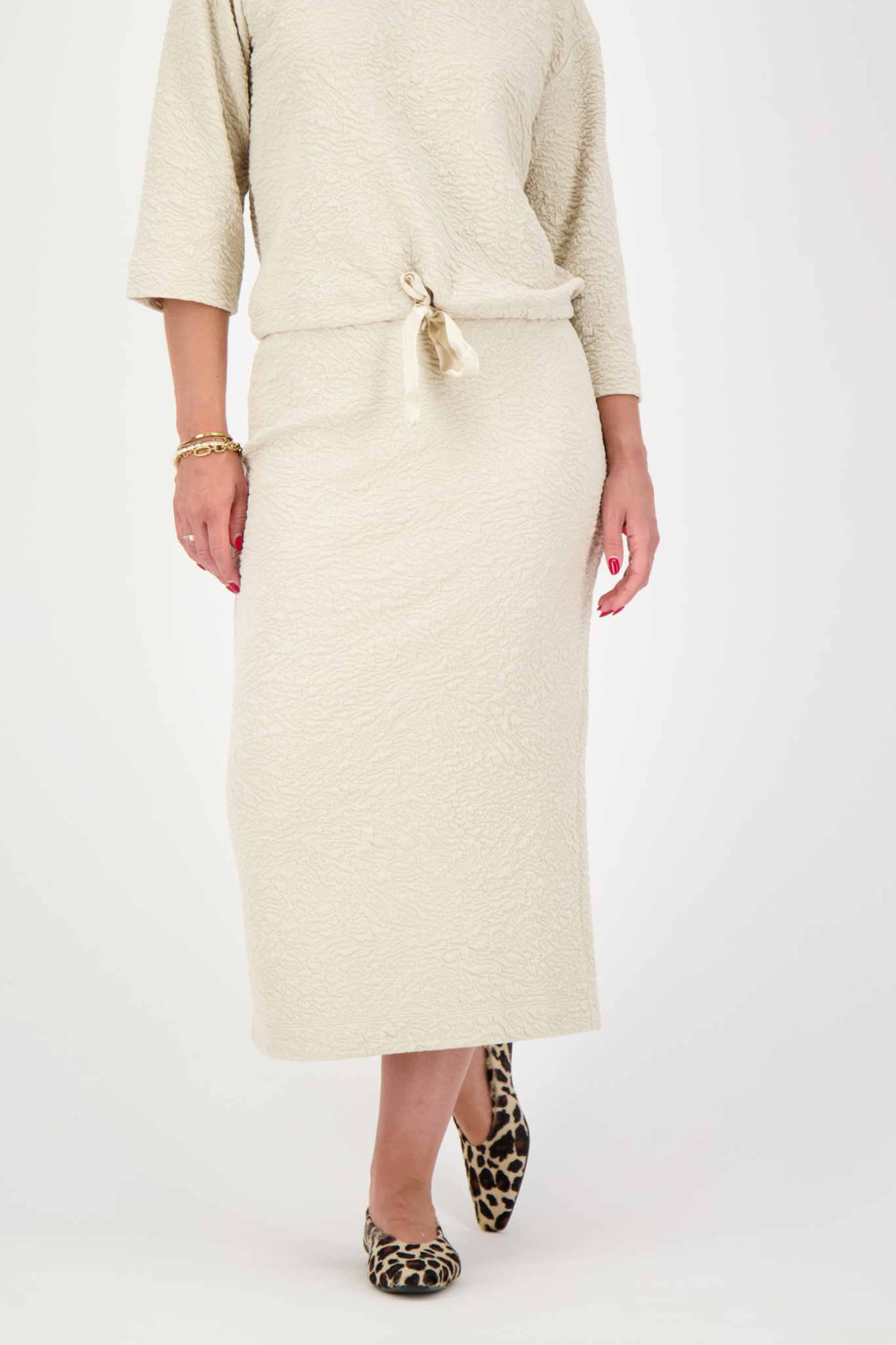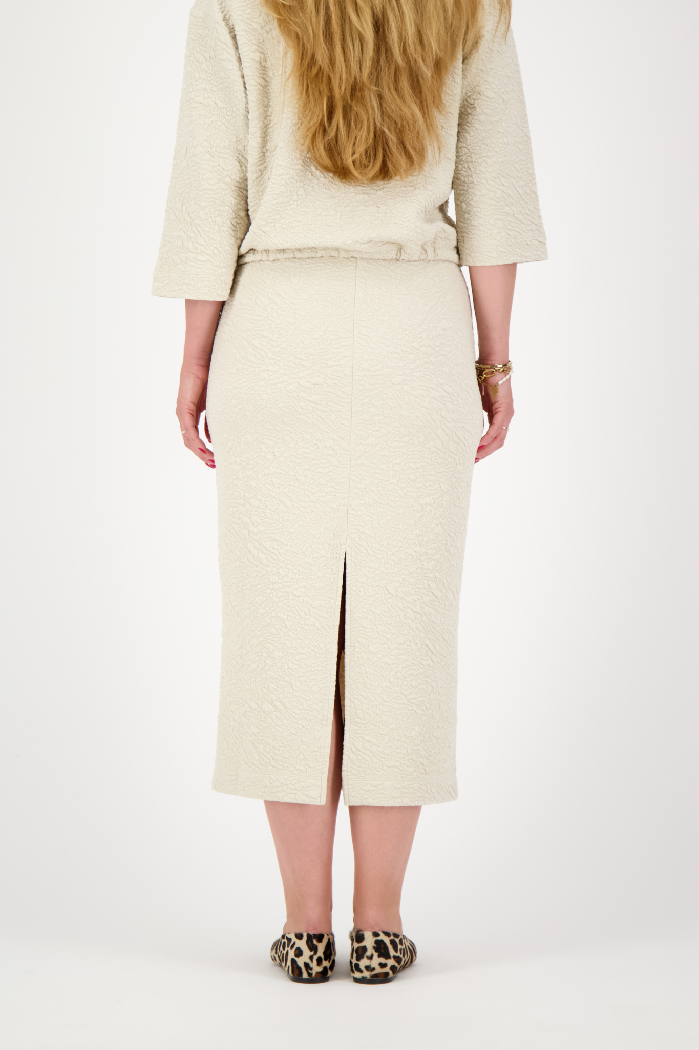 De rok van het merk Anna is een elegante, rechte rok met een comfortabele elastische tailleband. De split aan de achterkant zorgt voor extra bewegingsvrijheid. De stof heeft een subtiele structuur en kan perfect gecombineerd worden met de bijpassende top, voor een complete look!