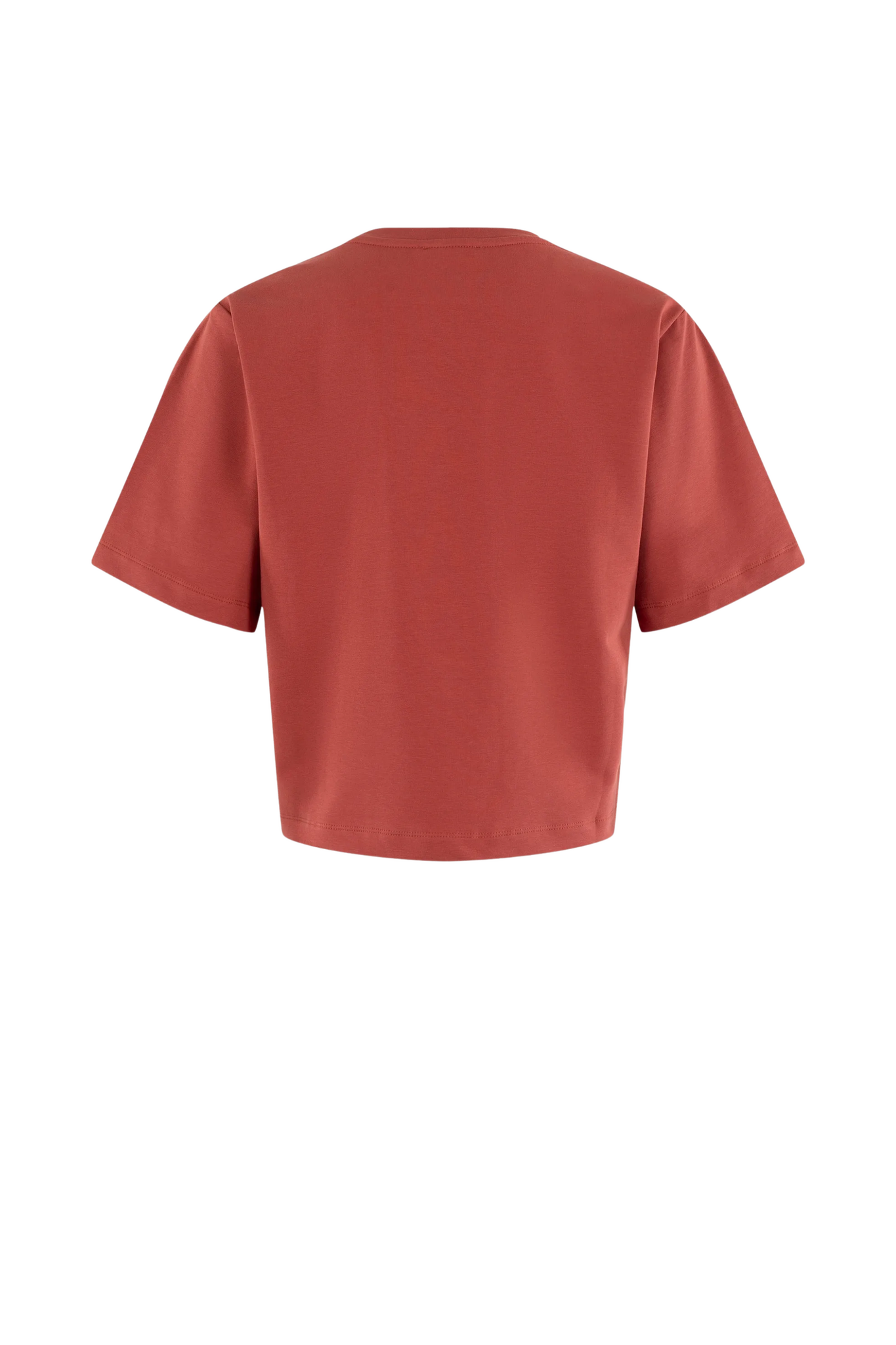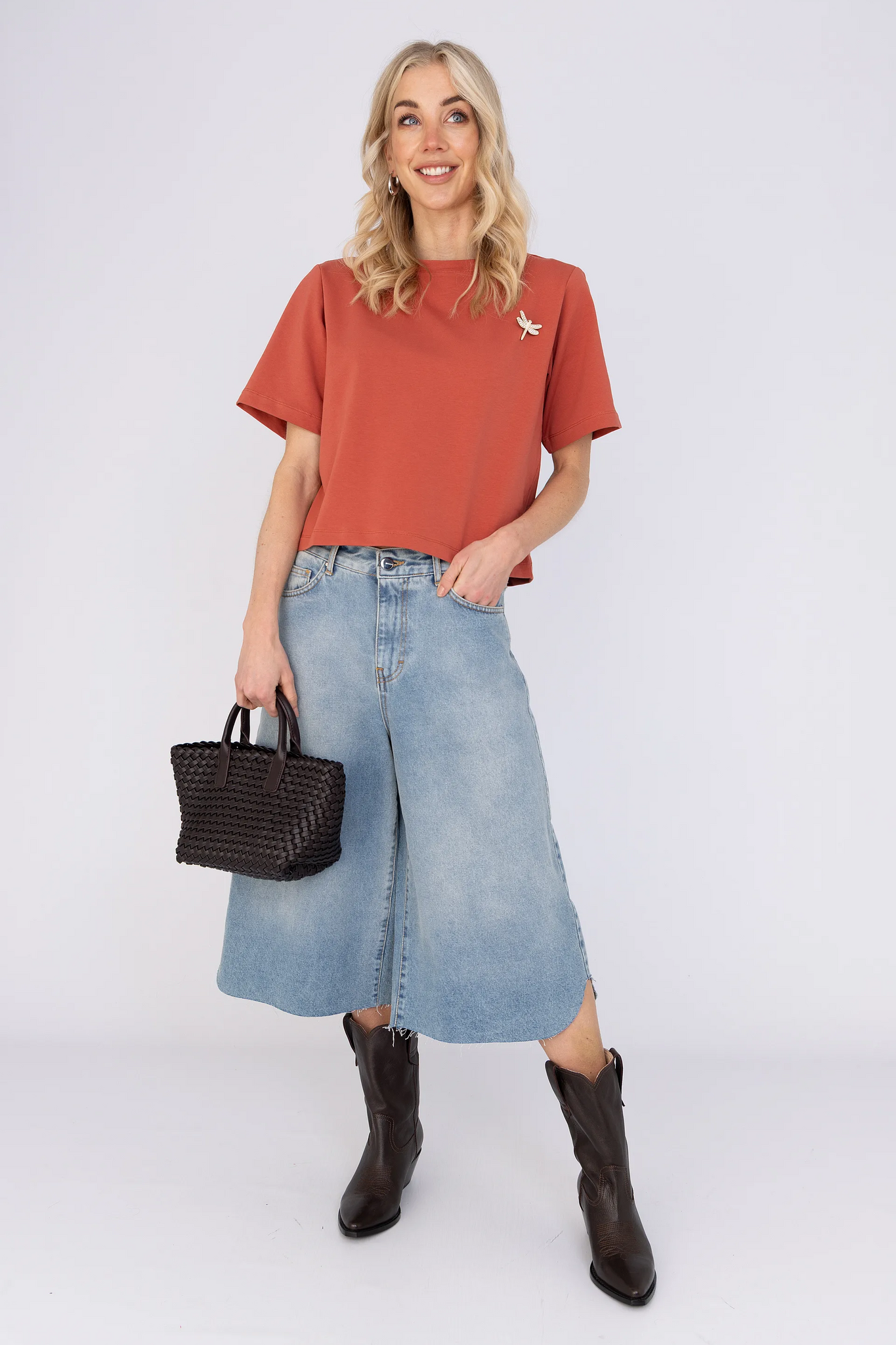 Het Brick T-shirt van Anna is een boxy oversized top met een ronde hals. Het T-shirt is voorzien van een afneembare libelle‑broche, wat een speels accent geeft aan het ontwerp. Comfortabel en stijlvol voor een casual-chic look.