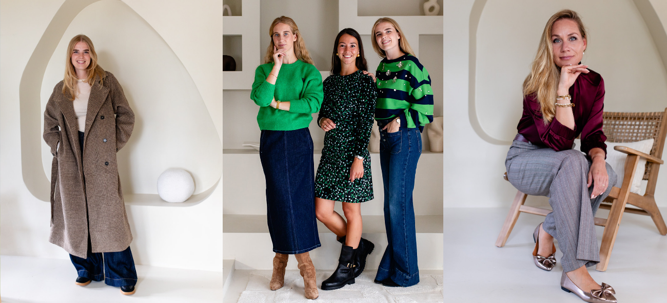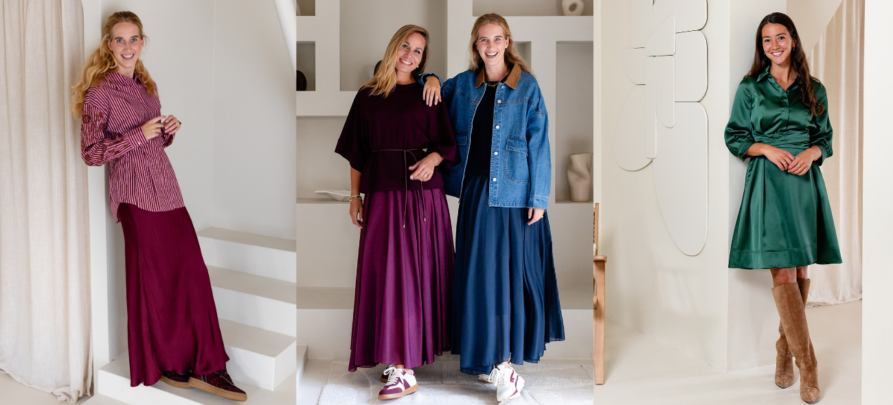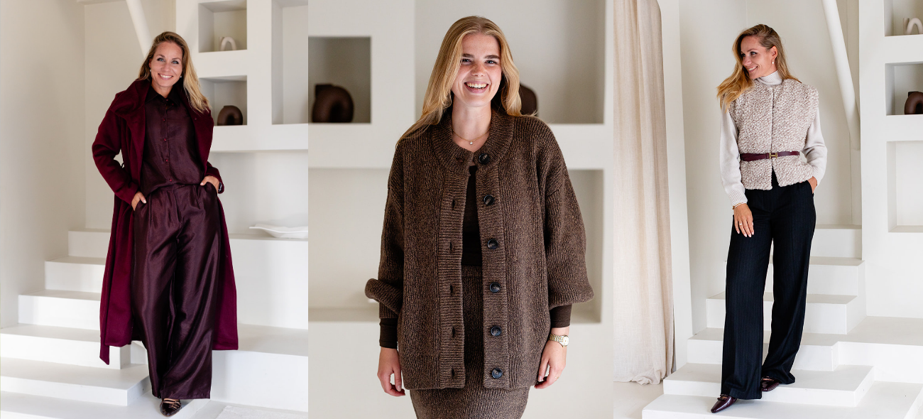 Dit seizoen zien we een sterke focus op warme bordeaux-, donkergroen-, mosterdgele, terracotta- en diepblauwe tinten, vaak gecombineerd met neutrale basistinten zoals zwart, crème en taupe. Deze kleuren vormen de basis voor combinaties die zowel tijdloos als eigentijds aanvoelen. Rijkelijke materialen zoals grof gebreide truien, soepel vallende blouses, satijnen rokken en jacquard-jurken geven textuur en diepte aan de garderobe, waardoor elke outfit er stijlvol en verzorgd uitziet.