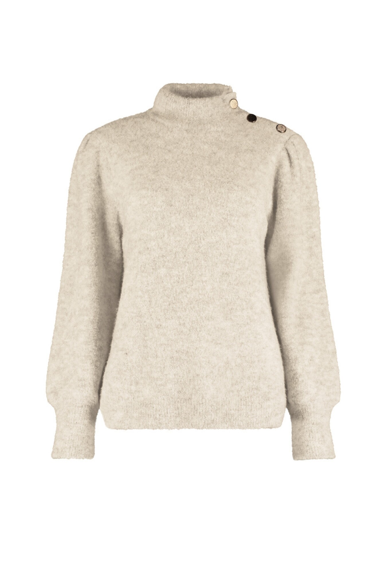 Deze coltrui van Bloomings is een comfortabele trui in een beige kleur met een relaxte pasvorm. De trui heeft een hoge opstaande kraag en lange mouwen met geribde boorden. Een uniek detail is de kleine knoopsluiting van drie gouden knopen op de rechterschouder, wat een chique touch toevoegt aan dit casual item.