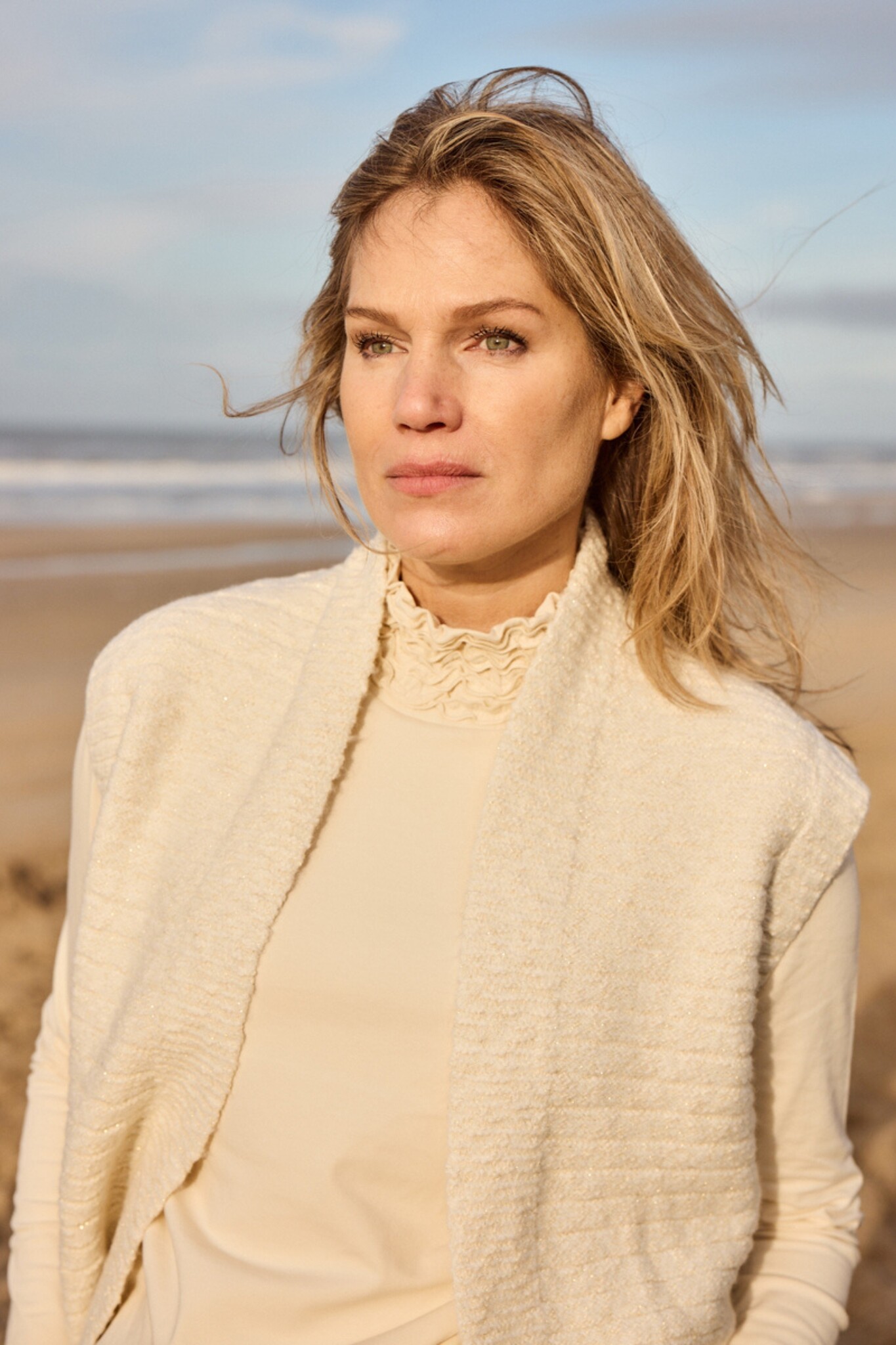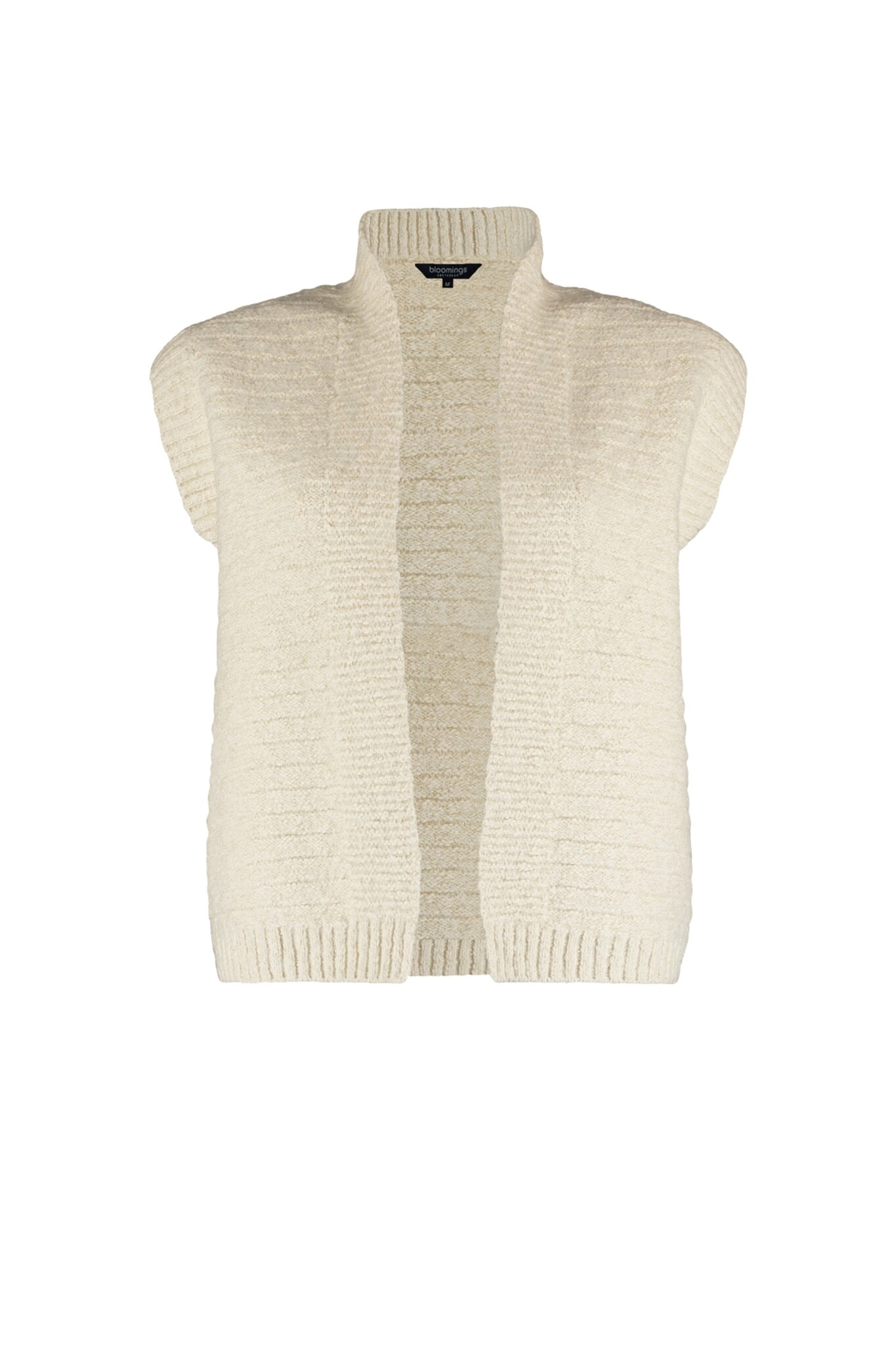 Dit mouwloze vest van Bloomings is een korte gilet in een beige kleur. Het item heeft een geribde structuur en bevat een subtiel lurexdraad voor een verfijnde glinstering. De normale pasvorm en het ontbreken van een sluiting maken dit een veelzijdig kledingstuk.