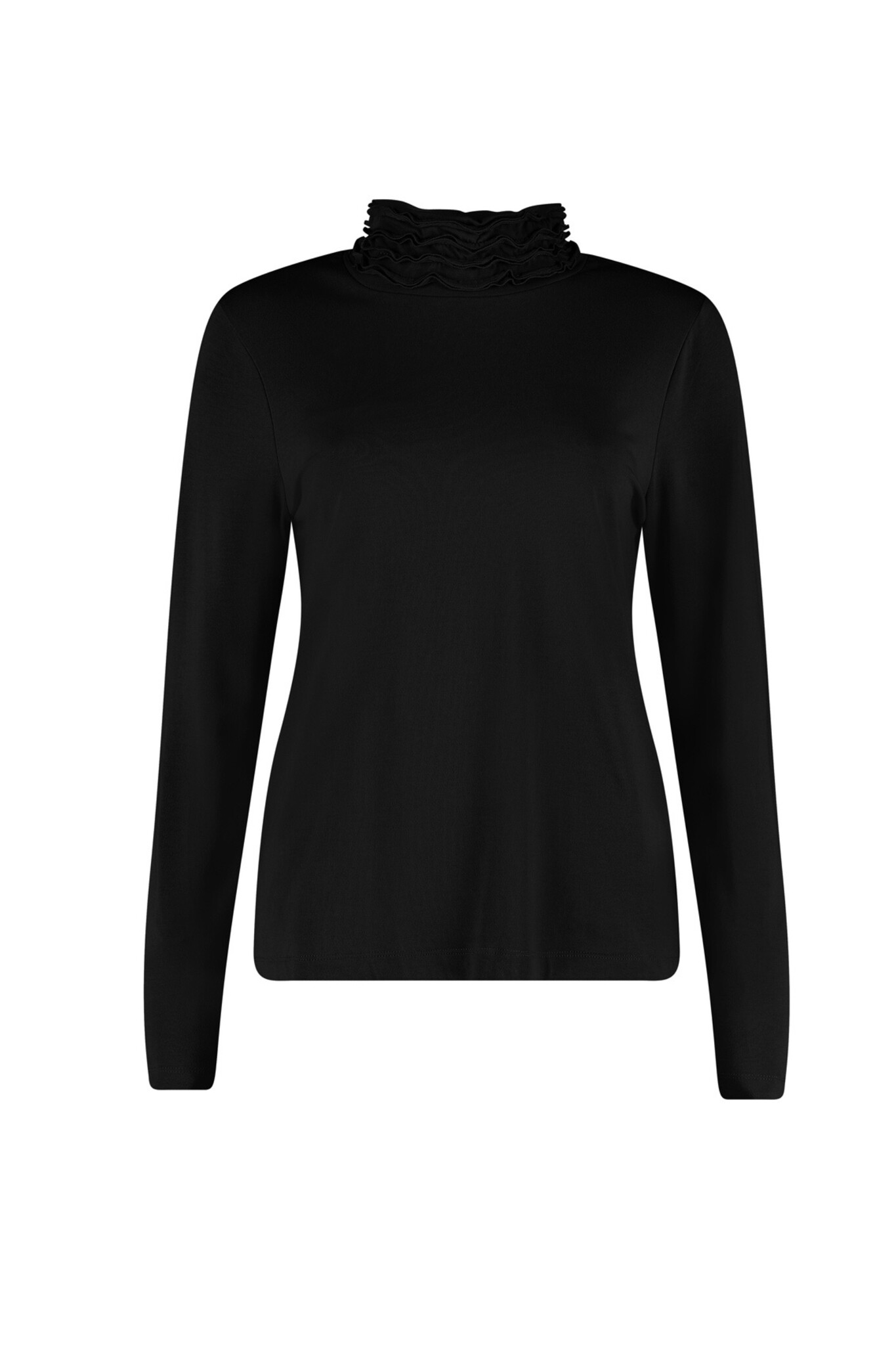 De Ruffle Coltop van Bloomings is een aangesloten top in een zwarte kleur. De top heeft een opvallende col met ruffles, wat zorgt voor een elegante en speelse uitstraling. Het item heeft lange mouwen en een nauwsluitende pasvorm.