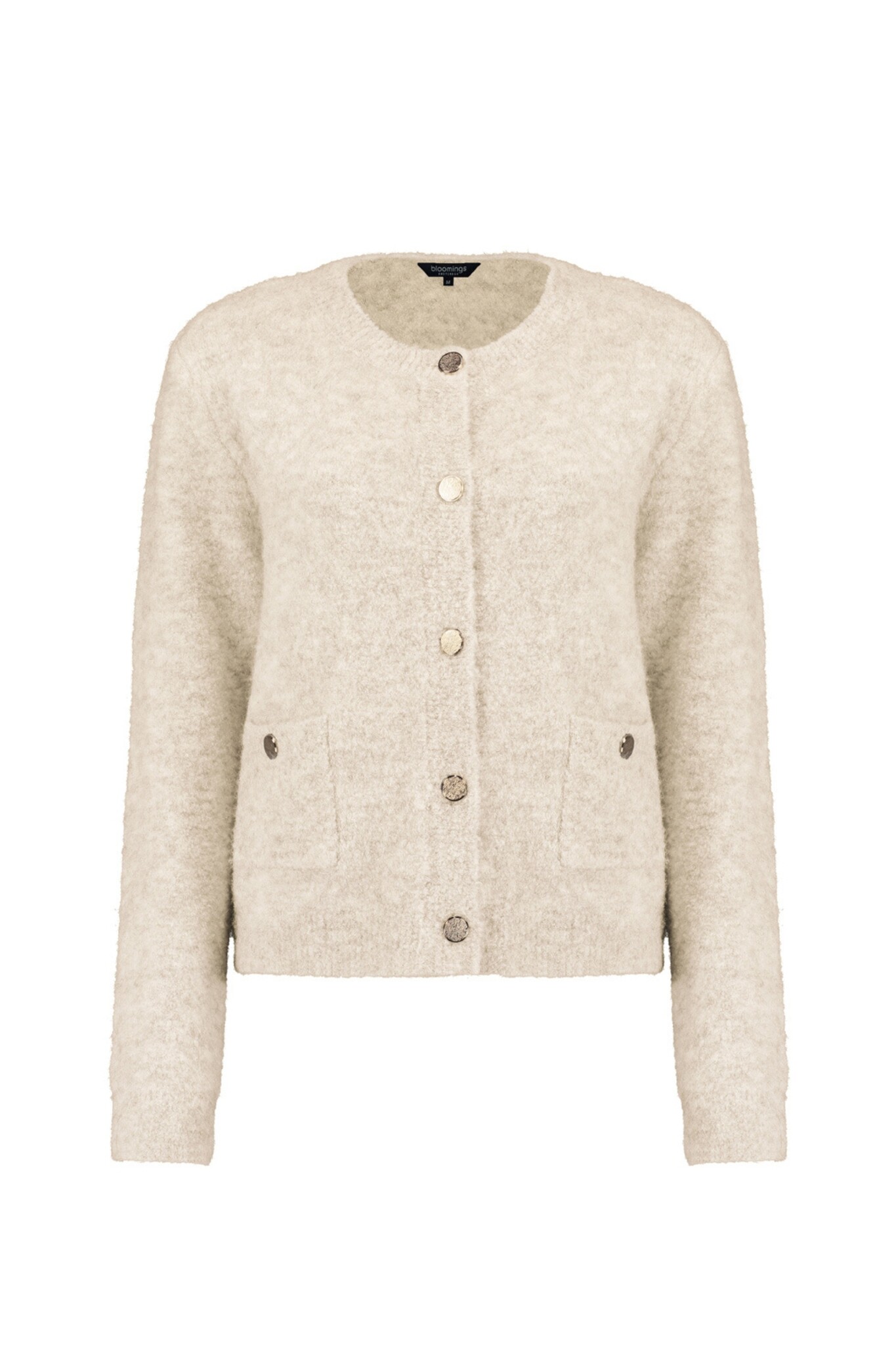 Dit gebreide vest van Bloomings is een veelzijdig item in een beige kleur. Het vest heeft een ronde hals, lange mouwen en een doorlopende knoopsluiting aan de voorzijde met gouden knopen. Het is tevens voorzien van handige steekzakken.
