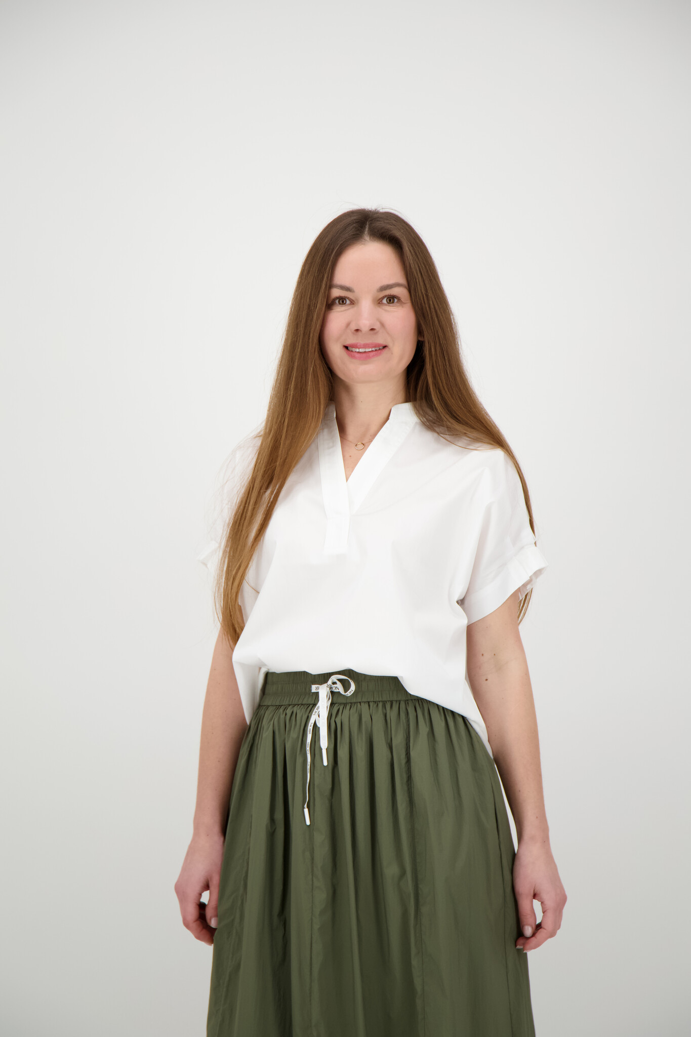 De Catnoir Blouse in White is een moderne top met een korte, losvallende pasvorm en een stijlvolle opstaande kraag die overloopt in een subtiele V-hals. De blouse heeft wijde, korte mouwen met een decoratieve omslag en is vervaardigd uit een gladde, stevige katoenkwaliteit. Dit minimalistische ontwerp biedt een frisse en eigentijdse uitstraling die zowel casual als zakelijk gedragen kan worden.