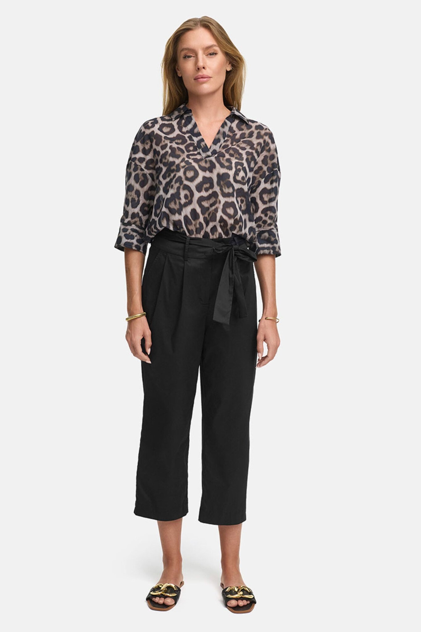 De Catnoir Capri Pants in Black is een stijlvolle, kortere broek met een elegante uitstraling. Dit zwarte model heeft een hoge taille met een bijpassend strikceintuur en steekzakken aan de voorzijde voor een verzorgde look. De rechte pijpen eindigen boven de enkel, wat deze broek ideaal maakt voor een chique zomerse outfit of een zakelijke gelegenheid.