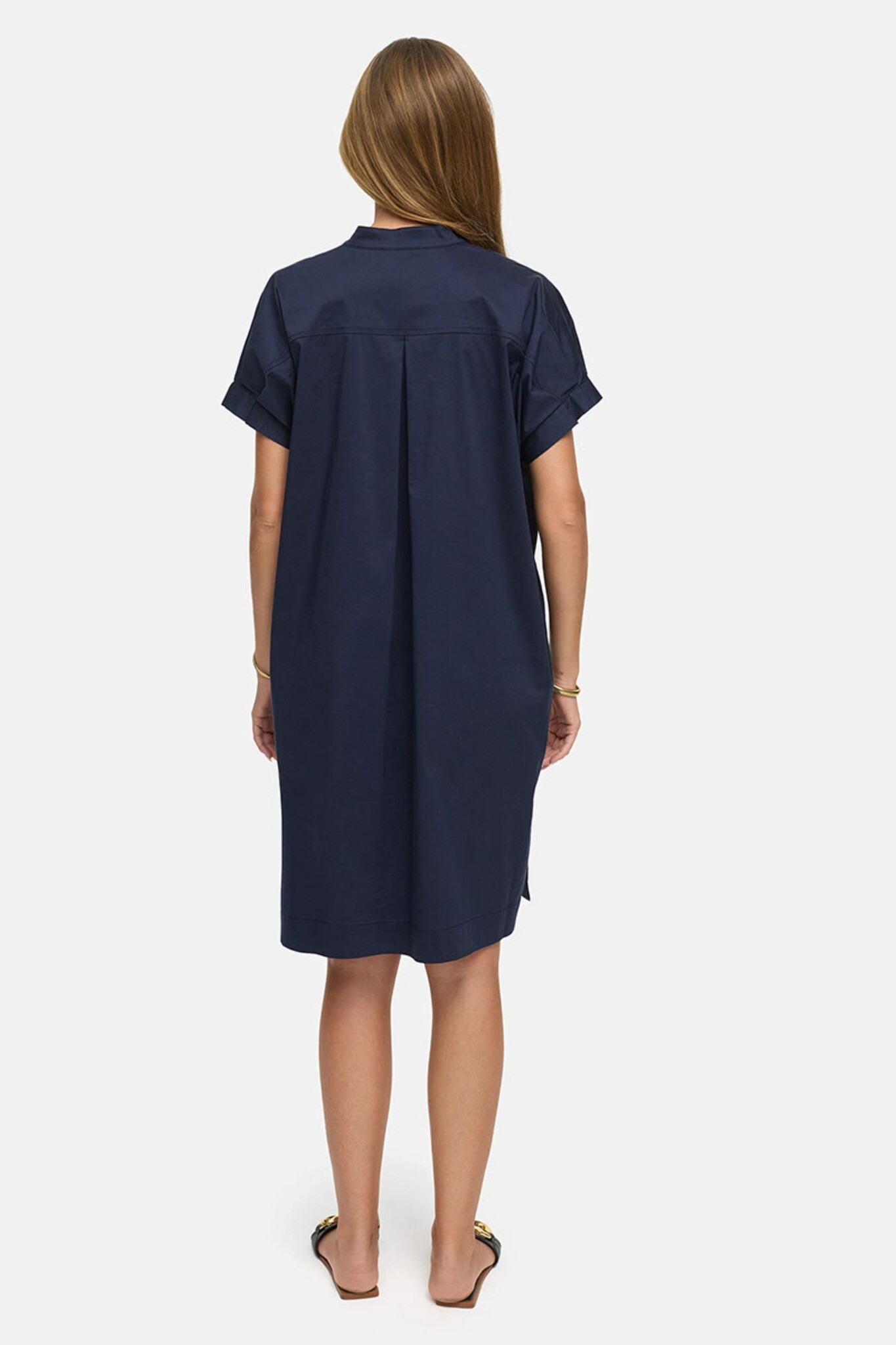 De Catnoir Dress in Navy is een knielange jurk met een klassieke en minimalistische uitstraling. Dit donkerblauwe model heeft een elegante V-hals met een opstaande kraag en korte mouwen die zijn afgewerkt met een stijlvolle omslag. De jurk is vervaardigd uit een stevige katoenkwaliteit en heeft een rechte, losvallende pasvorm voor optimaal draagcomfort tijdens warme dagen.
