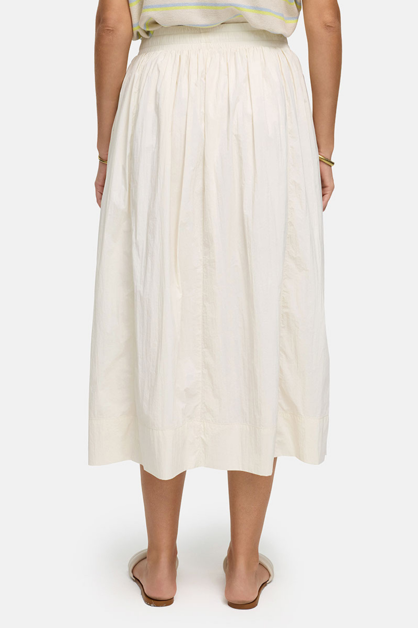 De Catnoir Maxi Skirt in Off White is een zwierige, enkellange rok met een luchtig en vrouwelijk silhouet. Dit model is voorzien van een comfortabele elastische tailleband met een verstelbaar trekkoord en praktische steekzakken in de zijnaden. De rok is vervaardigd uit een soepelvallende stof met een subtiele textuur, wat zorgt voor een elegante en tijdloze zomerse uitstraling.