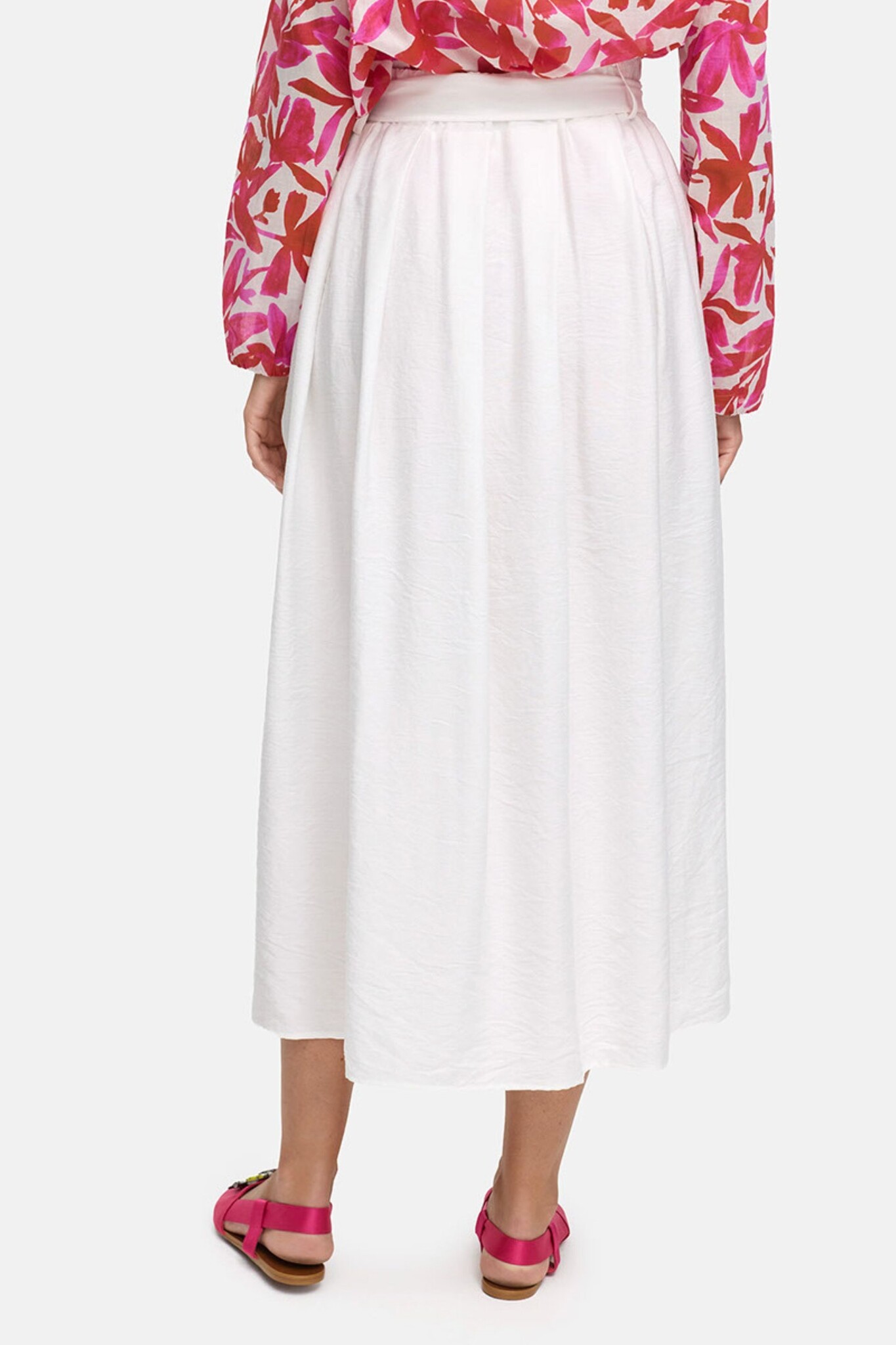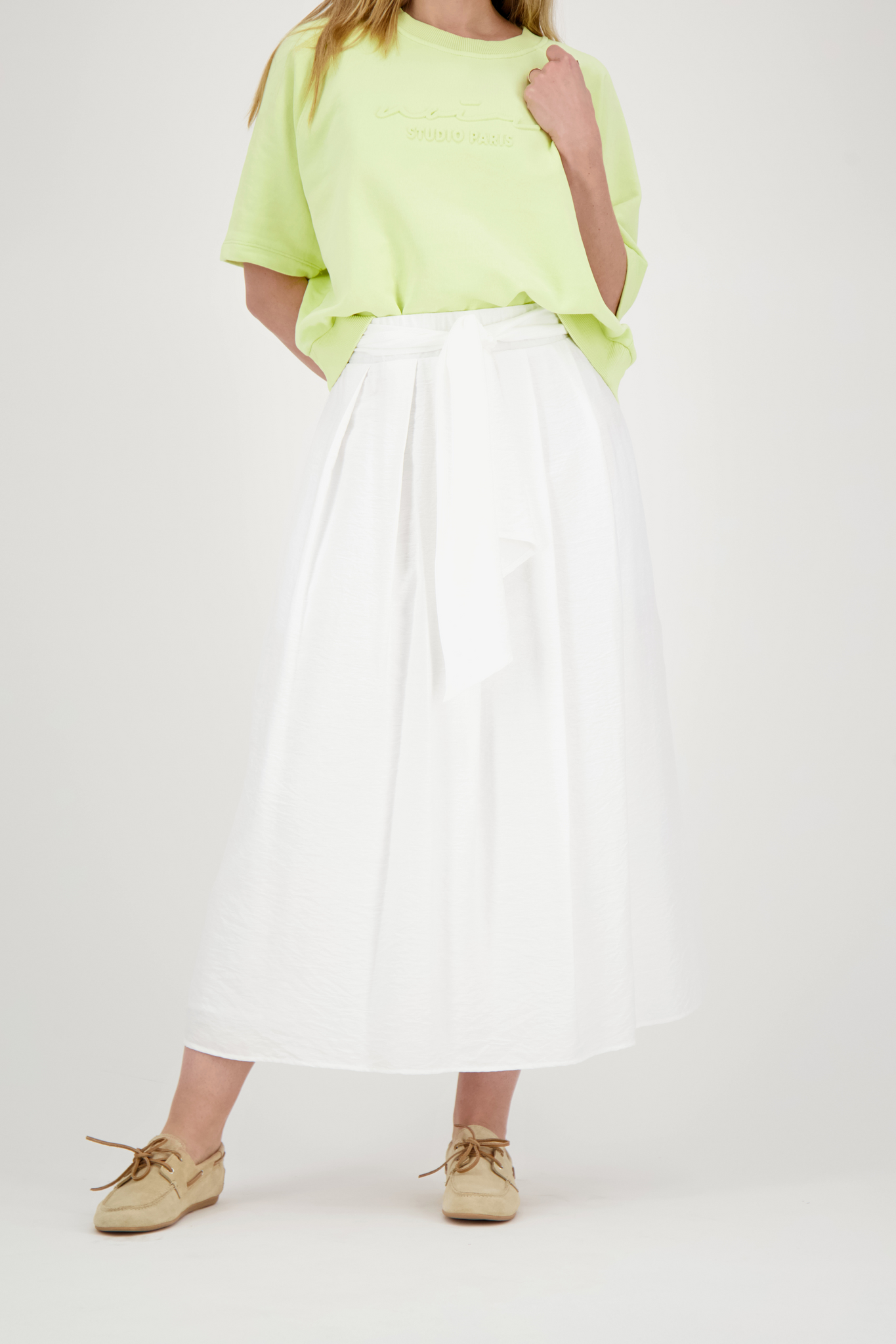 De Catnoir Maxi Skirt in White is een luchtige, enkellange rok met een verfijnde uitstraling. Dit witte model kenmerkt zich door een brede elastische tailleband met een elegant strikceintuur en subtiele plooivorming voor een zwierig silhouet. De rok is vervaardigd uit een soepelvallende stof met een lichte textuur, wat zorgt voor een stijlvolle en comfortabele pasvorm tijdens warme dagen.