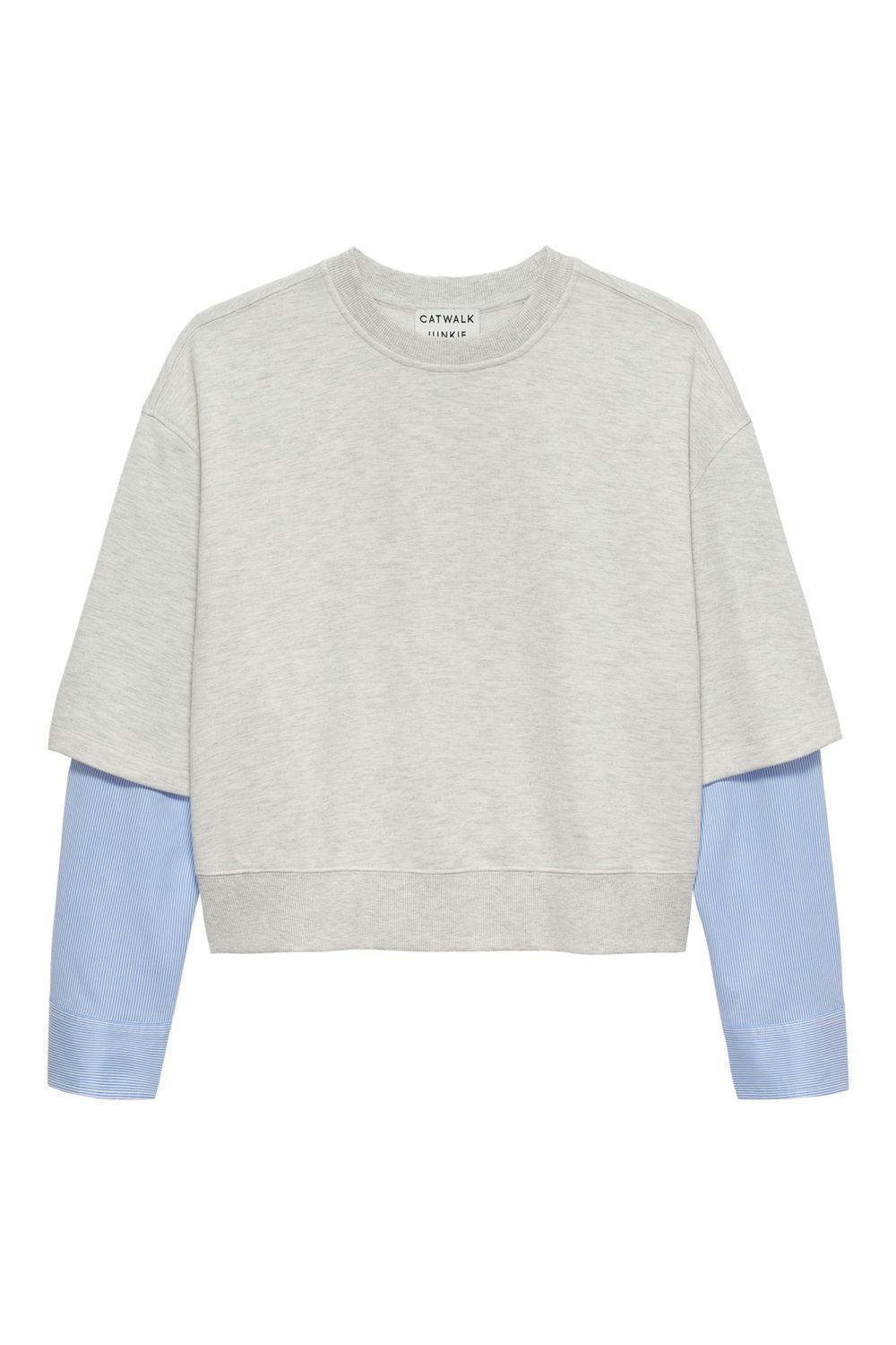 De Sweater With Blouse Sleeves van Catwalk Junkie is een unieke trui in een gemêleerde grijstint. De sweater van zachte stof heeft een ronde hals en korte mouwen, waaronder lange mouwen van een gestreepte blousestof zijn bevestigd. Dit zorgt voor een trendy en gelaagde look in één comfortabel item.