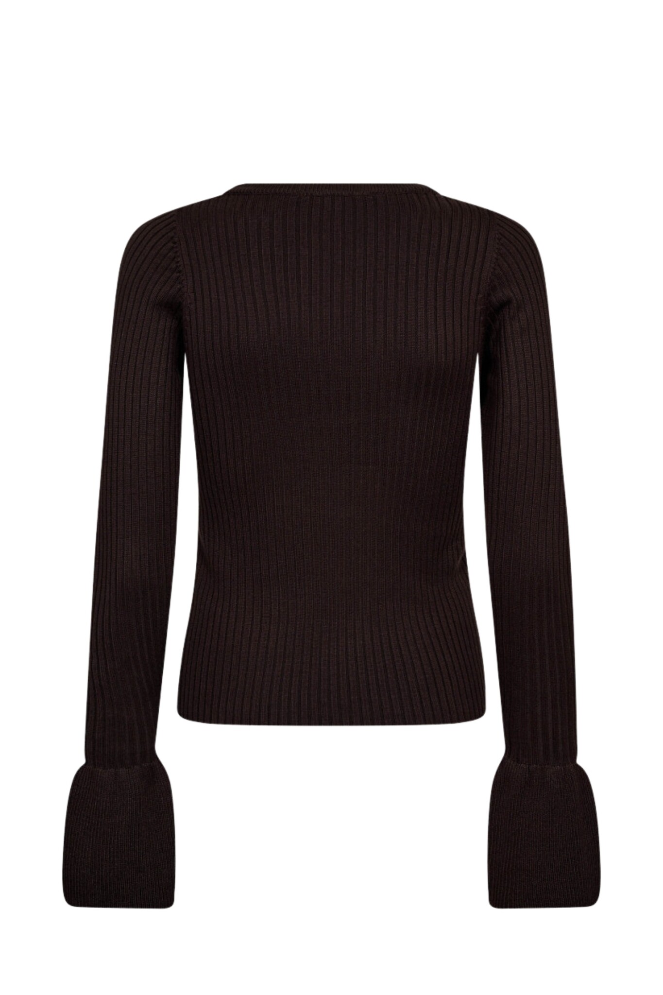 De Balin Wide Cuf Knit van Co'couture is een stijlvolle, fijn gebreide trui in een donkerbruine kleur. De trui heeft een aangesloten pasvorm, een ronde hals en is voorzien van een geribde structuur. Het meest opvallende detail zijn de wijd uitlopende klokmouwtjes, die zorgen voor een modieuze uitstraling.