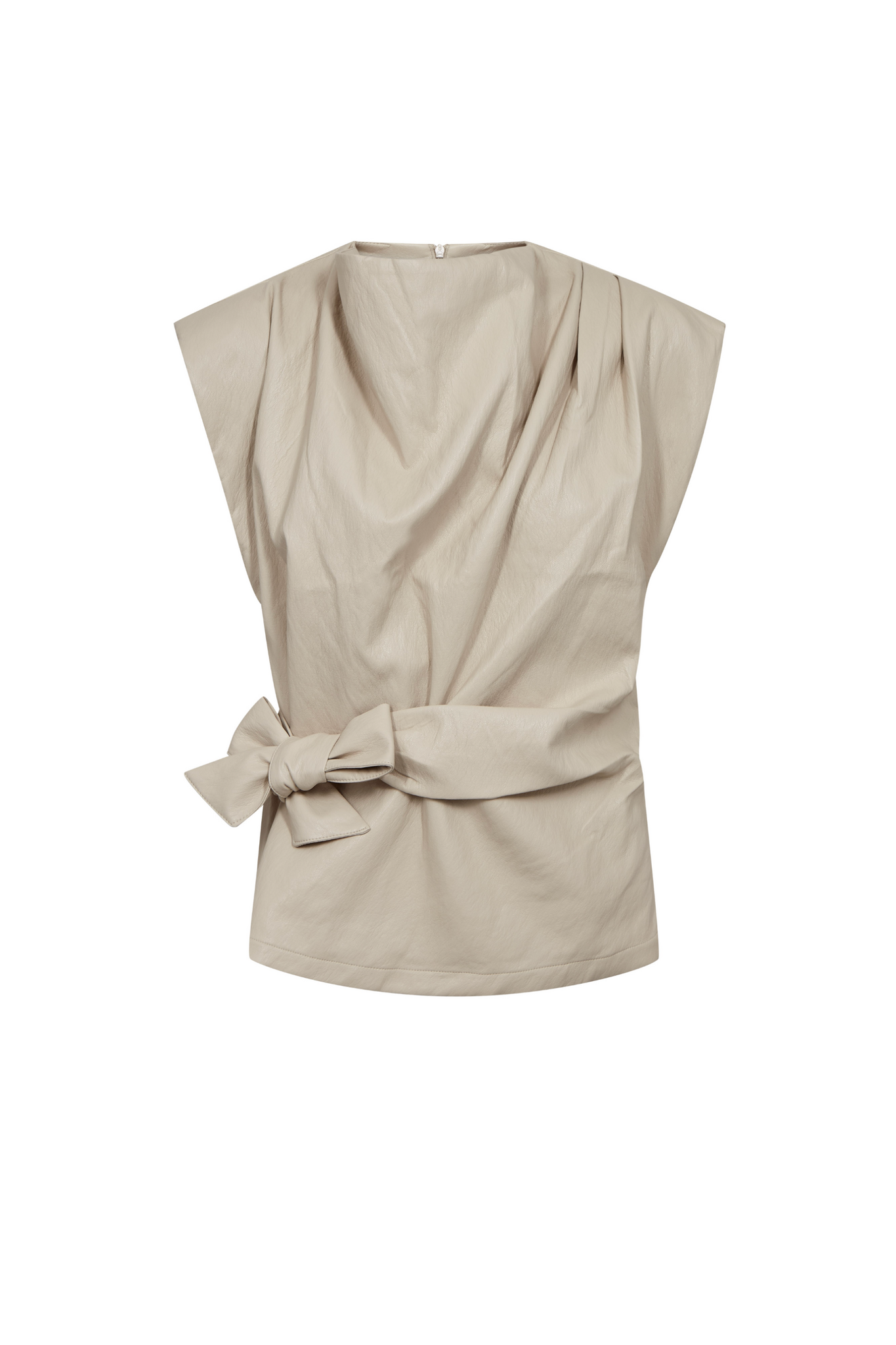 De Co'couture GittCC Pleat Top in Bone is een avant-gardistische mouwloze top die een krachtig silhouet combineert met vrouwelijke souplesse. Dit model in een zachte zandkleur onderscheidt zich door de opvallende gedrapeerde halslijn en de sculpturale schouders die voor een moderne uitstraling zorgen. Het ontwerp wordt prachtig geaccentueerd door een brede strikceintuur in de taille, die een speels en elegant contrast vormt met de gestructureerde bovenkant.