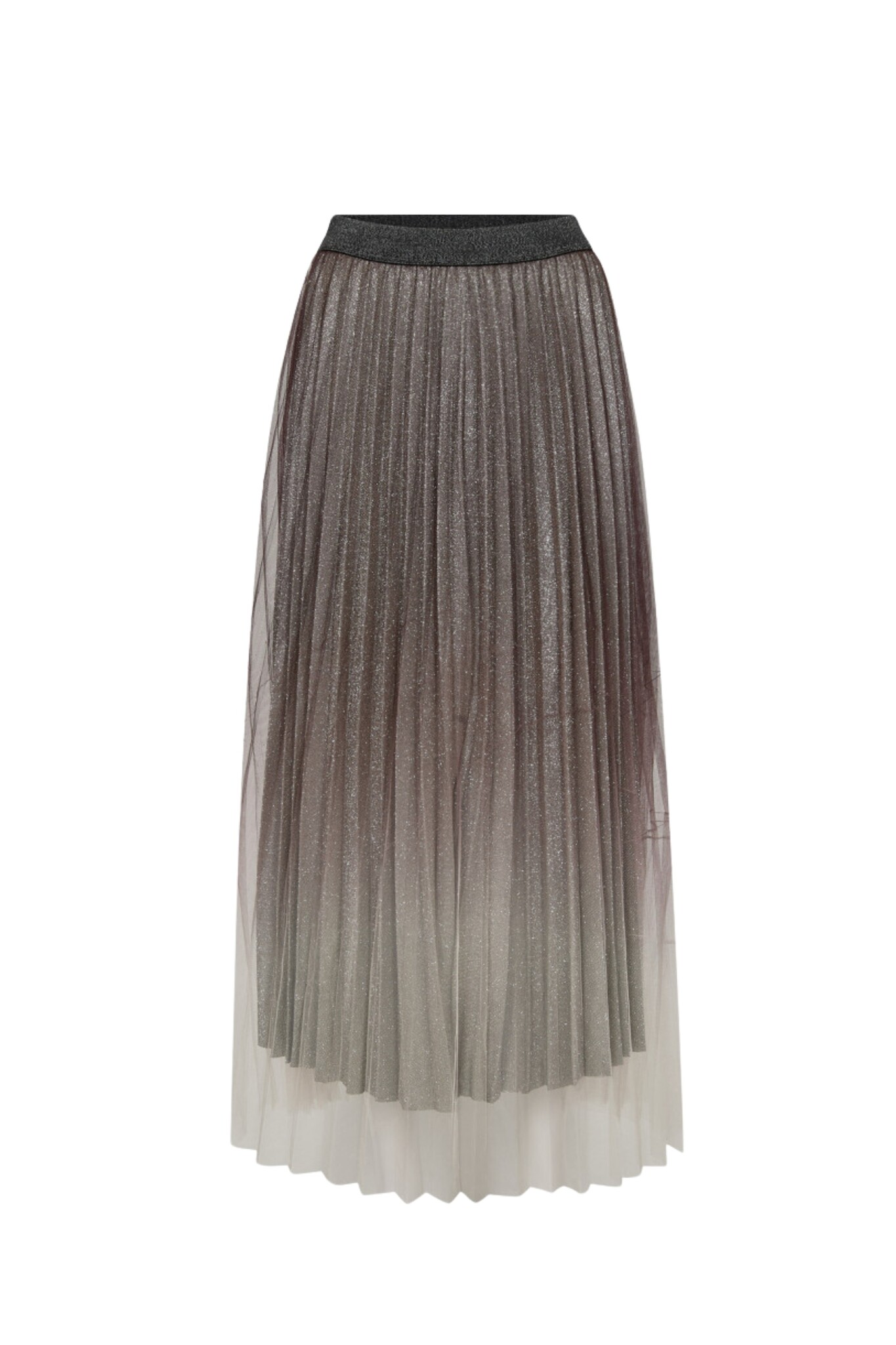 De Glitter Plissé Skirt van Co'couture is een feestelijke en opvallende rok. Deze maxi lengte rok in de basiskleur Dark Brown is uitgevoerd als een elegante plissé rok. De rok bestaat uit een dikke voering met glitters voor een sprankelend effect, waarover een dunne tule rok valt. Deze tule rok heeft een uniek kleurverloop dat uitloopt van bruin naar off white. De rok biedt draagcomfort dankzij de elastische tailleband, die tevens is voorzien van subtiele glitters.