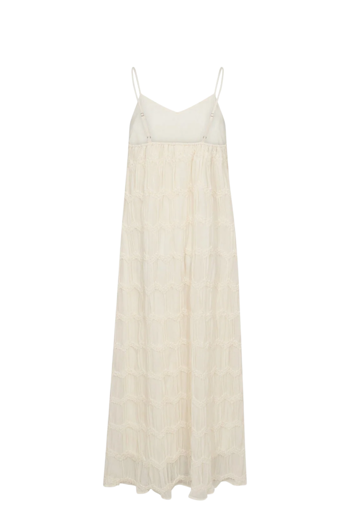 De Jerry Strap Dress van Co’couture in Off White is een mouwloze jurk met een V-hals en verstelbare spaghettibandjes. De elastische boord bij de rug zorgt voor een aansluitende en comfortabele pasvorm. De jurk is voorzien van een onderjurk en heeft een wijd uitlopende rok die soepel valt.