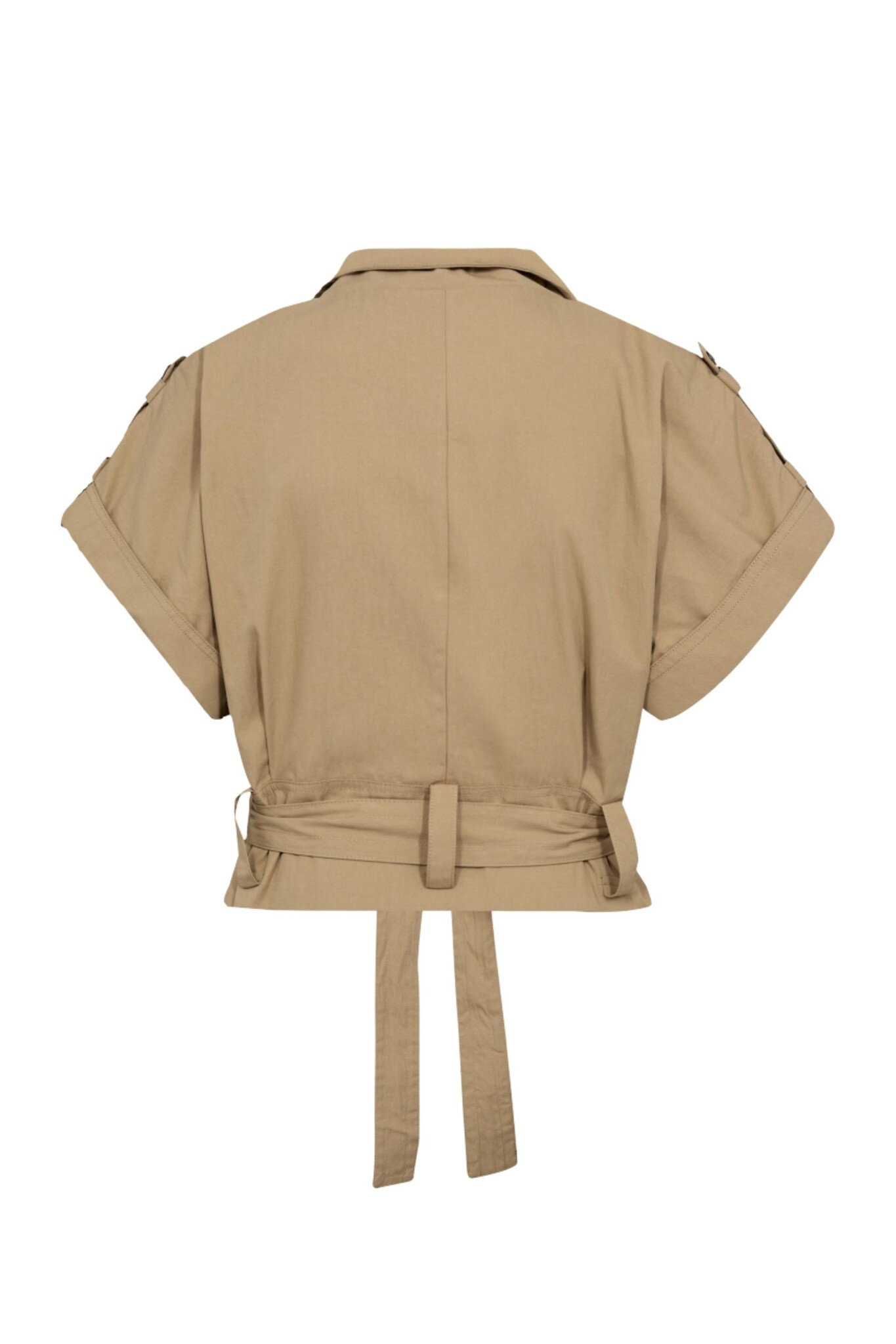 Het Co'couture Kesha Cargo Vest in de kleur Sand is een stoer en eigentijds item met een uniek biker-geïnspireerd ontwerp. Dit cropped vest valt op door de asymmetrische ritssluiting, de brede revers en de korte mouwen met een vaste omslag. Dankzij de bijbehorende ceintuur in de taille kun je een vrouwelijk silhouet creëren, terwijl de zandkleurige katoenmix zorgt voor een casual cargo-look.