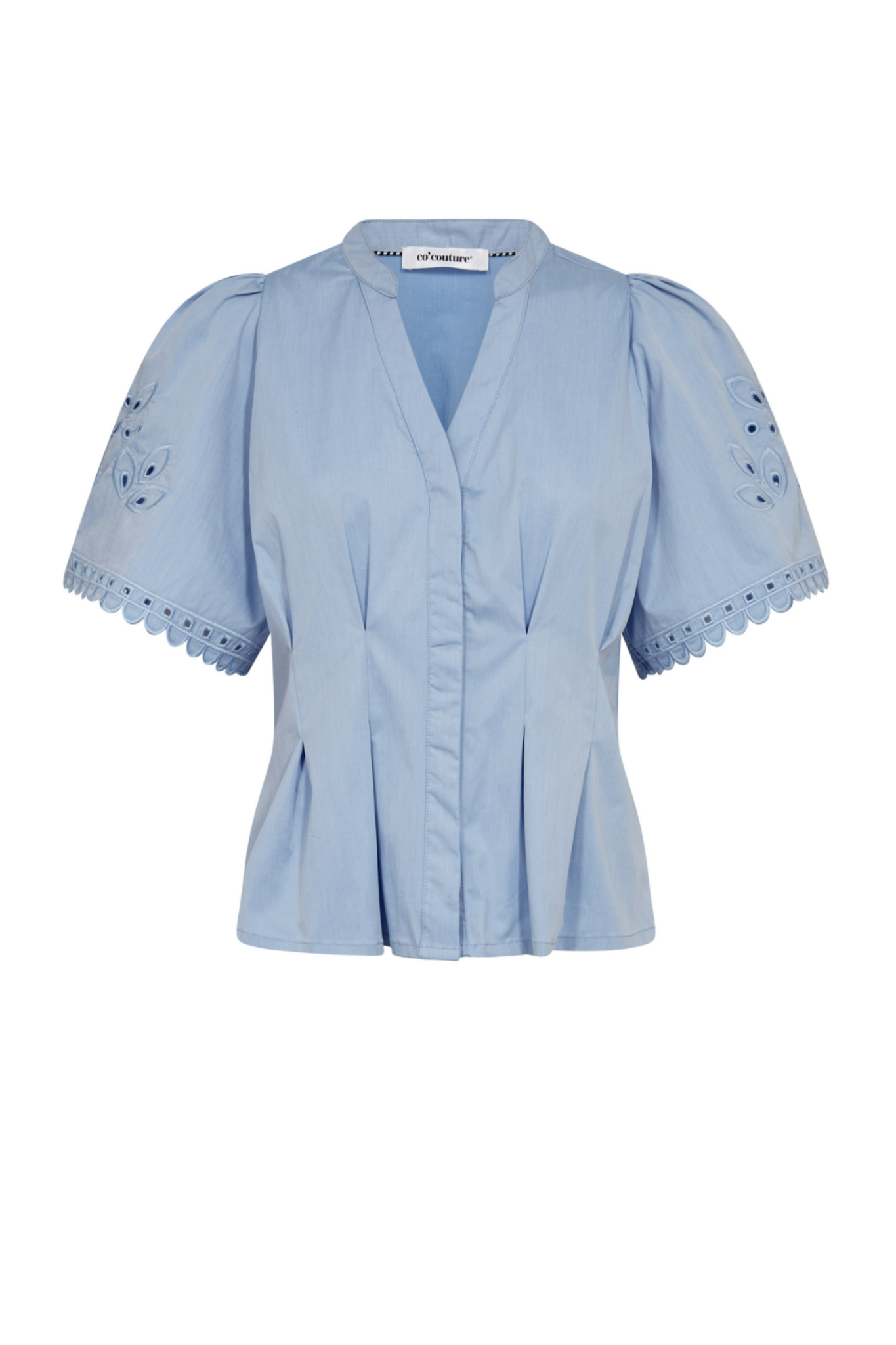 Het Poppy Embroderie V Shirt van Co’couture in Pale Blue is een getailleerde top met een ronde hals en V‑uitsnede. De korte pofmouwen zijn voorzien van verfijnde borduurdetails, terwijl de blinde knoopsluiting aan de voorkant zorgt voor een strakke, elegante afwerking. Perfect te combineren met broeken of rokken voor een vrouwelijke, stijlvolle look.