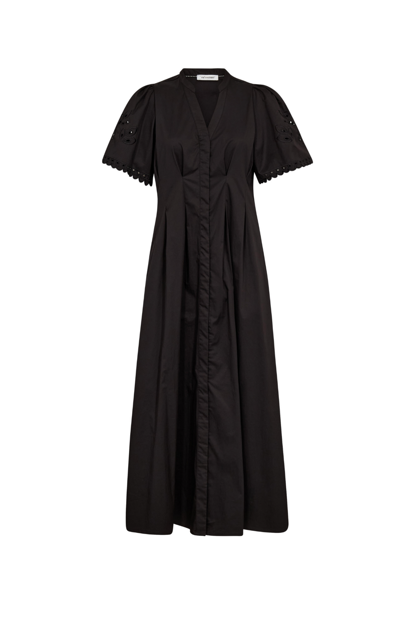 De Co'couture PoppyCC Emb Pleat Dress in Black is een verfijnde maxi-jurk die elegantie combineert met vrouwelijke details. Dit model is voorzien van een flatterende V-hals en een doordachte plooivorming rond de taille, wat zorgt voor een prachtig silhouet. De korte mouwen trekken de aandacht door het delicate ton-sur-ton borduursel en de golvende ajour-afwerking aan de randen.