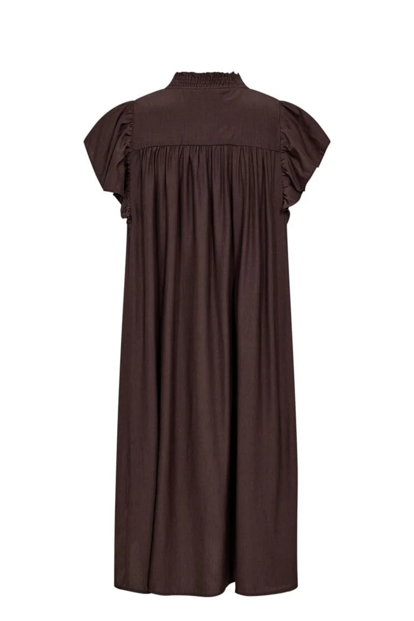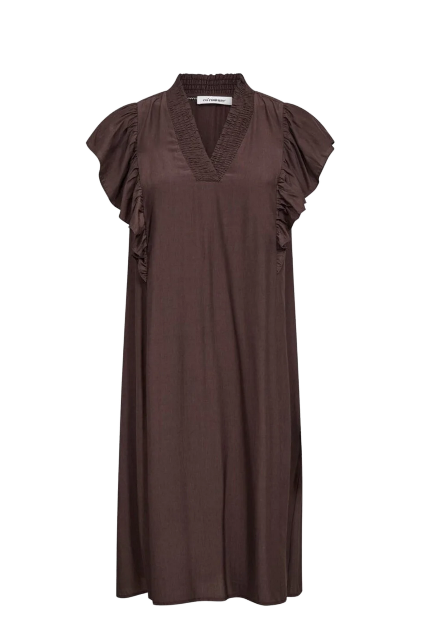 De Sunrise Frill Crop V-Dress van Co’Couture in Dark Brown is een jurk met een V-hals en een losvallende pasvorm. De jurk heeft korte kapmouwen met ruffles en een gesmokte elastische taille voor extra draagcomfort.