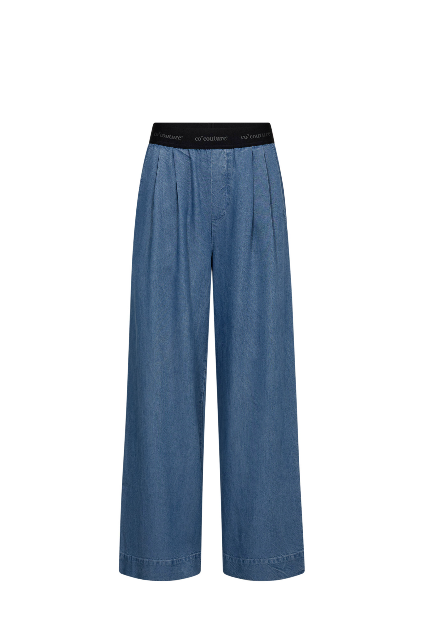 De Co'couture TillyCC Logo LL Pant in Denim Blue is een eigentijdse broek die een relaxte pasvorm combineert met sportieve details. Dit model is uitgevoerd in een soepele denim-look stof en onderscheidt zich door de brede, zwarte elastische tailleband met een subtiel ingeweven merklogo. De verticale plooien aan de voorzijde en de wijde, rechte pijpen zorgen voor een comfortabel en stijlvol silhouet dat perfect past in een moderne garderobe.