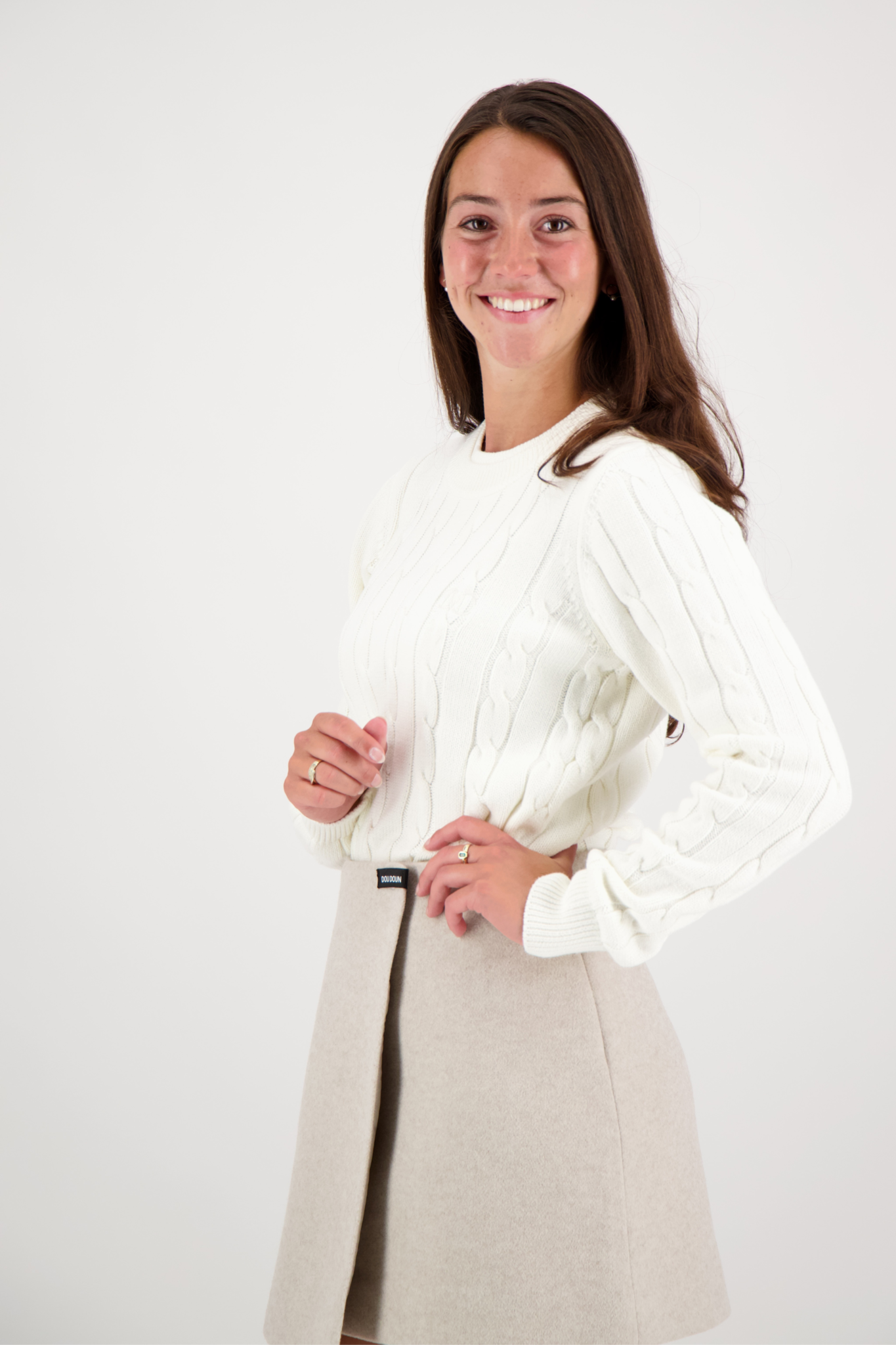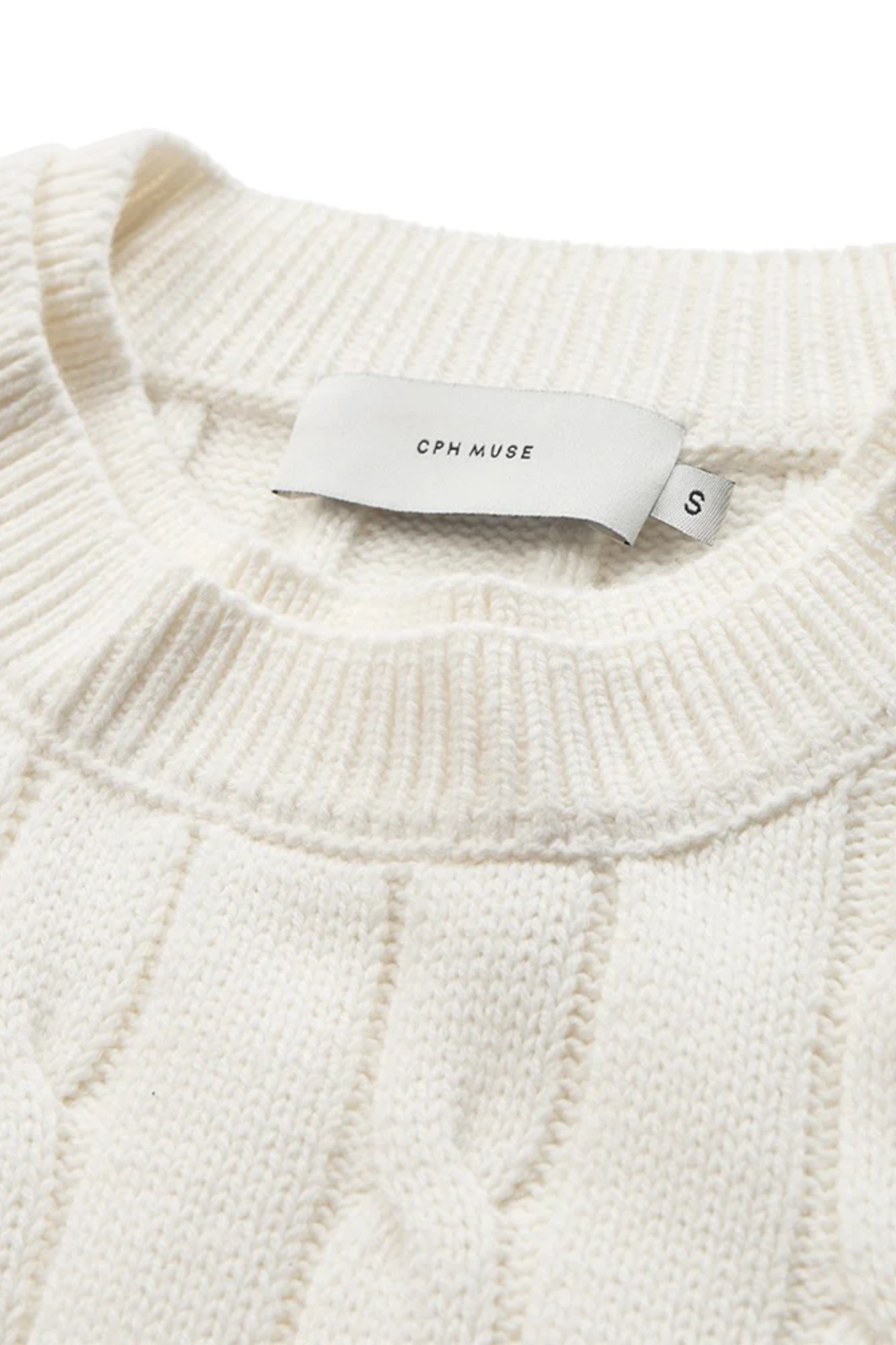 De Kotom Pullover van Copenhagen Muse is een gebreide kabeltrui van een zachte katoenmix. De trui heeft een normale pasvorm en is voorzien van een dubbele ronde hals en een subtiel logo detail op de borst. De geribde boorden zorgen voor een verzorgde afwerking.