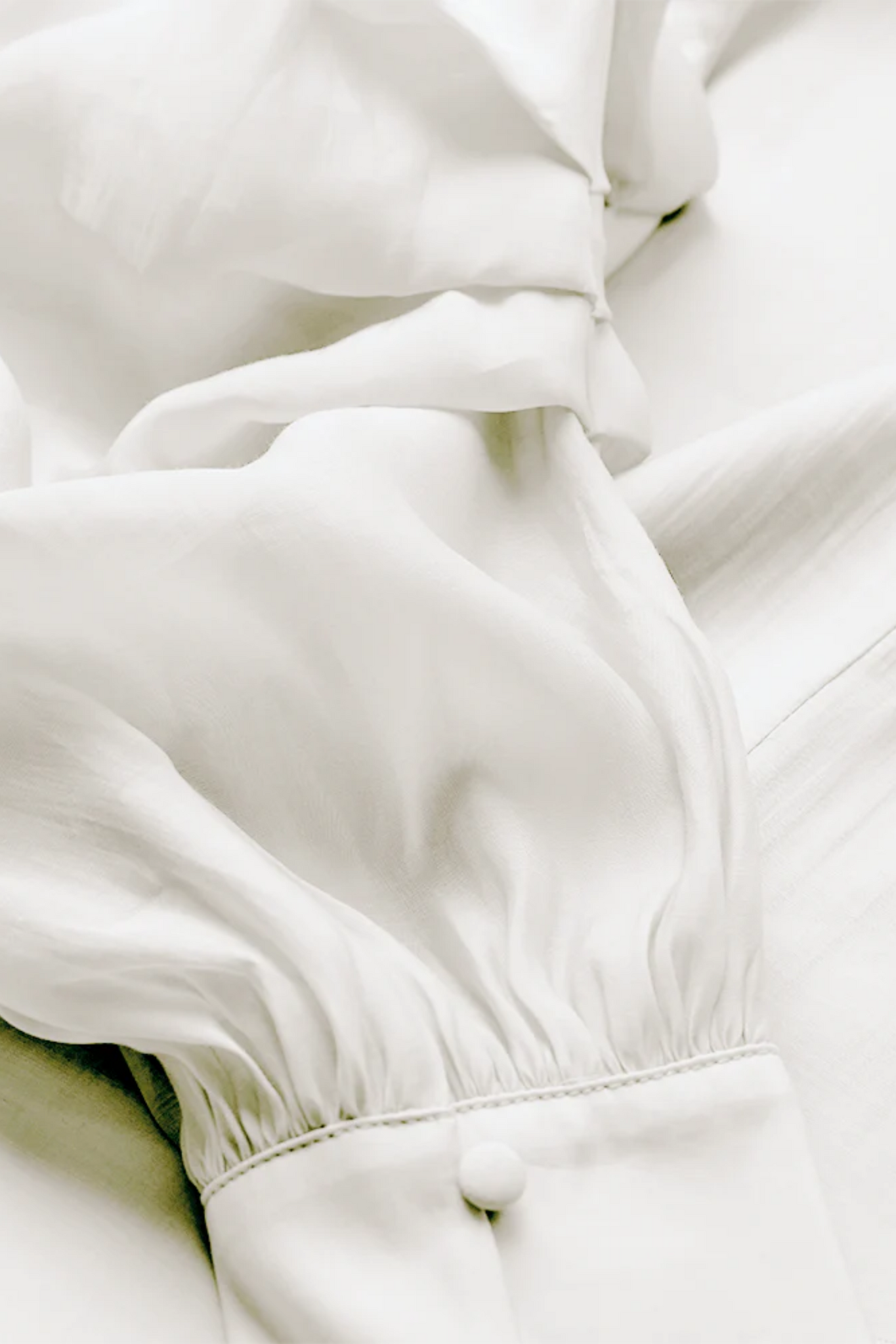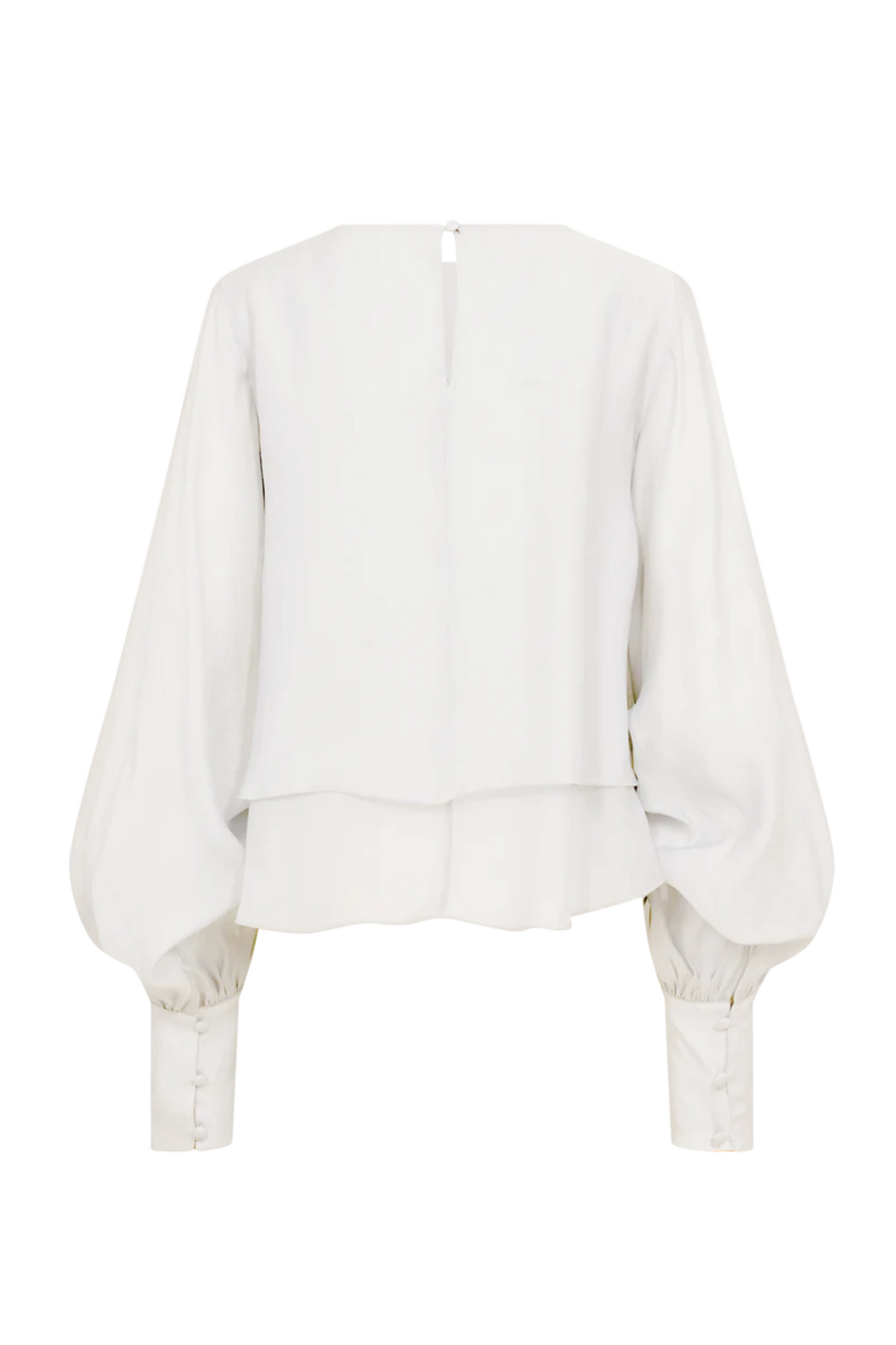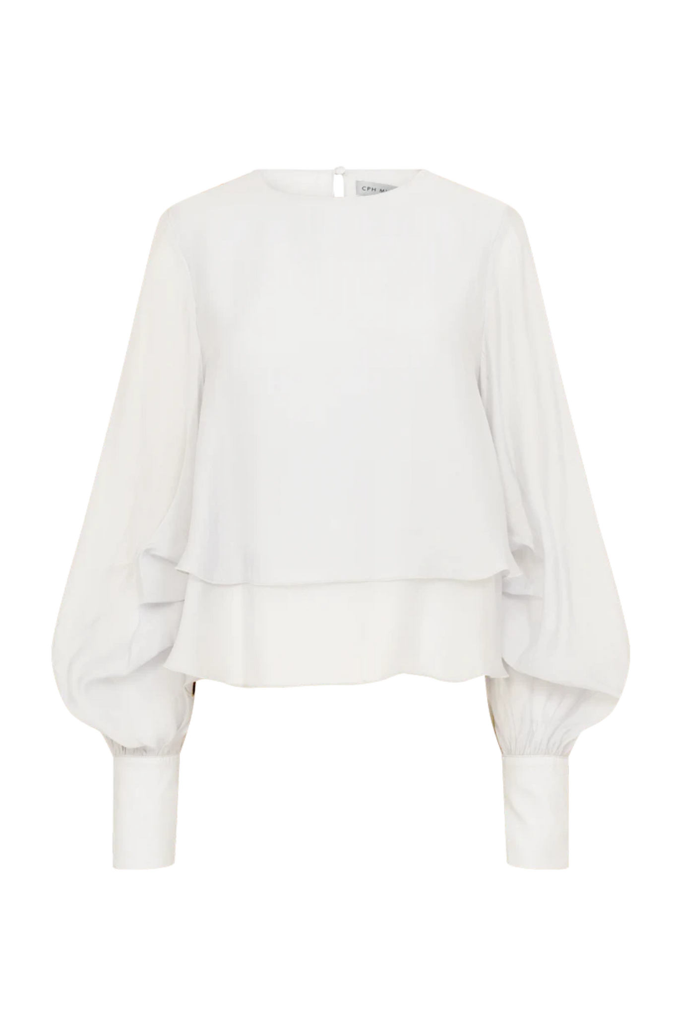 De Tilly Blouse van Copenhagen Muse is een blouse met een ronde hals en een verfijnde afwerking. De blouse heeft lange pofmouwen met een gebogen vorm en plooidetail aan de binnenkant. De manchetten zijn voorzien van drie knopen en de dubbele laag met subtiele ruffle zorgt voor extra detail.