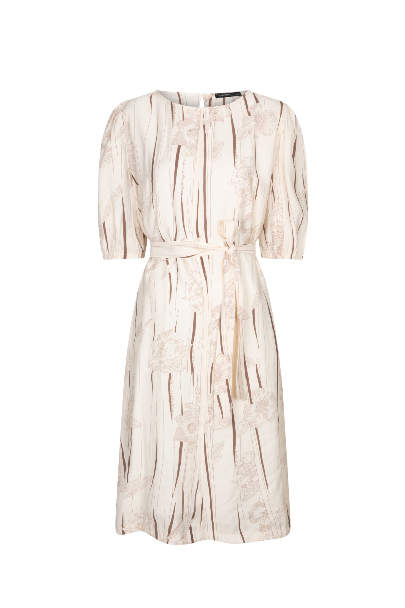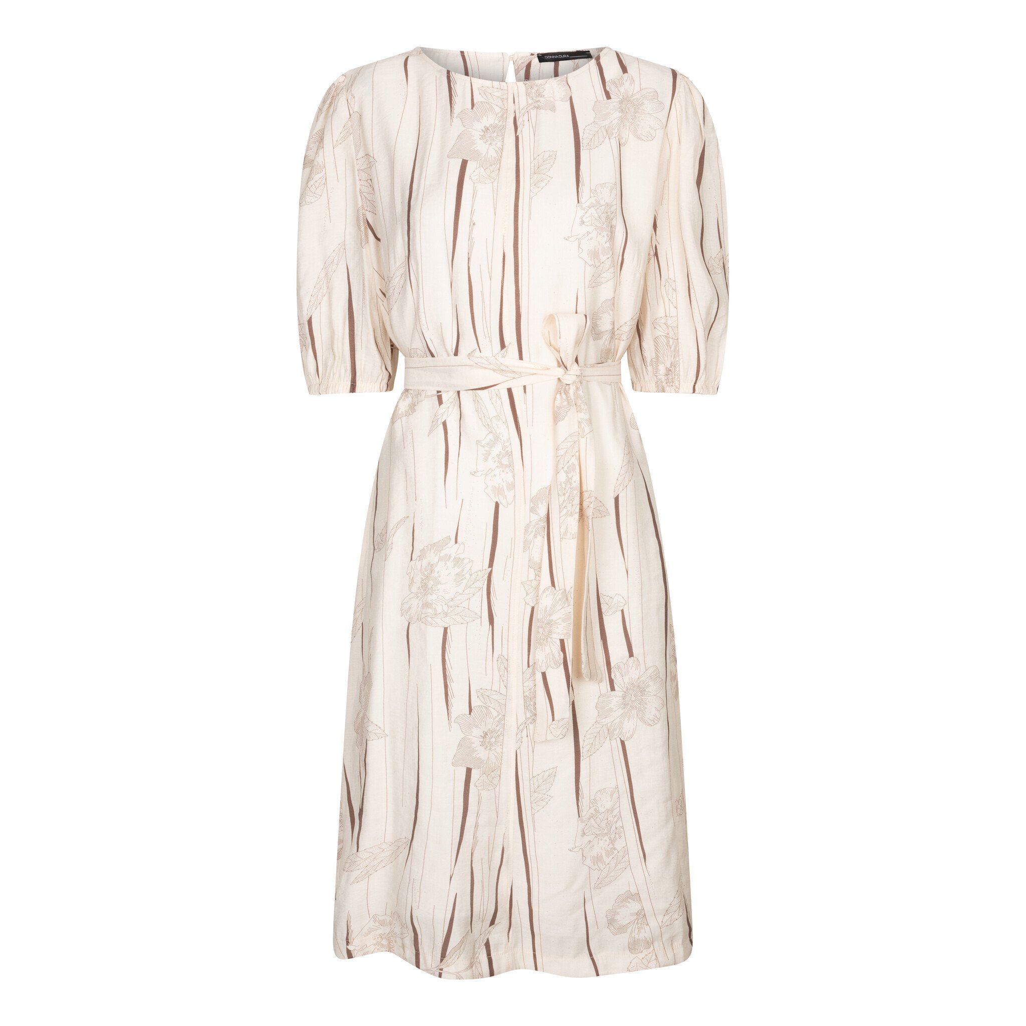 De Bloemen Jurk van Donna Dura is een elegante jurk in Créme met een vrouwelijke bloemenprint. Het model heeft een ronde hals, 3/4 mouwen, een ceintuur in de taille en een knoopsluiting aan de achterkant van de nek. Een comfortabele en stijlvolle jurk voor zowel casual als feestelijke gelegenheden.