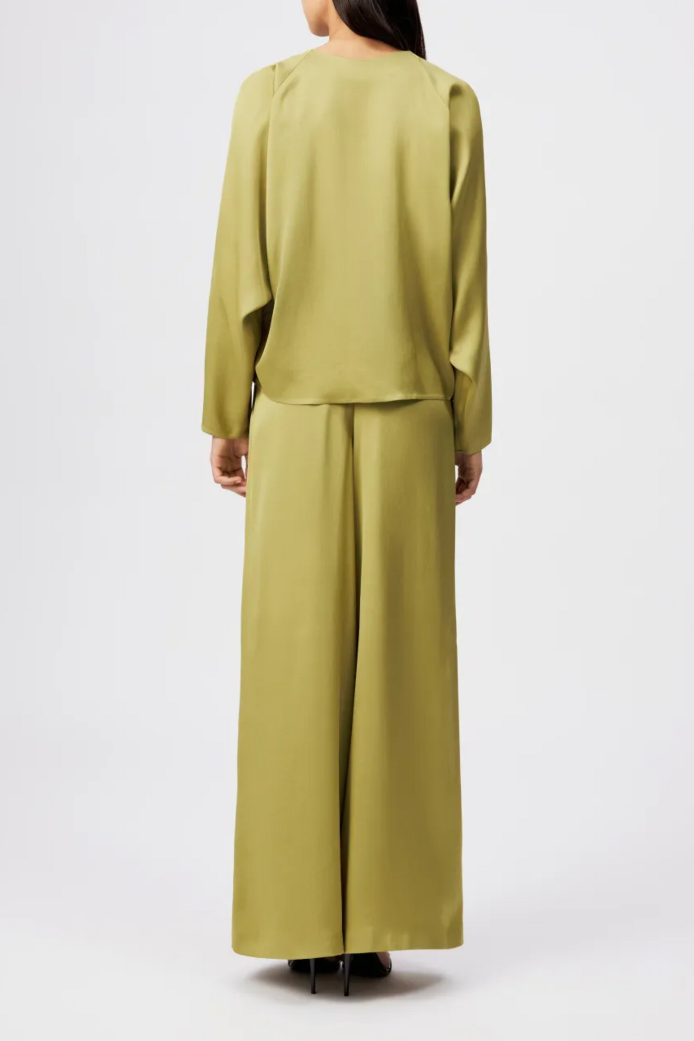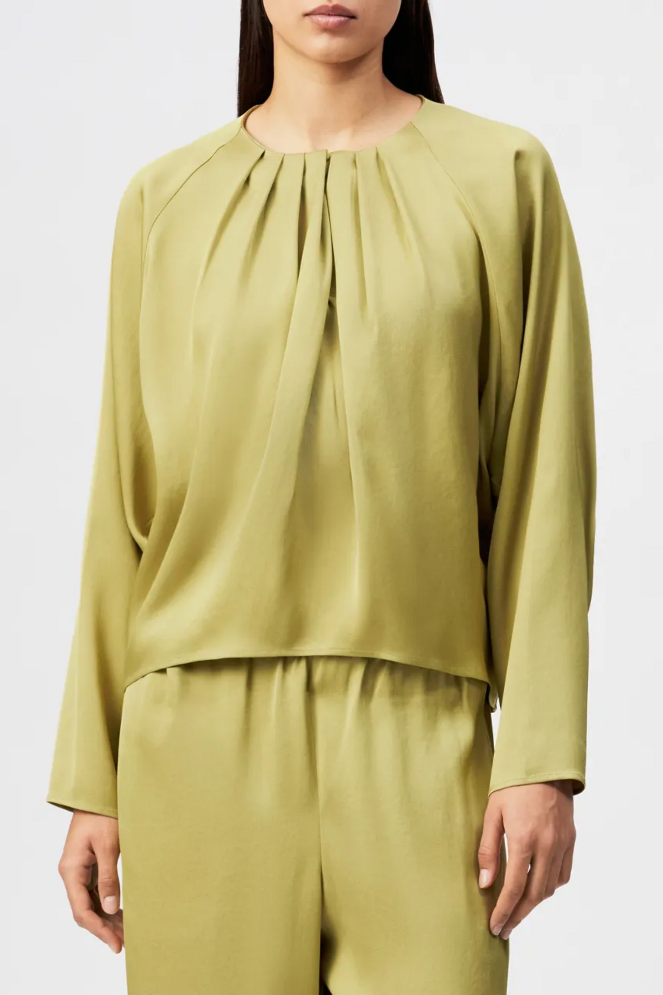 De Drykorn Harleen Blouse in Khaki is een minimalistische top met een luxueuze uitstraling en een modern silhouet. Deze blouse is vervaardigd uit een soepelvallende stof met een zijdezachte glans en kenmerkt zich door de verfijnde plooien die vanuit de ronde halslijn naar beneden vallen. De wijde mouwen en de boxy, kortere pasvorm geven het kledingstuk een eigentijdse en luchtige finish die moeiteloos combineert met zowel high-waist pantalons als rokken.