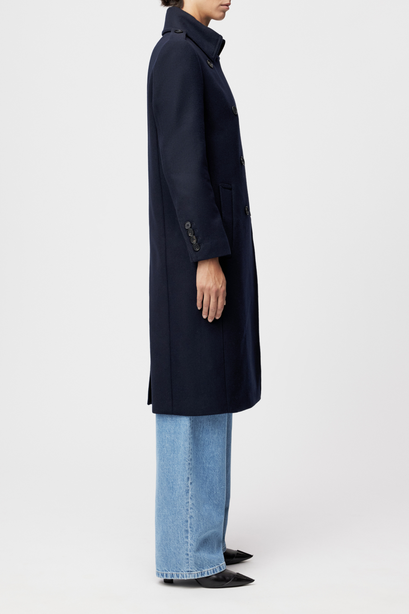De Piethill Military Coat van Drykorn is een enkellange jas in een marineblauwe kleur. De jas heeft een hoge kraag met een haaksluiting en een dubbele doorlopende knoopsluiting. Het item is voorzien van lange mouwen met klassieke manchetten, steekzakken in de zijden en knoopdetails op de schouders.