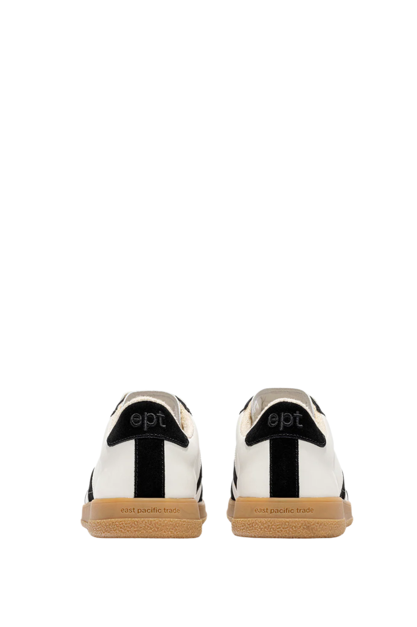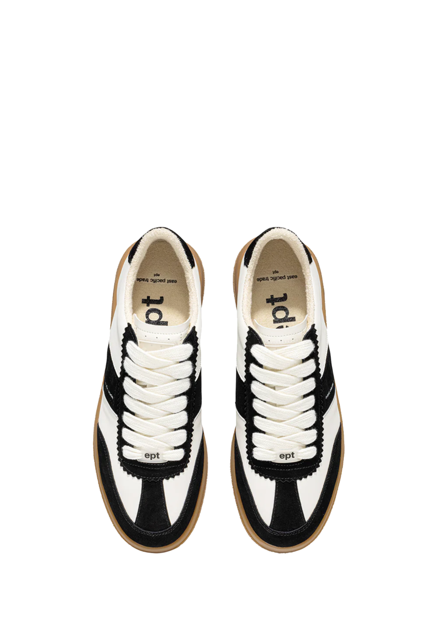 De Santos Sneaker van EPT Sneakers is een lage sneaker met een sportieve vetersluiting. Het model is uitgevoerd in wit leer en afgewerkt met zwarte suède accenten op de hiel en neus. De stevige zool zorgt voor een comfortabele en stabiele stap, perfect voor dagelijks gebruik.