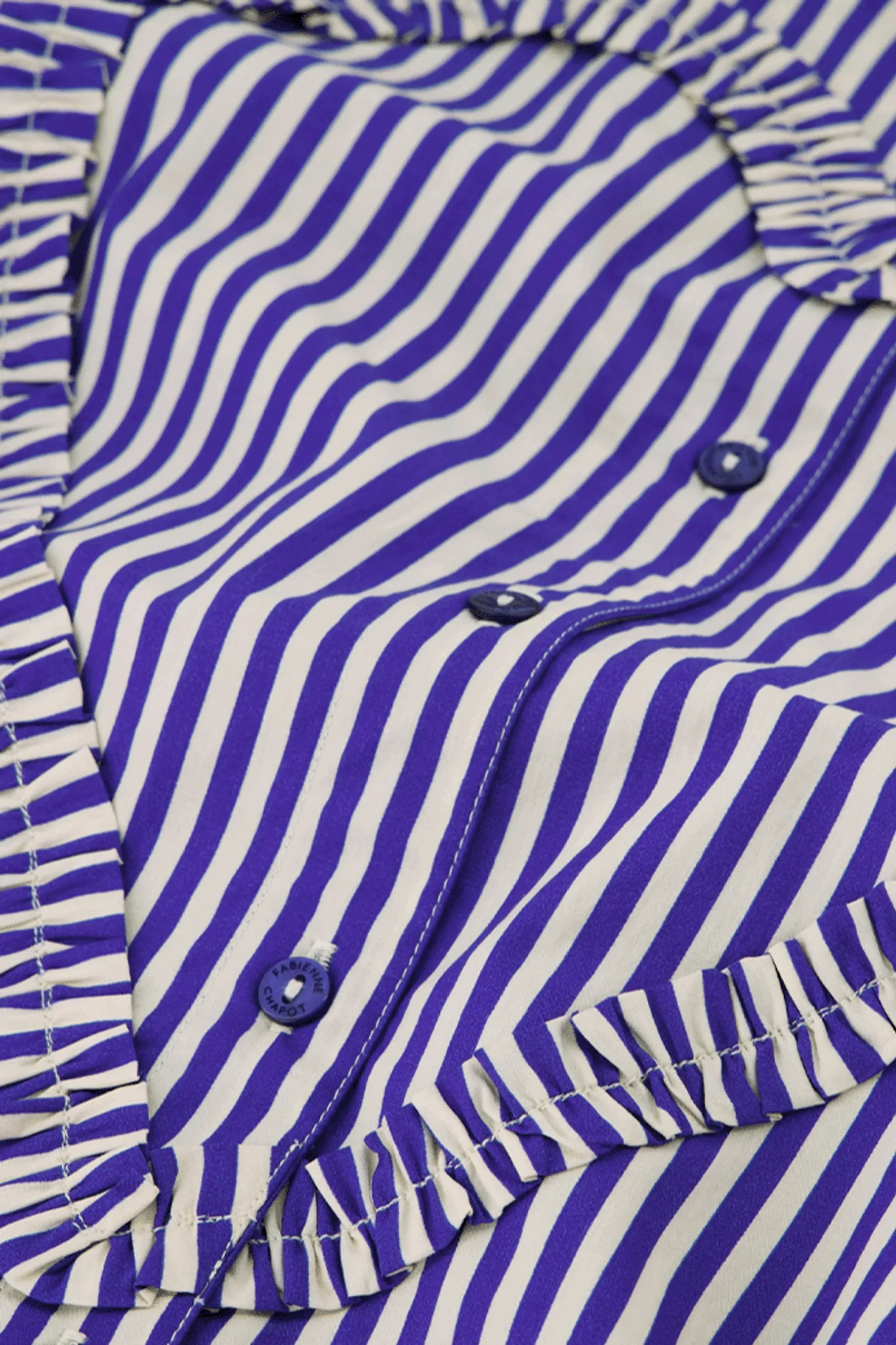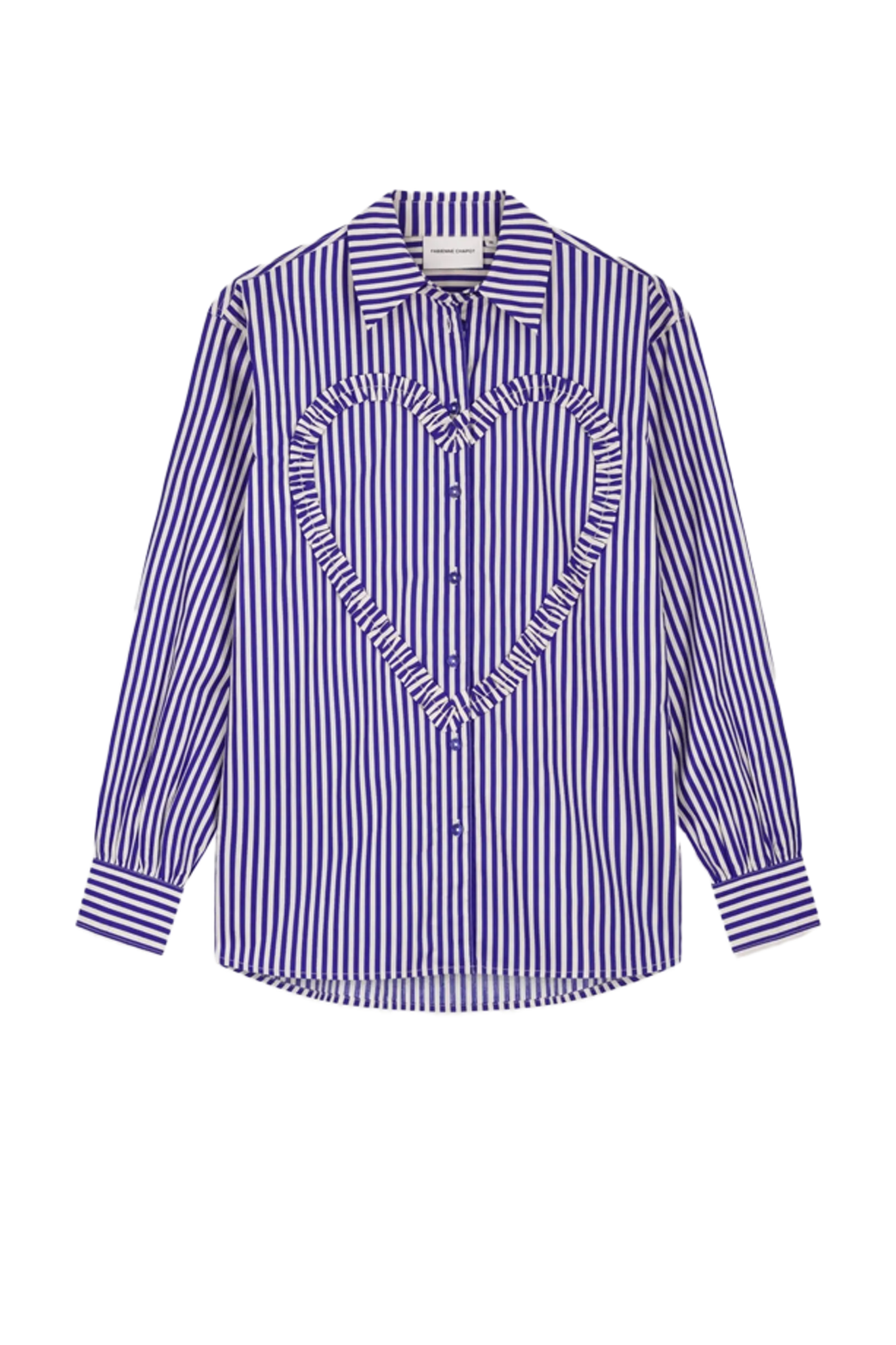 De Alex Heart Blouse van Fabienne Chapot is een stijlvolle blouse met hemdkraag, lange mouwen en knoopsluiting. De blouse is uitgevoerd met een subtiel streeppatroon en een hartvormig detail met ruffles op de borst, wat zorgt voor een speels en vrouwelijk accent