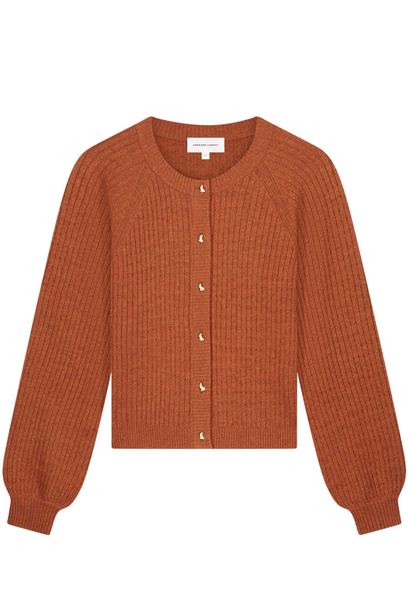 De Charlotta Cardigan van Fabienne Chapot is een klassiek gebreid vest in een warme kleur. Het vest heeft een normale pasvorm en een ronde hals. De sluiting bestaat uit opvallende, goudkleurige hartvormige knopen. De mouwen zijn licht gepoft en voorzien van ribboorden. Het vest heeft een subtiele ribstructuur over het hele item.