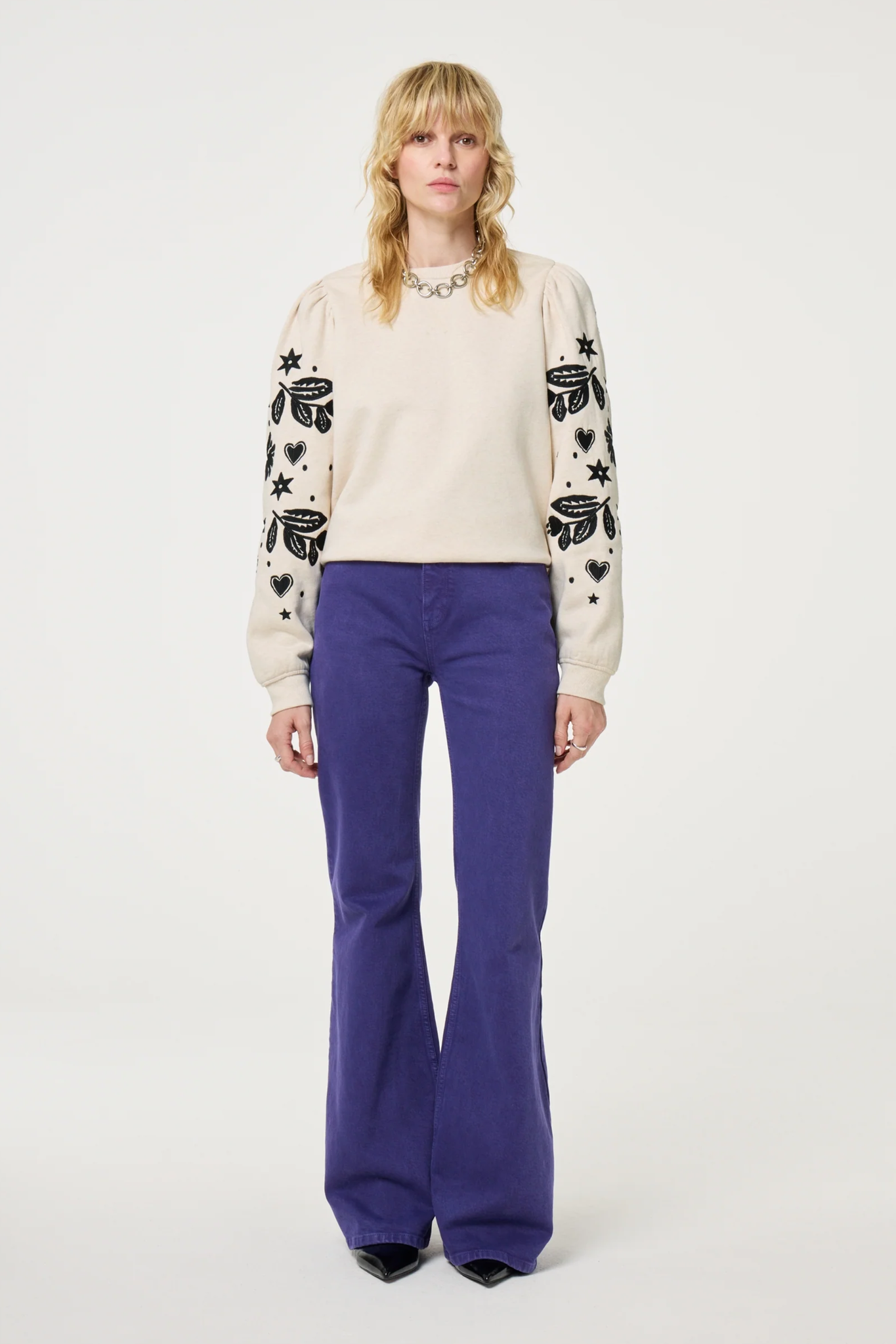 De Hanne Sweater van Fabienne Chapot is een zachte trui met ronde hals, lange pofmouwen en subtiele broderie details. Deze trui biedt hoog draagcomfort en is perfect te combineren met jeans, rokken of laagjes voor een vrouwelijk en stijlvol look.