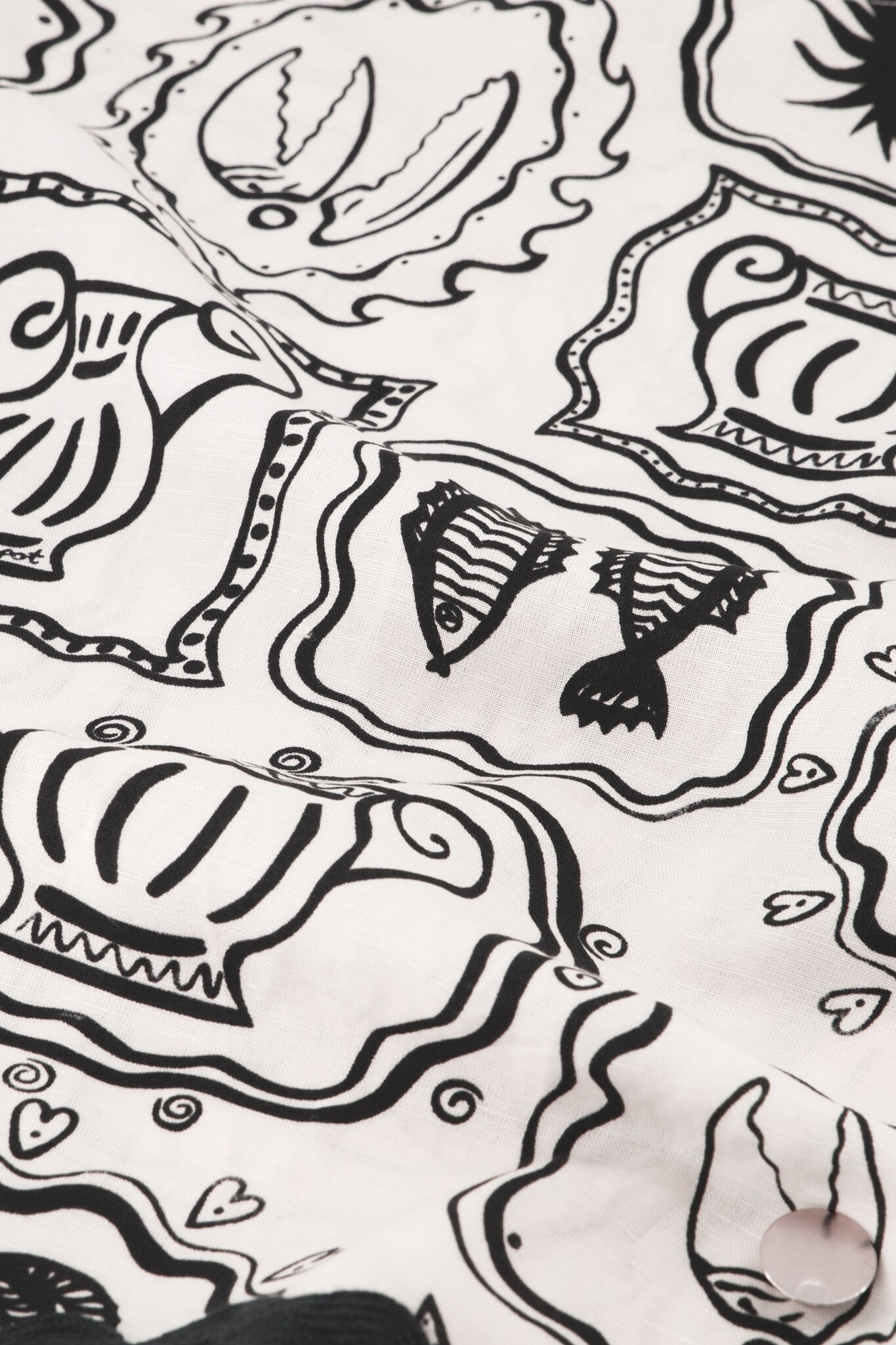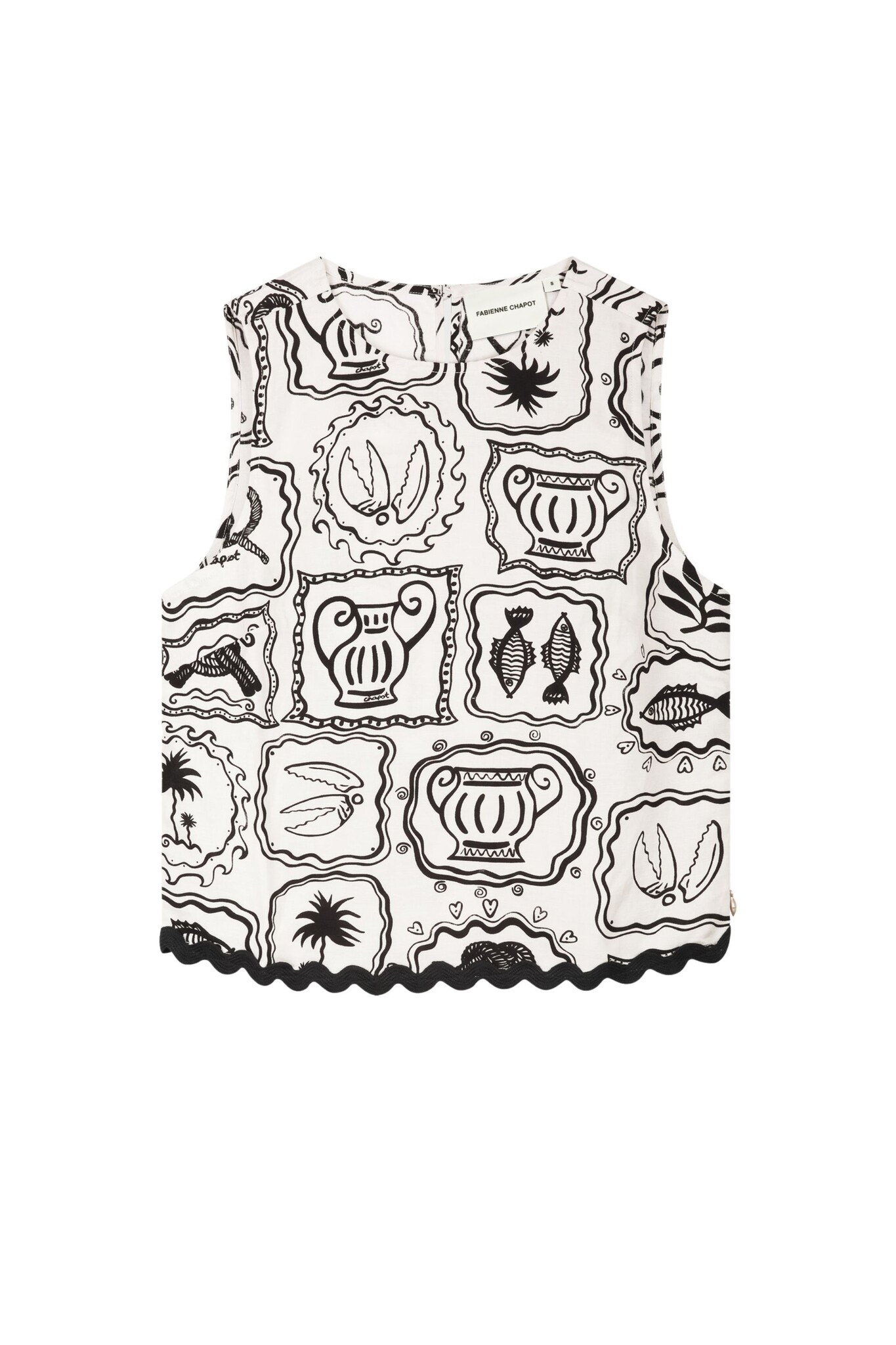 De Porto Top van Fabienne Chapot is een stijlvolle mouwloze top in de kleur Cosy White met een karakteristieke zwarte illustratieprint. Dit model heeft een elegante hoge, ronde halslijn en is aan de onderzijde afgewerkt met een opvallende zwarte ricrac-boord. Dankzij de verfijnde knoopsluiting aan de achterzijde is dit een artistiek item dat perfect gecombineerd kan worden voor een zomerse look.