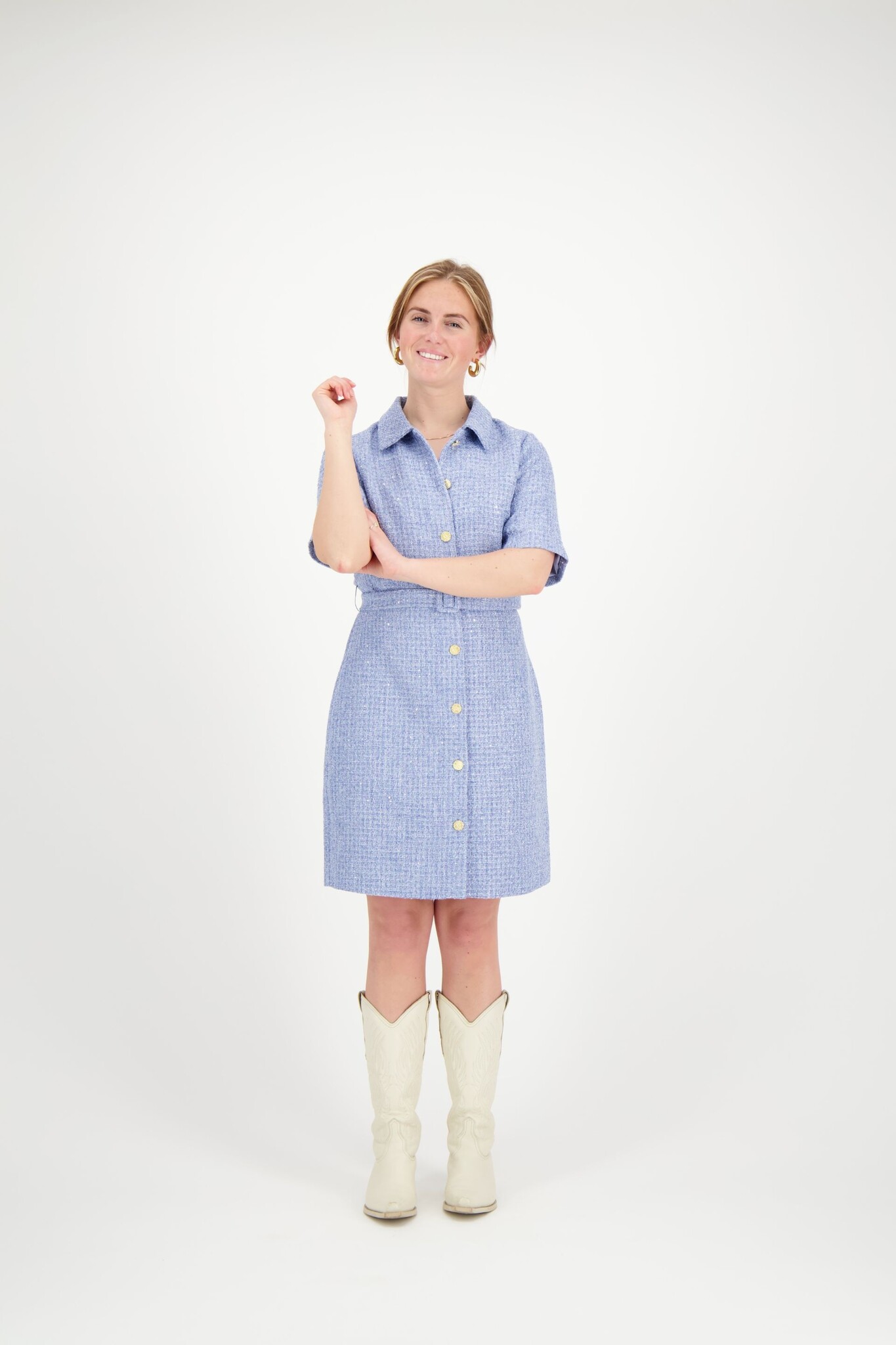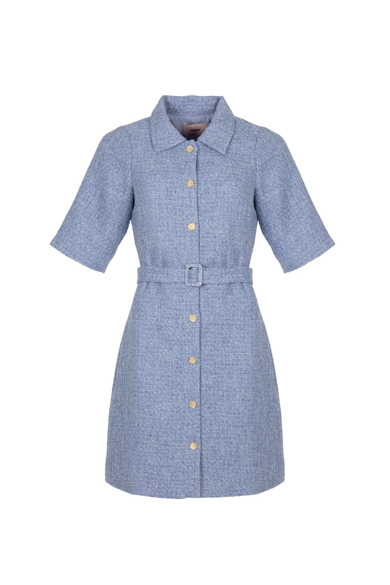 De Boucle Thin Dress van Freebird is een jurk met een blousekraag en een doorknoopsluiting aan de voorkant. Het model is voorzien van een bijpassende riem in de taille. De bouclé stof met lurex draad geeft de jurk een subtiele structuur.