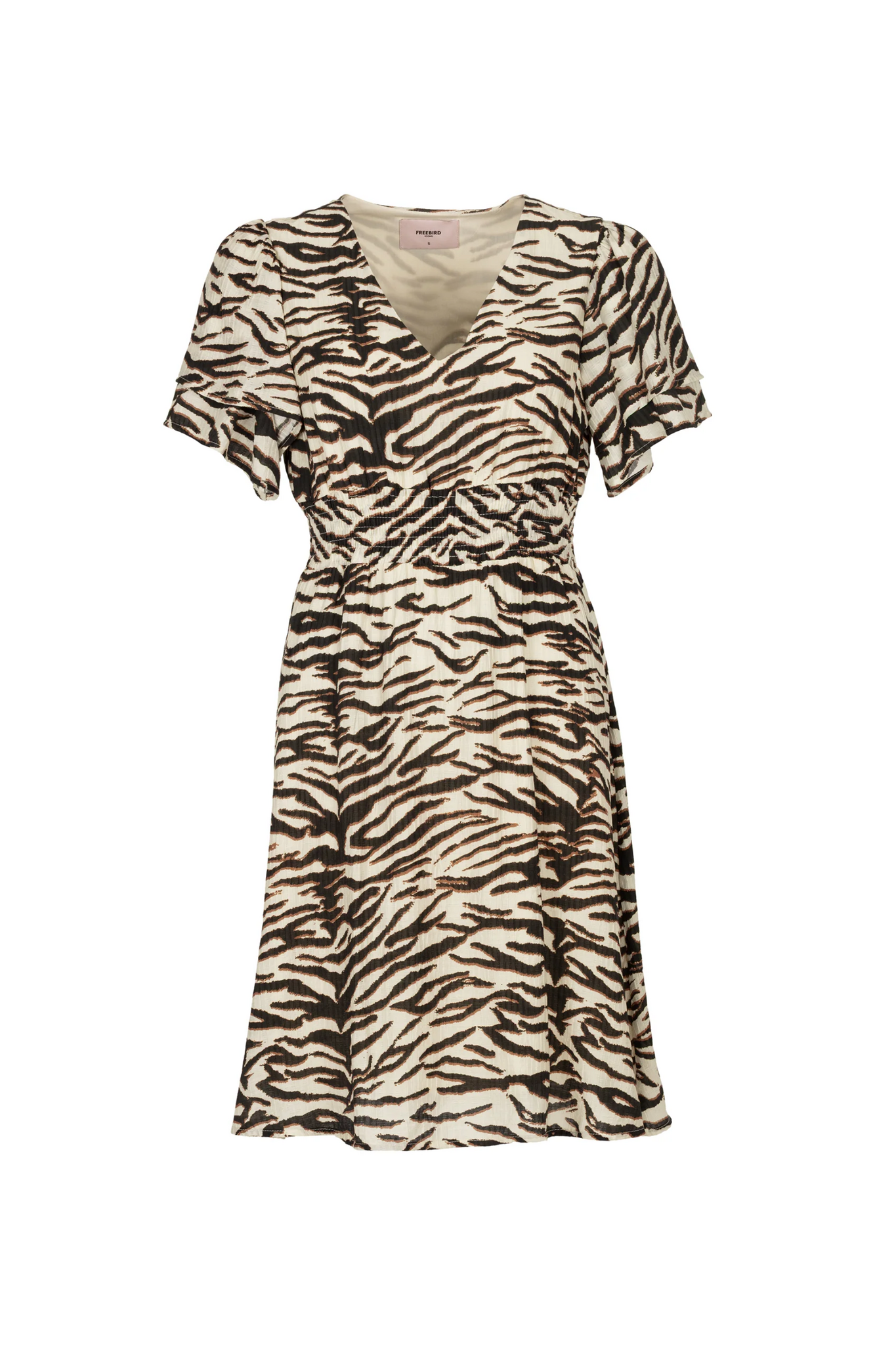 De Freebird Danic Dress in Fancy Animal is een zwierige en vrouwelijke jurk met een speelse zebraprint. Dit model heeft een flatterende V-hals, korte vlindermouwen en een elastische tailleband die het silhouet mooi accentueert. De jurk valt tot op de knie en is uitgevoerd in een soepele stof, wat zorgt voor een elegante en comfortabele look die geschikt is voor diverse gelegenheden.