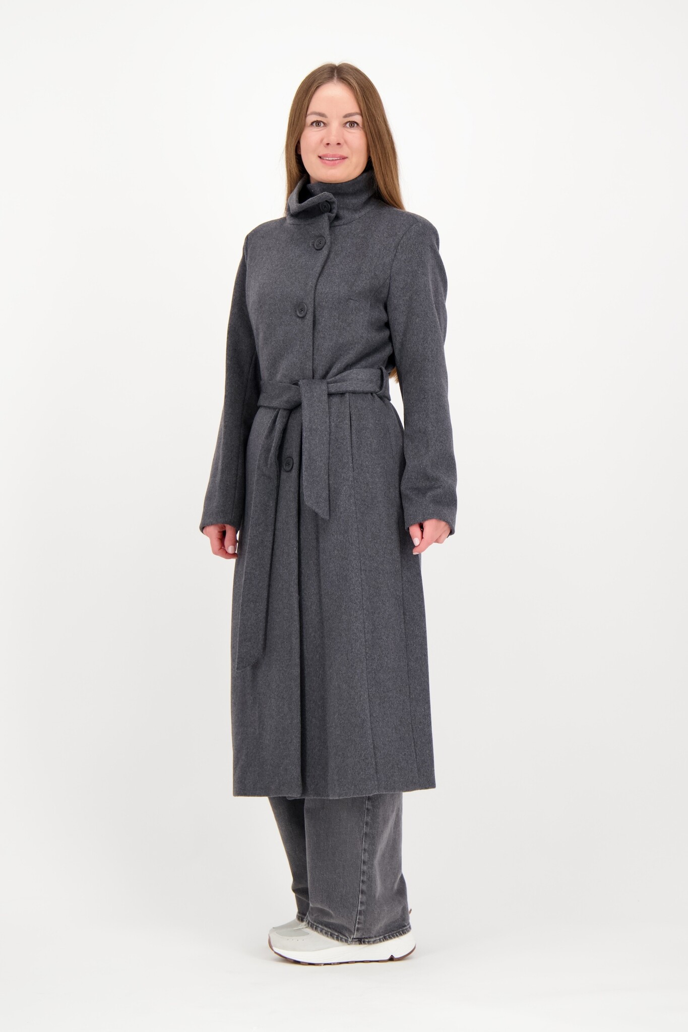 De Wool Blend Mantel van Giacomo is een stijlvolle en warme jas in een diepe 'Antra' (antraciet) kleur. De jas heeft een dramatische maxi lengte en is gemaakt van een hoogwaardige wolmix. Het design is voorzien van een klassieke kraag en een unieke schuine doorlopende knoopsluiting. Met het bijpassende ceintuur accentueer je de taille. De lange mouwen en praktische steekzakken maken dit een elegante en complete winterjas.
