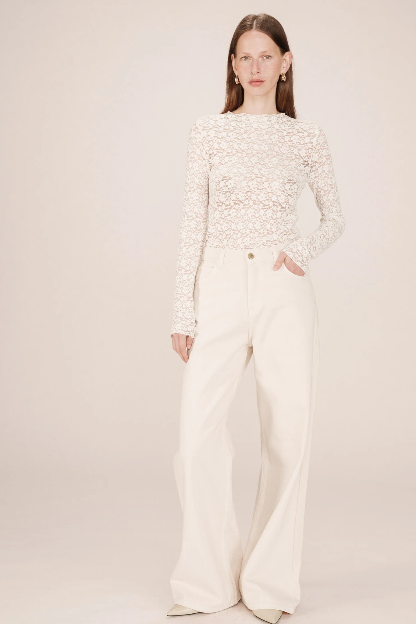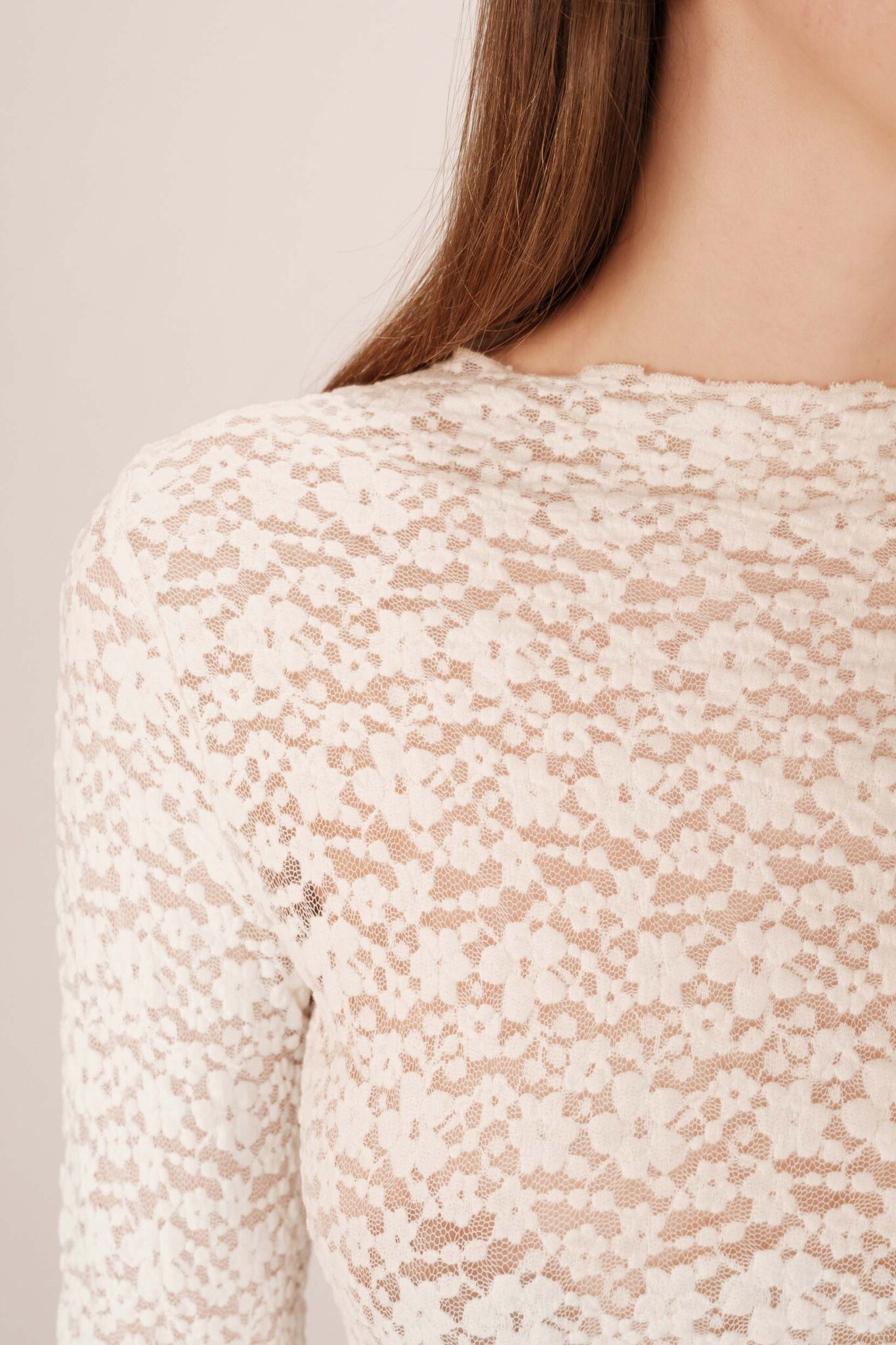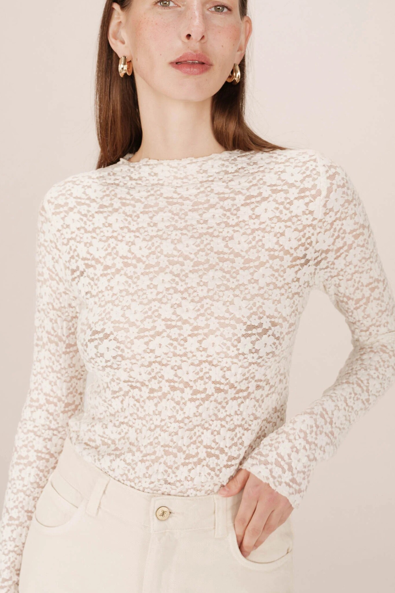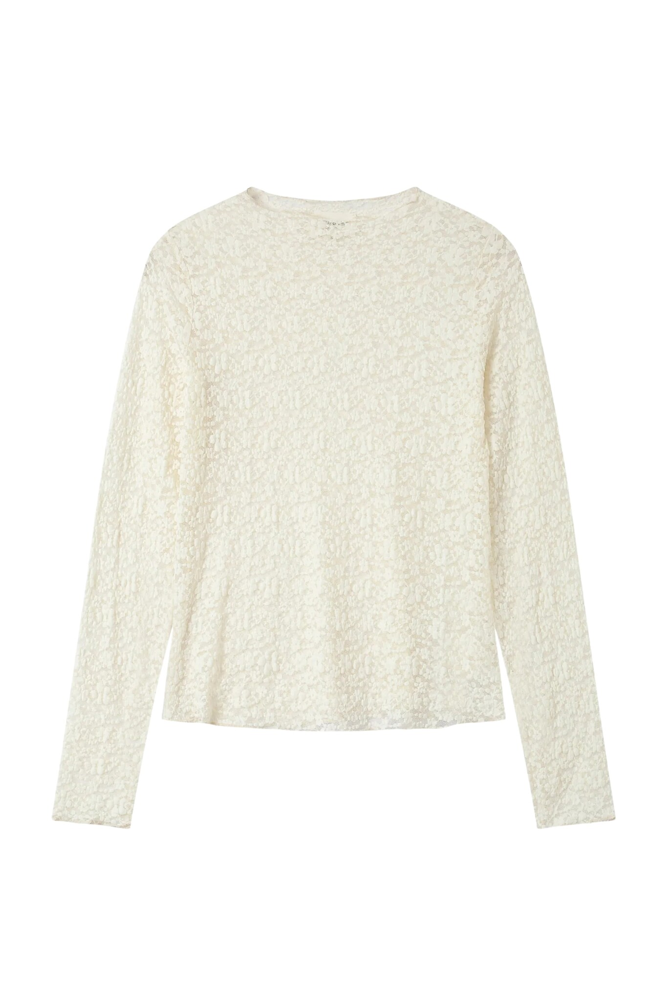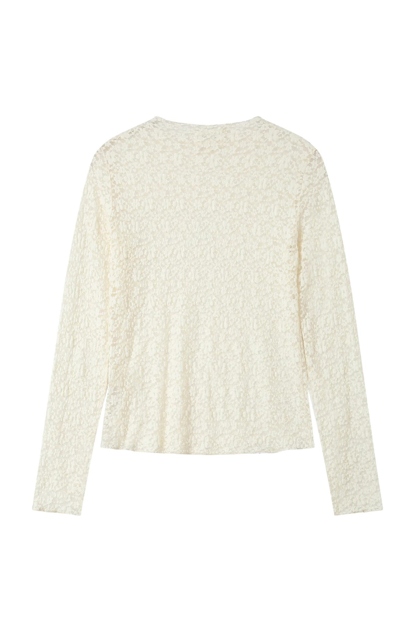 De Shady Top van Grace & Mila is een romantische en gedetailleerde top. Dit item in zacht Ecru is gemaakt van een delicate kanten stof en heeft een chique verfijnde print in de stof, wat zorgt voor een elegante textuur. De top heeft een klassieke ronde hals en lange mouwen. Door het verfijnde kant en de ronde hals is dit een perfecte top voor een gelaagde look onder een blazer of vest, of als elegante basic.