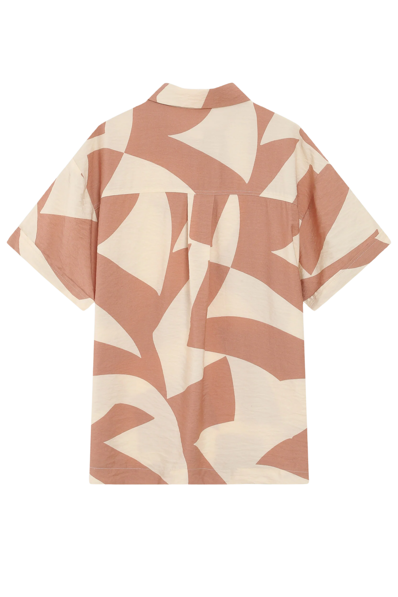 De Veni Blouse van Grace & Mila in Mocha is een oversized blouse met een boxy pasvorm en korte mouwen. De blouse heeft een klassieke blousekraag en een knoopsluiting aan de voorzijde. De grafische print en de luchtige stof maken het een comfortabel item dat perfect te combineren is met de bijpassende broek.