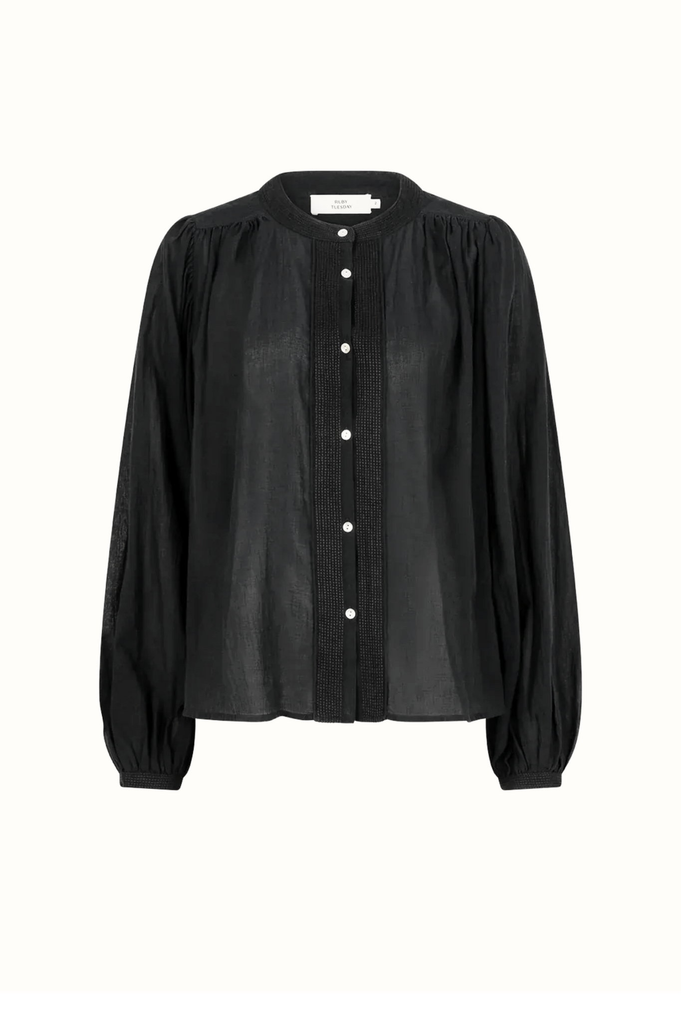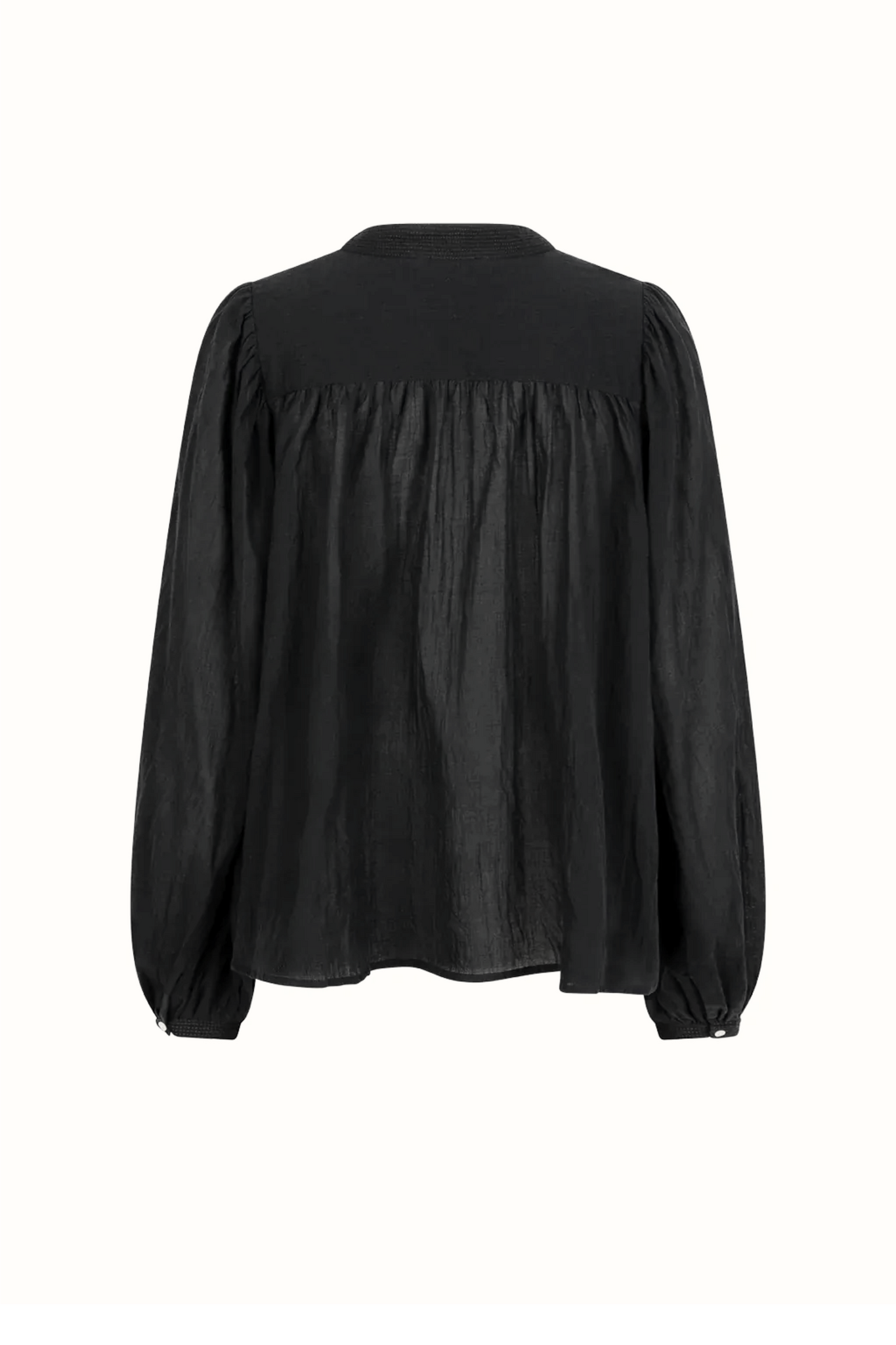 De Ruby Tuesday Illiez Blouse in Anthracite is een verfijnde top met een romantische en luchtige uitstraling. Dit model valt op door de rijke rimpeldetails rond de halslijn en schouders, die zorgen voor een elegant volume in de lange mouwen. De blouse is afgewerkt met een verfijnde knoopsluiting aan de voorzijde en een subtiele structuur in de stof, wat het een tijdloos item maakt voor elke gelegenheid.