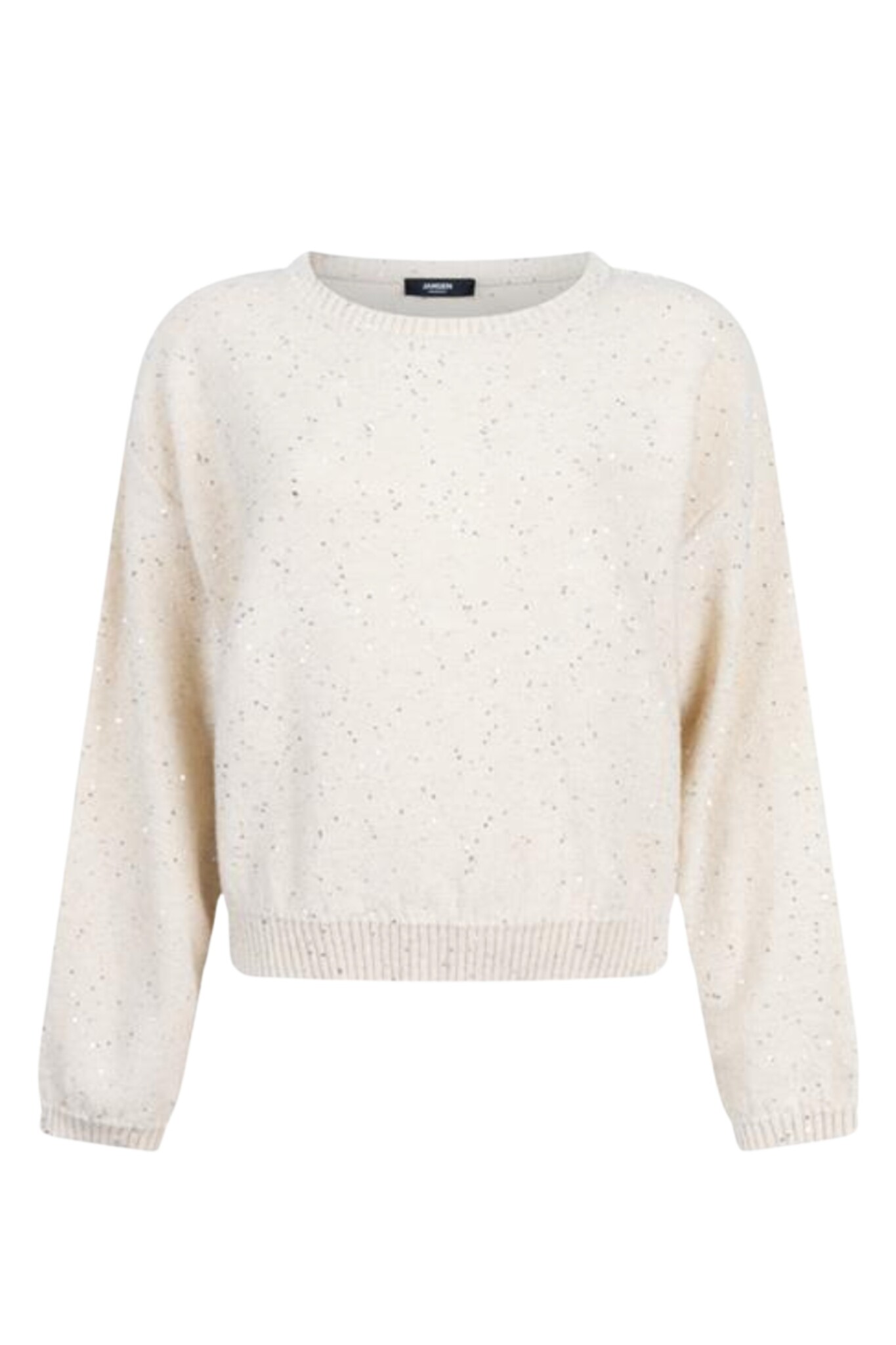 De Anouk Sweater van Jansen Amsterdam is een comfortabele en feestelijke trui. Deze trui in het frisse Off White heeft een comfortabele ronde hals en een relaxed fit. Het item is verrijkt met subtiele glitters over de trui heen, wat zorgt voor een sprankelende en chique uitstraling. De trui heeft lange mouwen en is afgewerkt met nette geribde boorden bij de hals, mouwen en zoom.