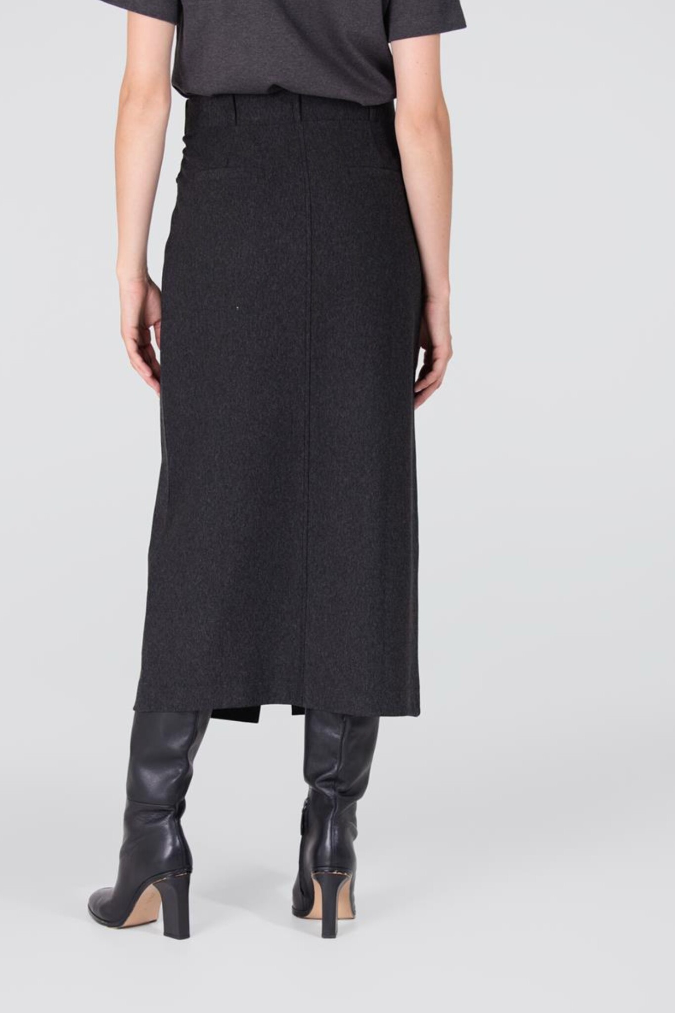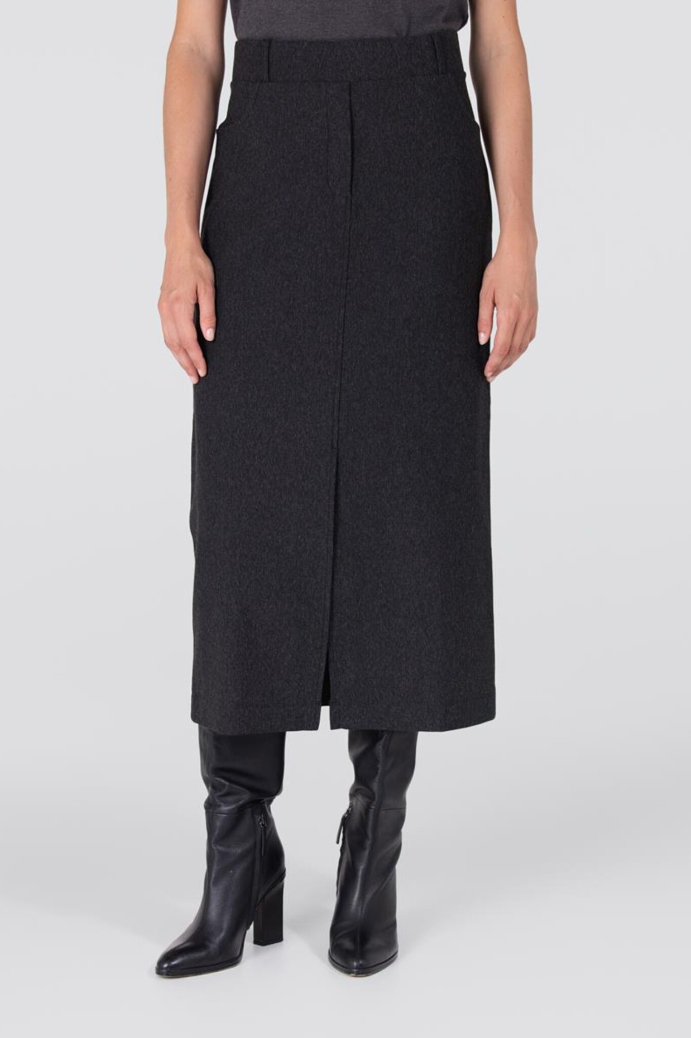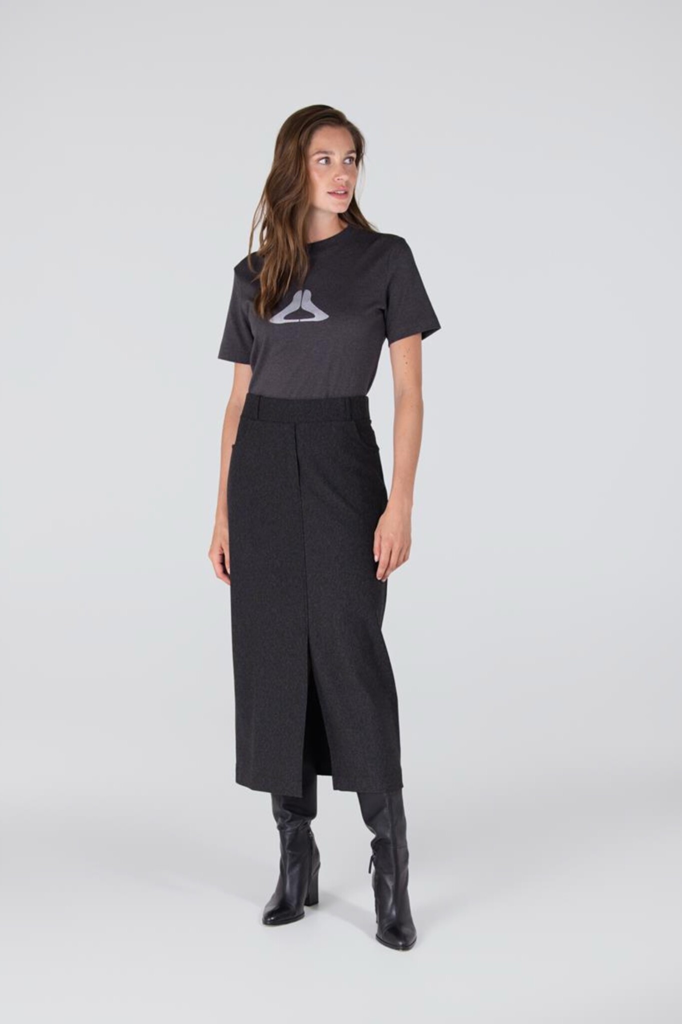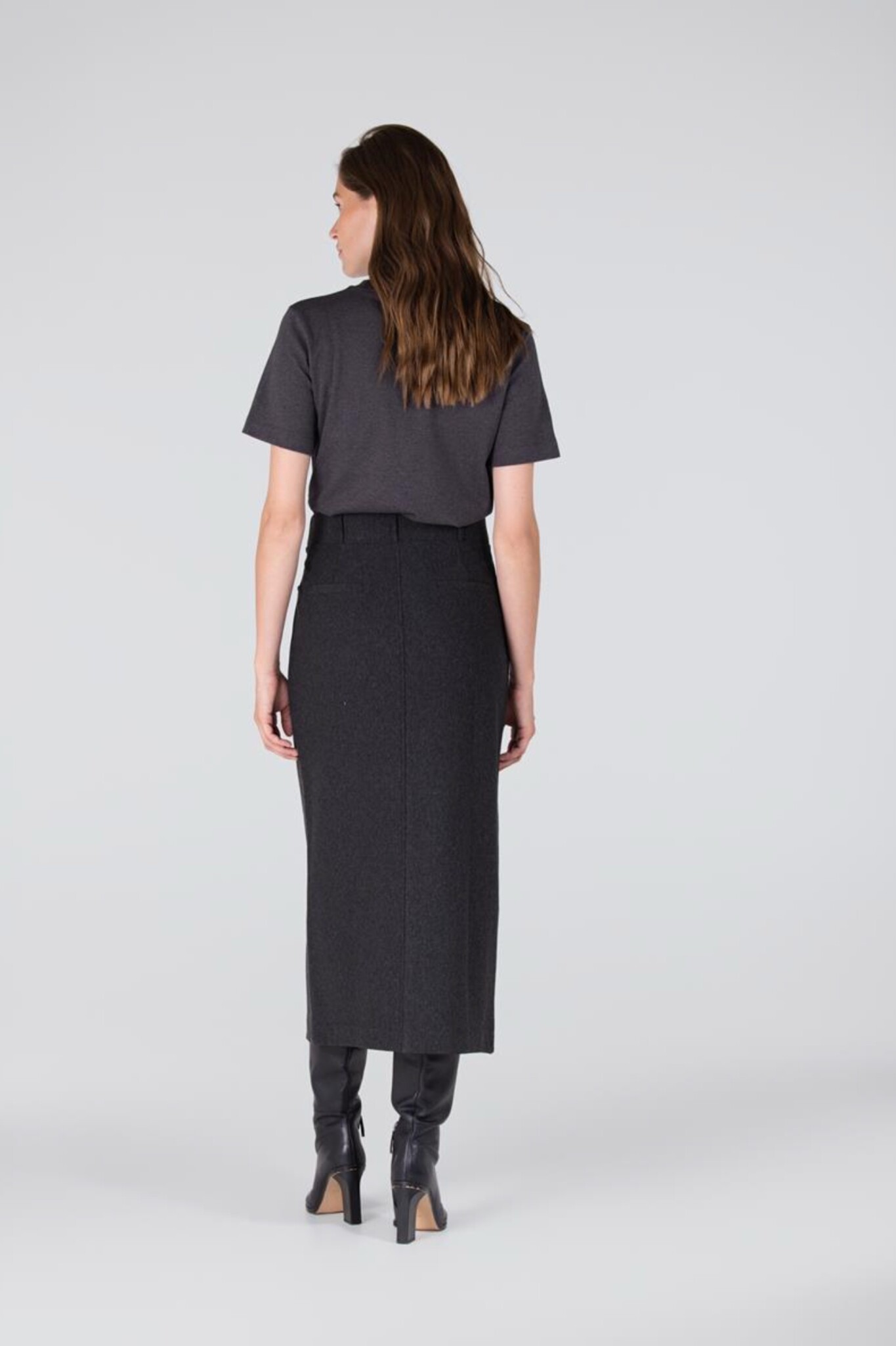De Georgie Rok van Jansen Amsterdam is een comfortabele en chique basic. Deze rok in elegant Antraciet heeft een rechte pasvorm en valt tot op de enkellengte. De rok is ontworpen voor draagcomfort met een elastische taille en is voorzien van riemlussen en praktische steekzakken. Een subtiele halve split aan de voorzijde zorgt voor extra bewegingsvrijheid en een vrouwelijke touch.