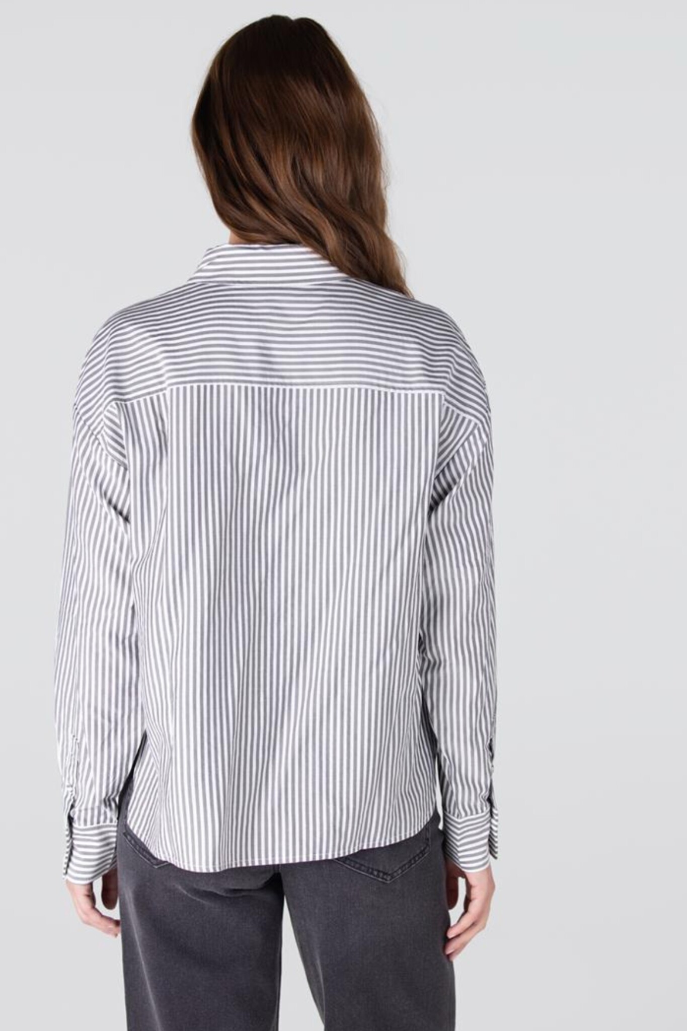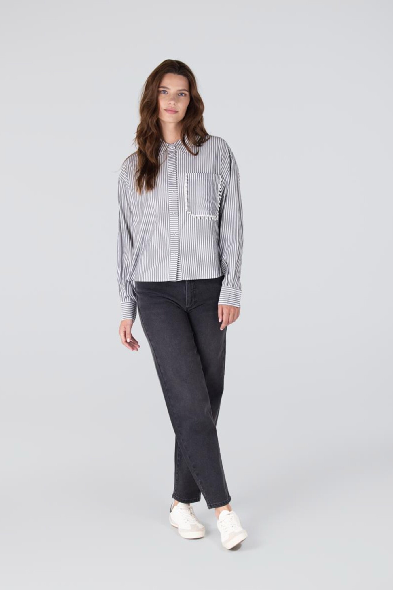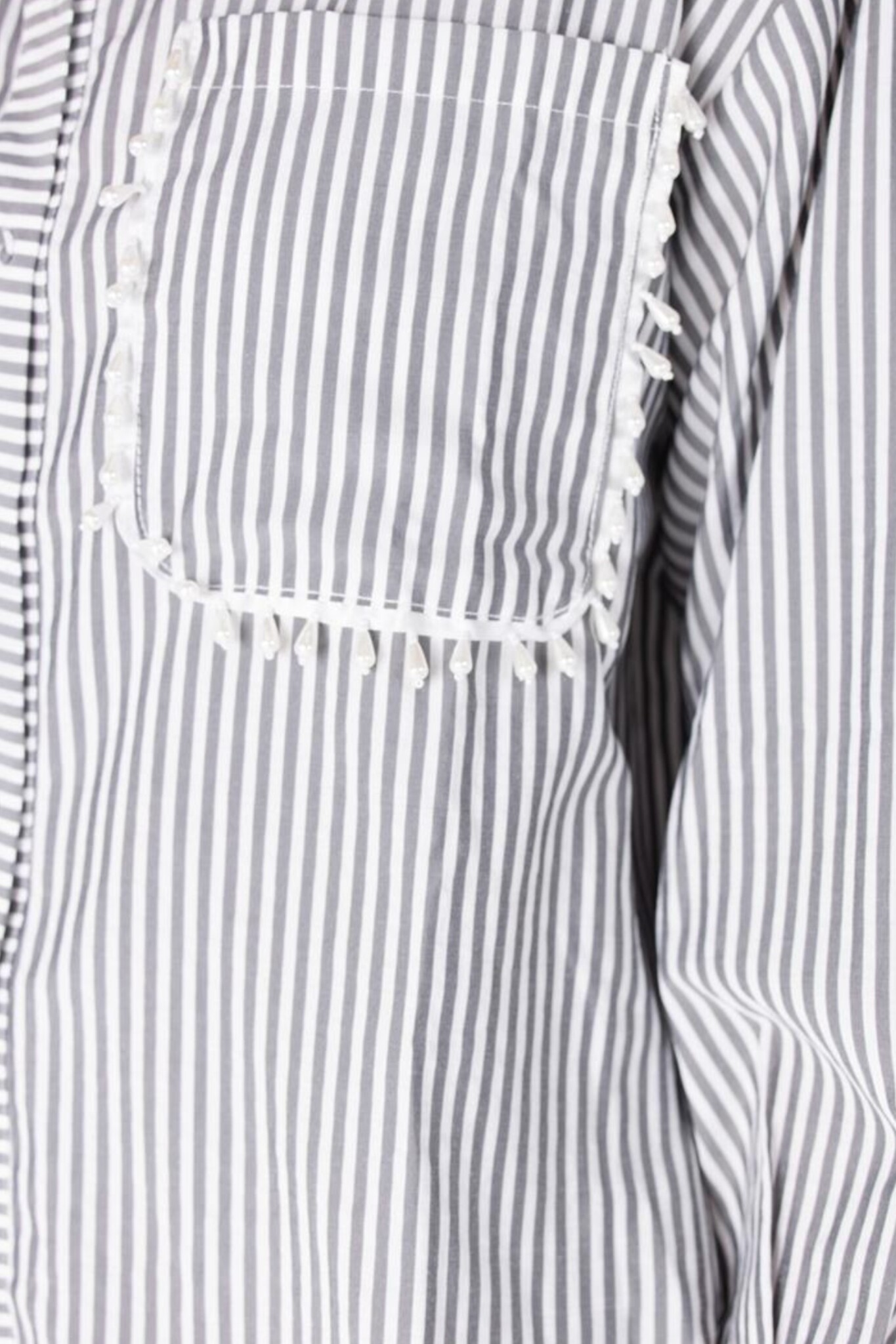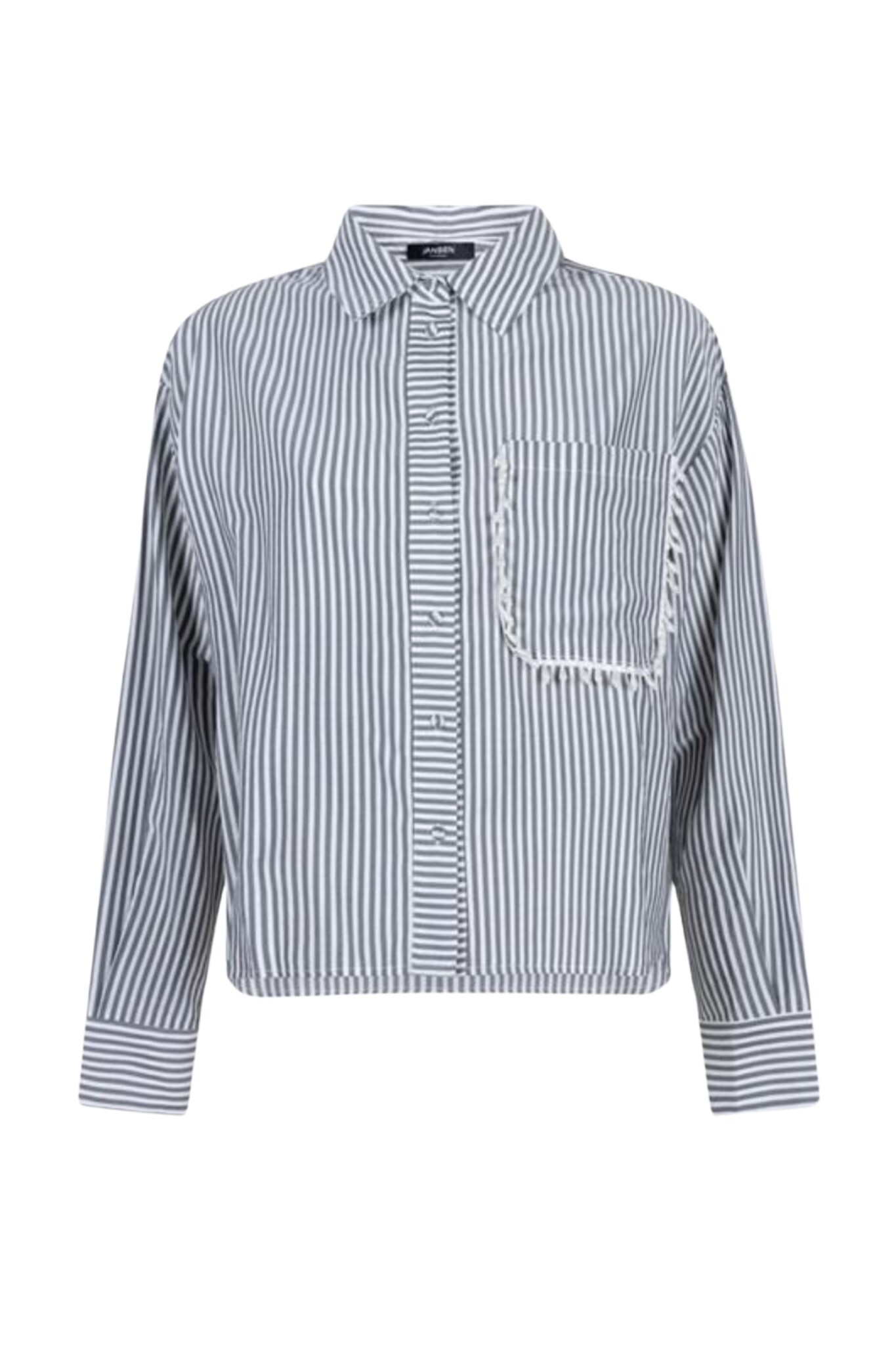 De Ginger Blouse van Jansen Amsterdam is een klassieke blouse met een opvallend detail. De blouse in elegant Antraciet heeft een subtiele strepenprint en is voorzien van een traditionele kraag en een doorlopende knoopsluiting aan de voorzijde. De lange mouwen maken het item geschikt voor diverse seizoenen. Een uniek kenmerk is de steekzak op de borst die elegant is afgewerkt met parels langs de naad, wat een chique en vrouwelijke touch toevoegt.