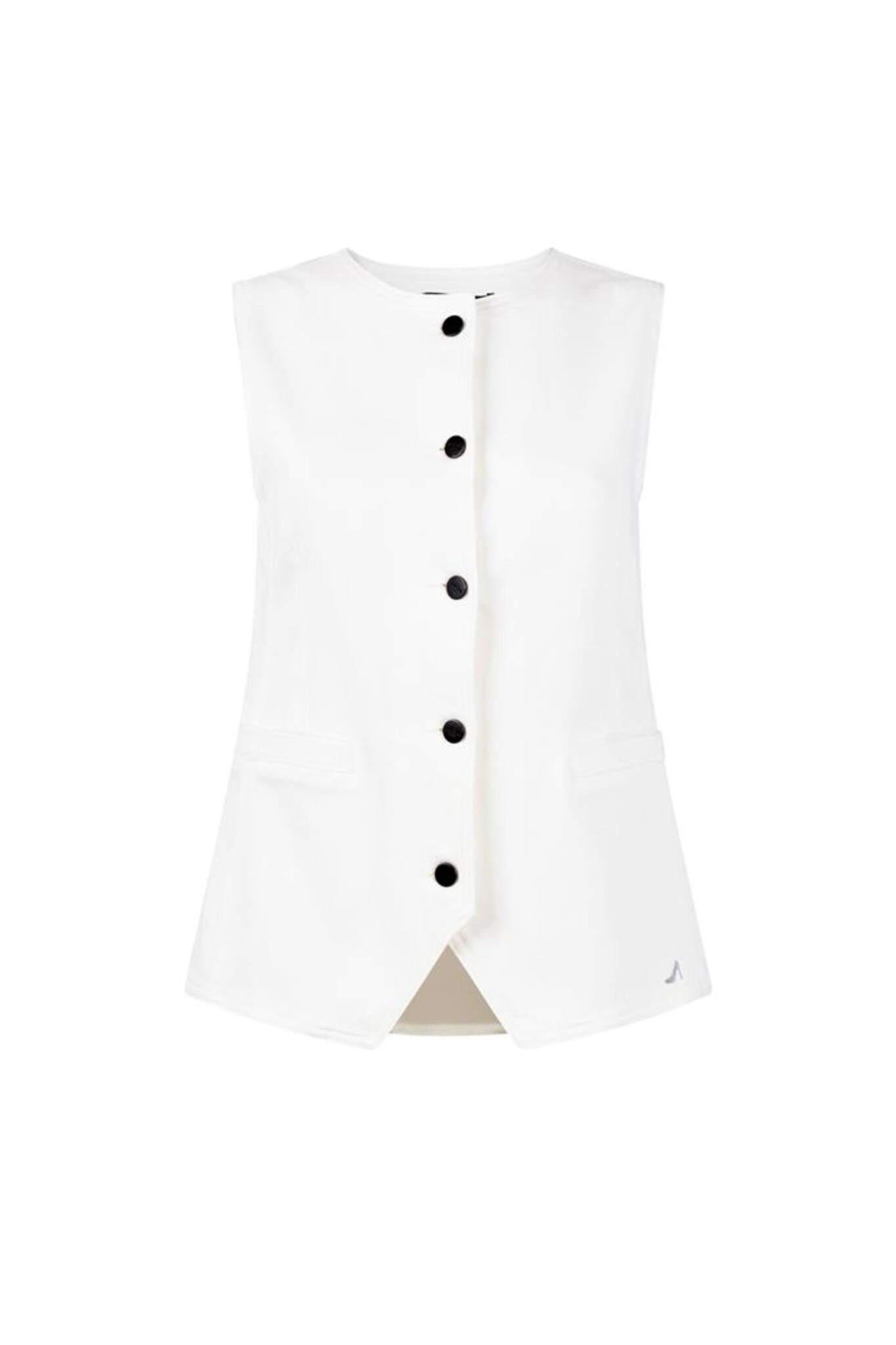 De Jansen Amsterdam Madou Gilet Denim in Off White is een stijlvol, mouwloos gilet met een minimalistisch ontwerp. Dit model heeft een elegante ronde hals en een opvallende knoopsluiting met contrasterende zwarte knopen aan de voorzijde. Het gilet is voorzien van subtiele paspelzakken en een modieuze split aan de onderkant, wat zorgt voor een moderne en gelaagde uitstraling.