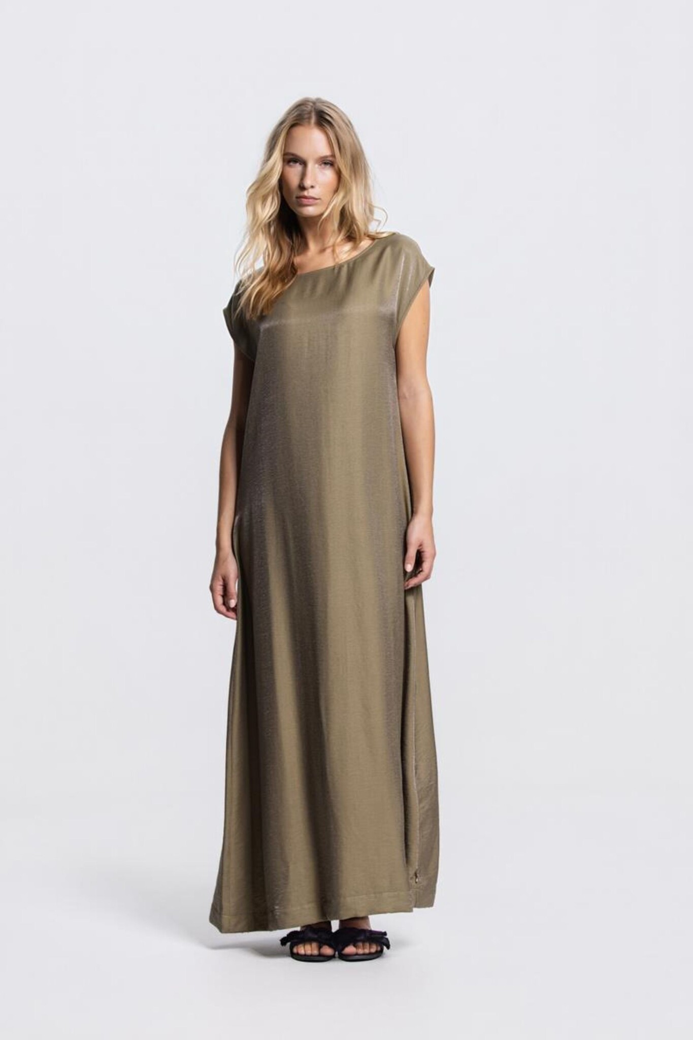 De Jansen Amsterdam Paula Jurk in Army is een stijlvolle, mouwloze maxi-jurk in een warme olijfgroene tint. Dit model heeft een elegante boothals en een rechtvallend silhouet dat soepel langs het lichaam valt. De jurk is vervaardigd uit een kwalitatieve stof met een subtiele glans, wat zorgt voor een minimalistische maar luxueuze uitstraling die zowel overdag als 's avonds gedragen kan worden.