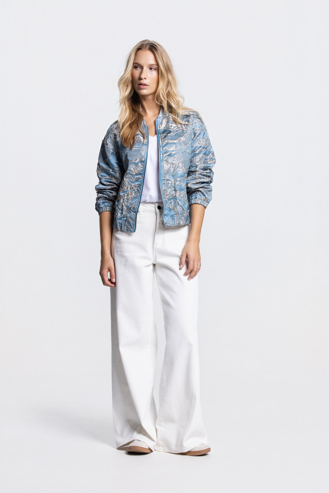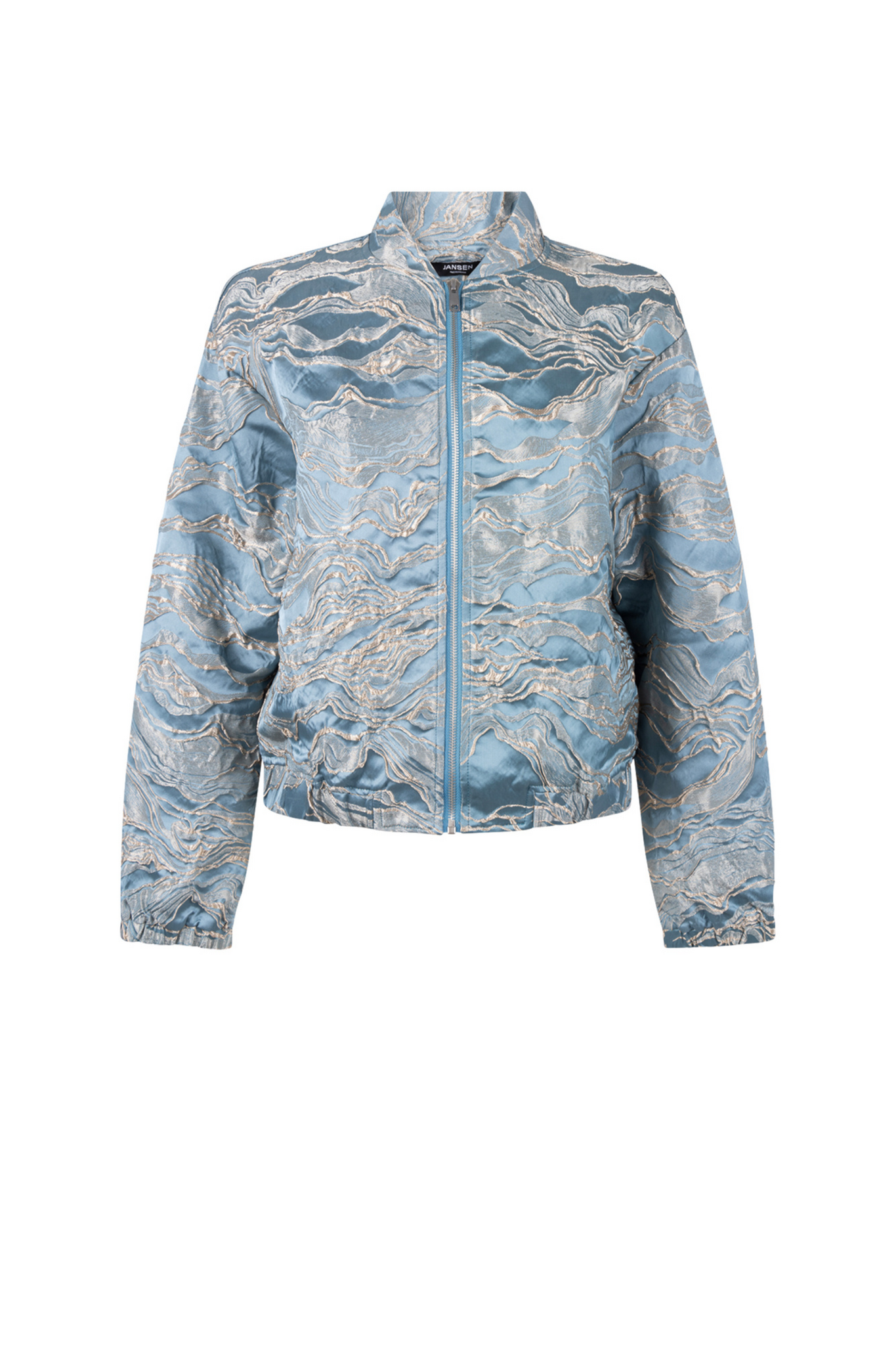 Het Qwen BomberJack van Jansen Amsterdam is een stijlvolle jas in Aquamarijn met lange mouwen en een ritssluiting aan de voorkant. Het model heeft gouden designaccenten, steekzakken en een subtiele boord bij de halslijn, wat zorgt voor een verfijnde en moderne look. Perfect voor zowel casual als nette outfits.